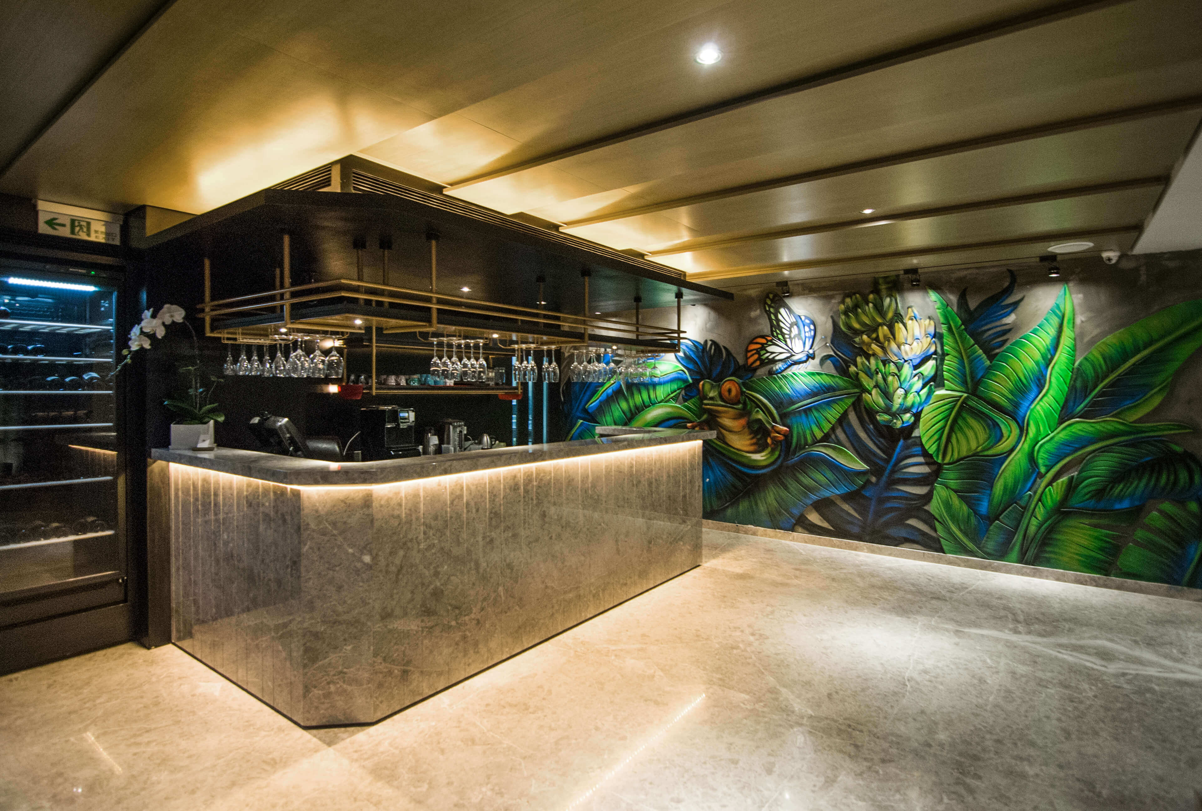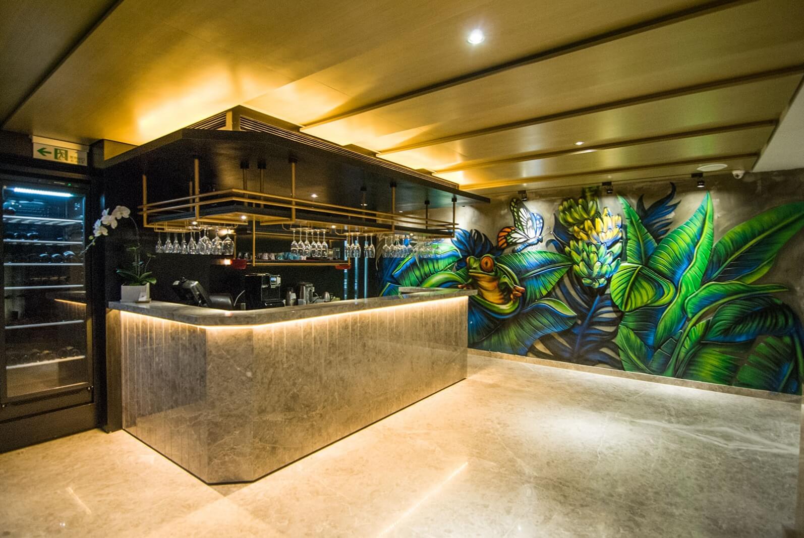 經過謎樣般的前導,門後即為一樓寬敞的空間。此空間結合紅酒櫃、吧台,與色彩濃烈的「台灣壁畫」,讓消費者在飲用酒水的同時,可以感受餐廳的不同樣貌。
