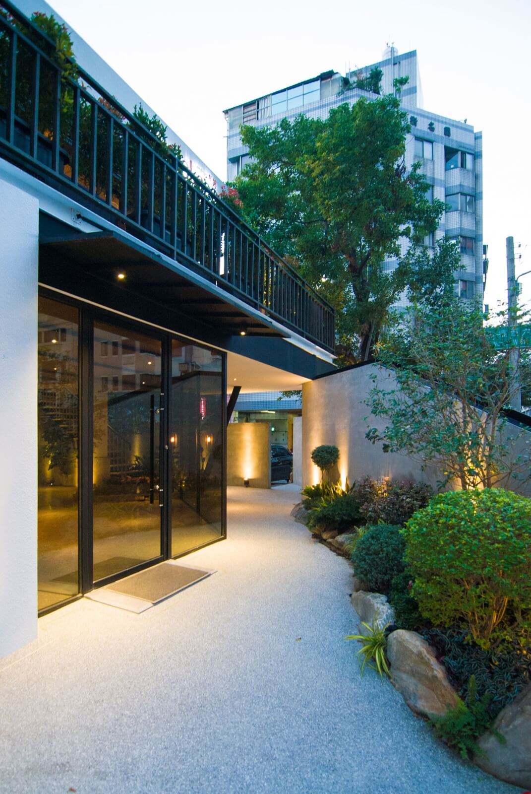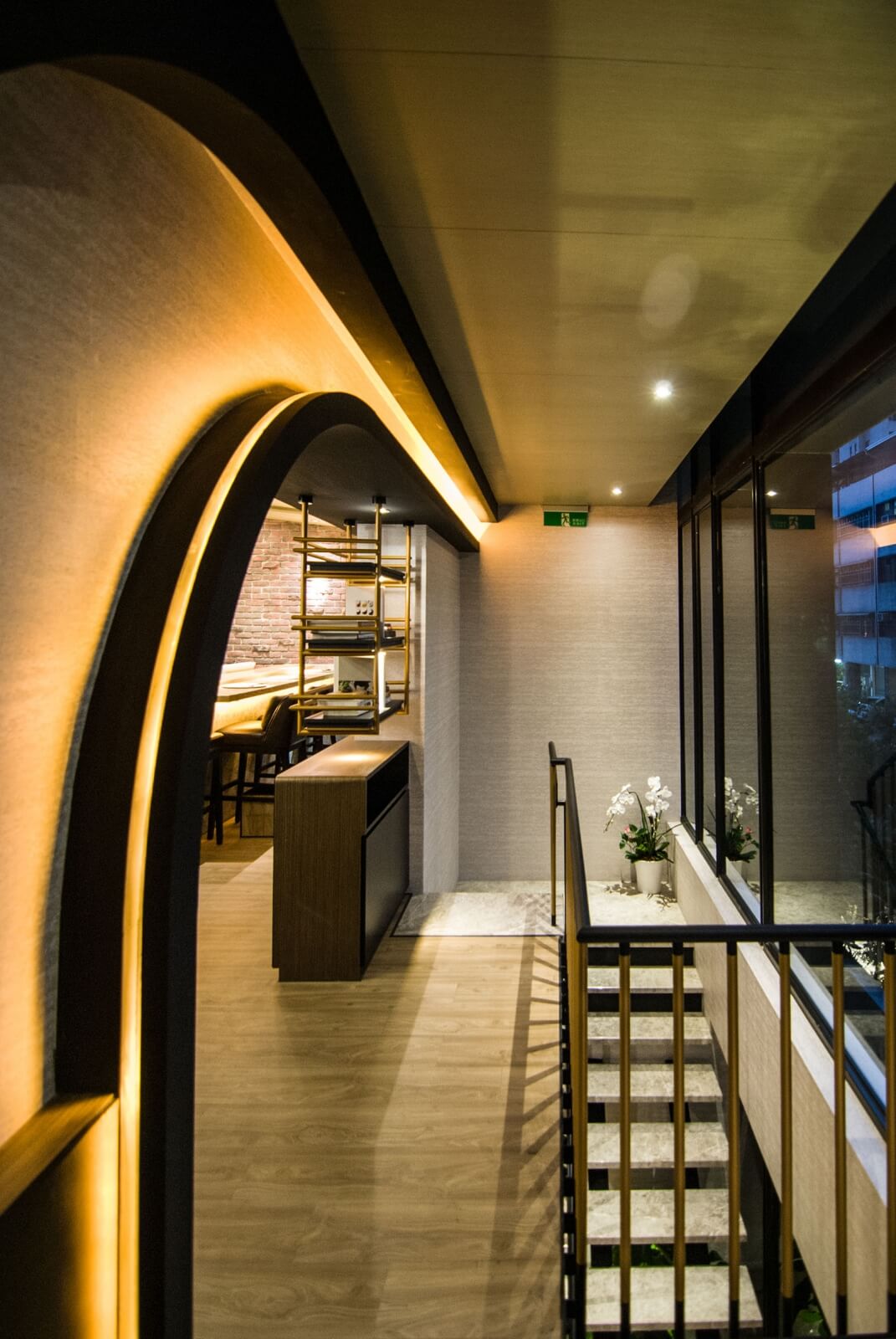 接著,往二樓的樓梯,我們改向至側邊的大開窗,使客人在行走的過程中,可以看到外面的庭園。這樣的效果也使原本不寬的樓梯看起來較為寬敞。