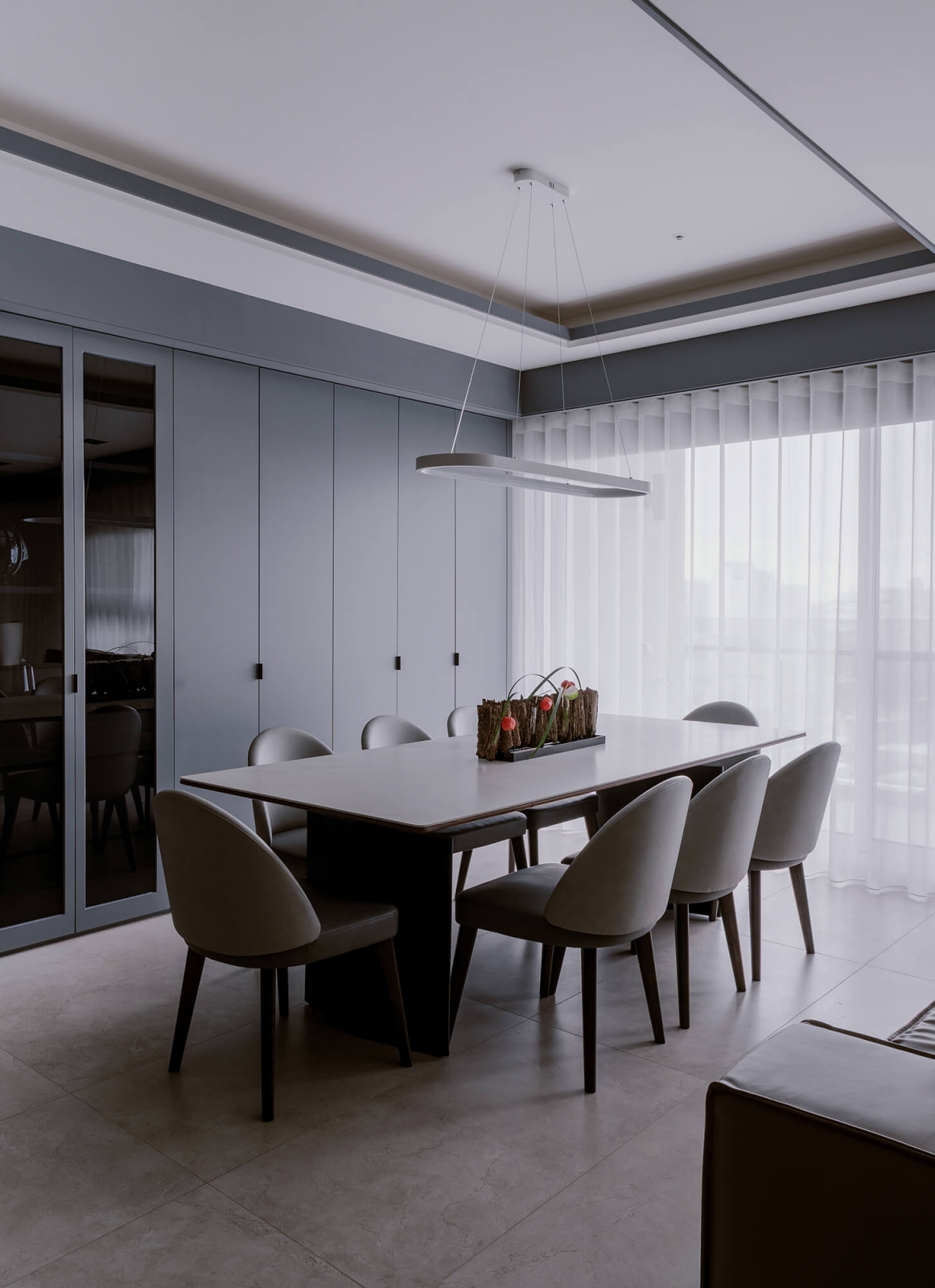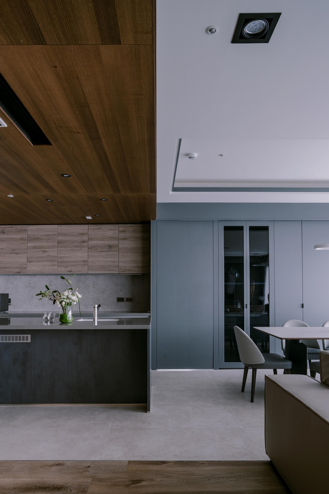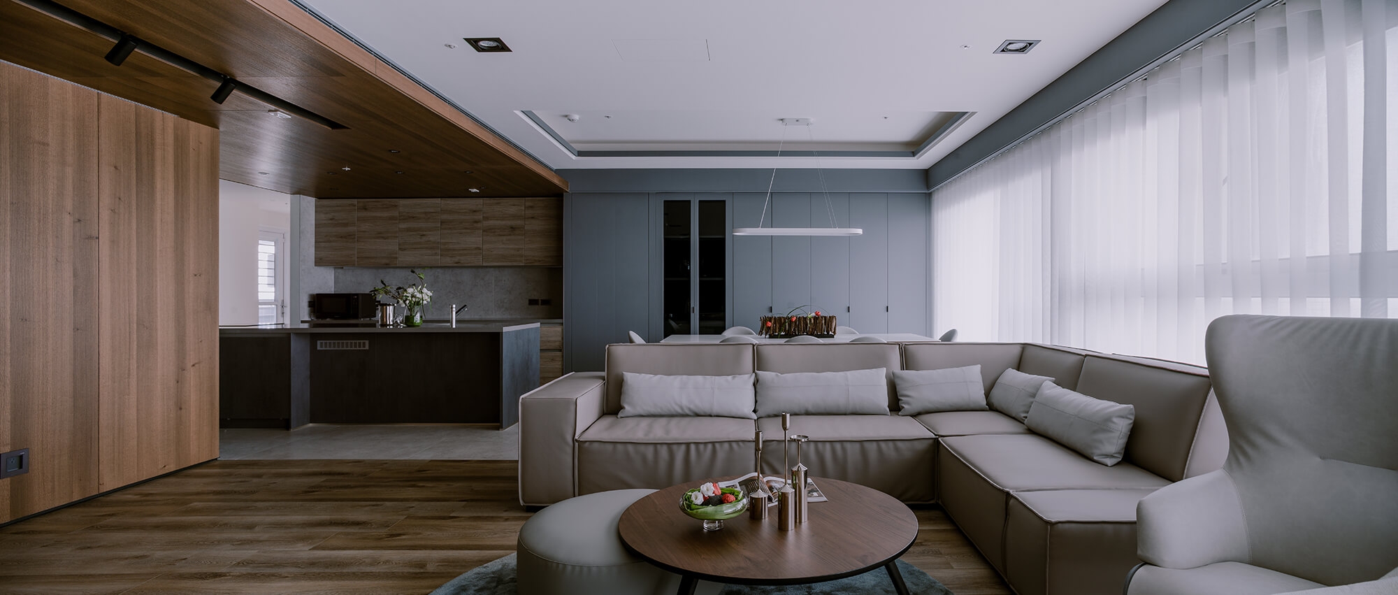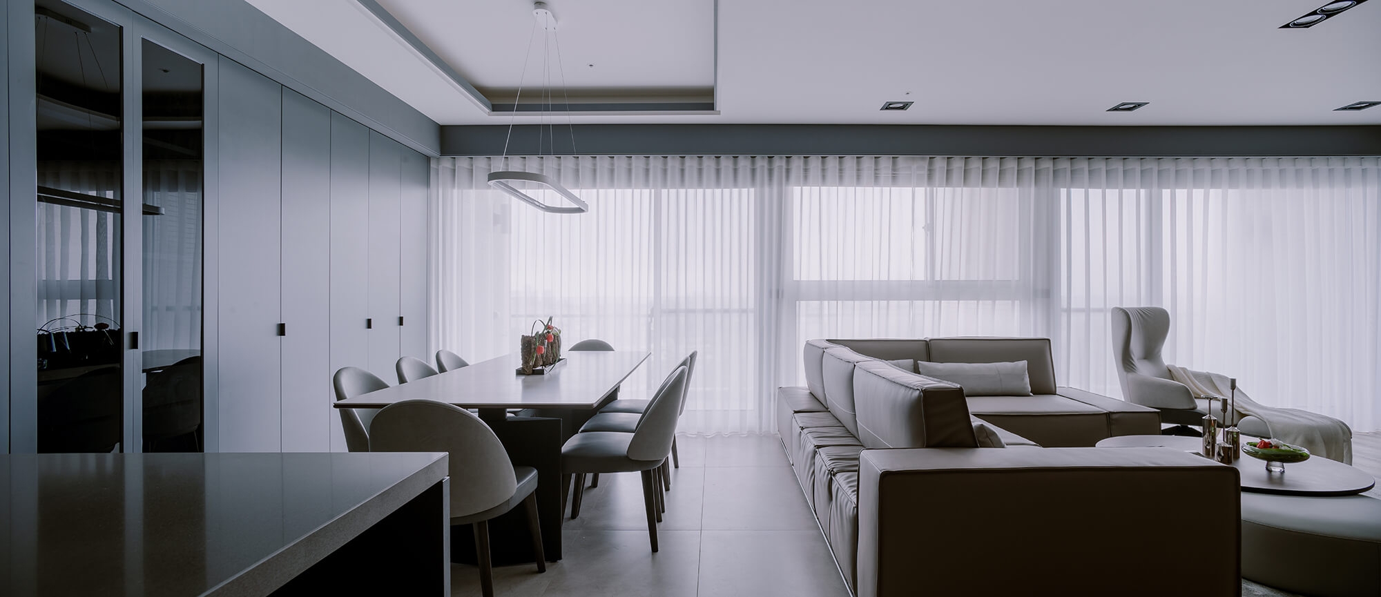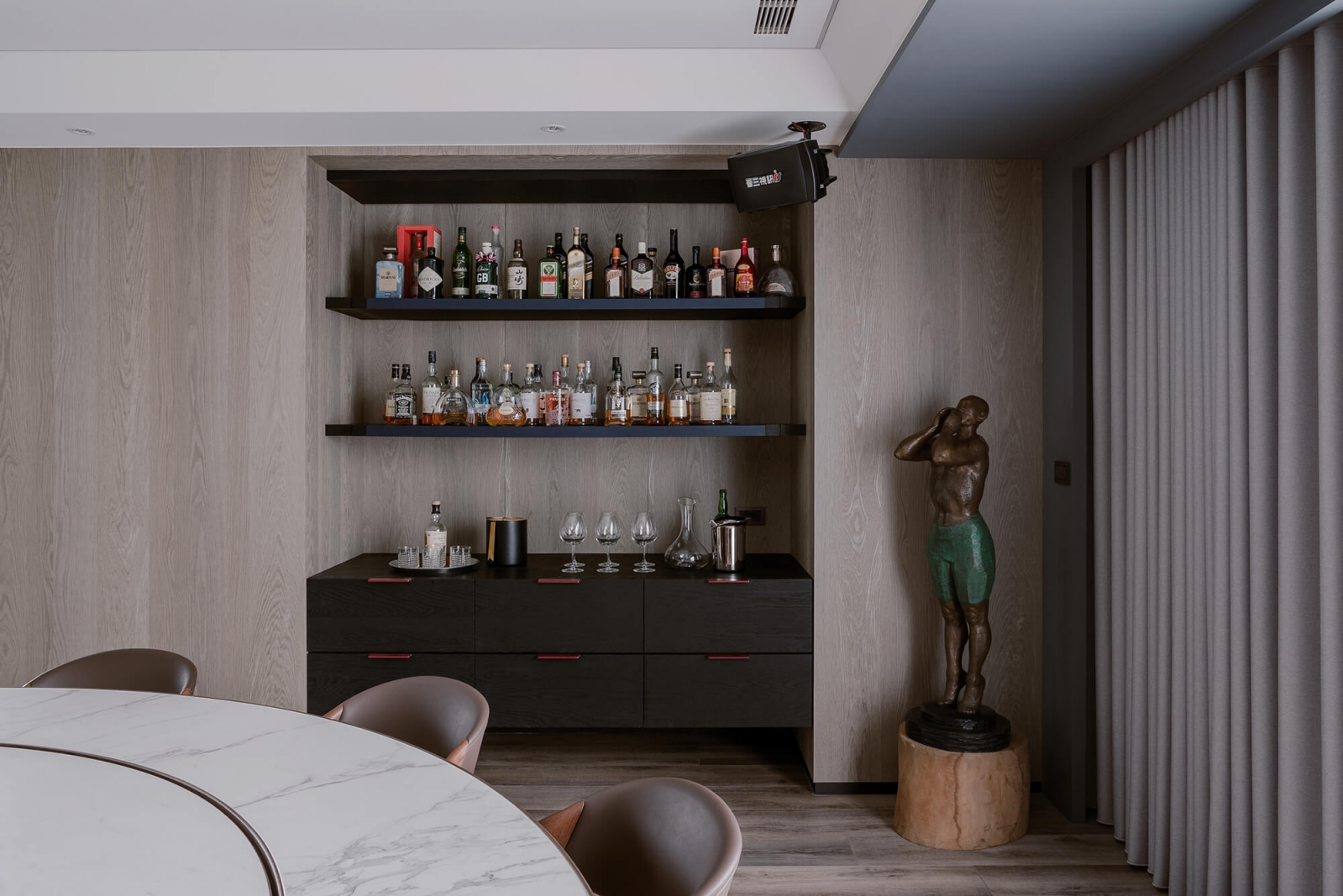 整體空間走低調、現代的設計風格,涵蓋著不同種類的材質,卻不偏離四種空間色彩。結合著不同材質與色彩的組合,不僅呈現出立體、俐落度,更著實增添了典雅寫意的氛圍。是個適合招待朋友聚會,也可以是溫暖的住宅空間。