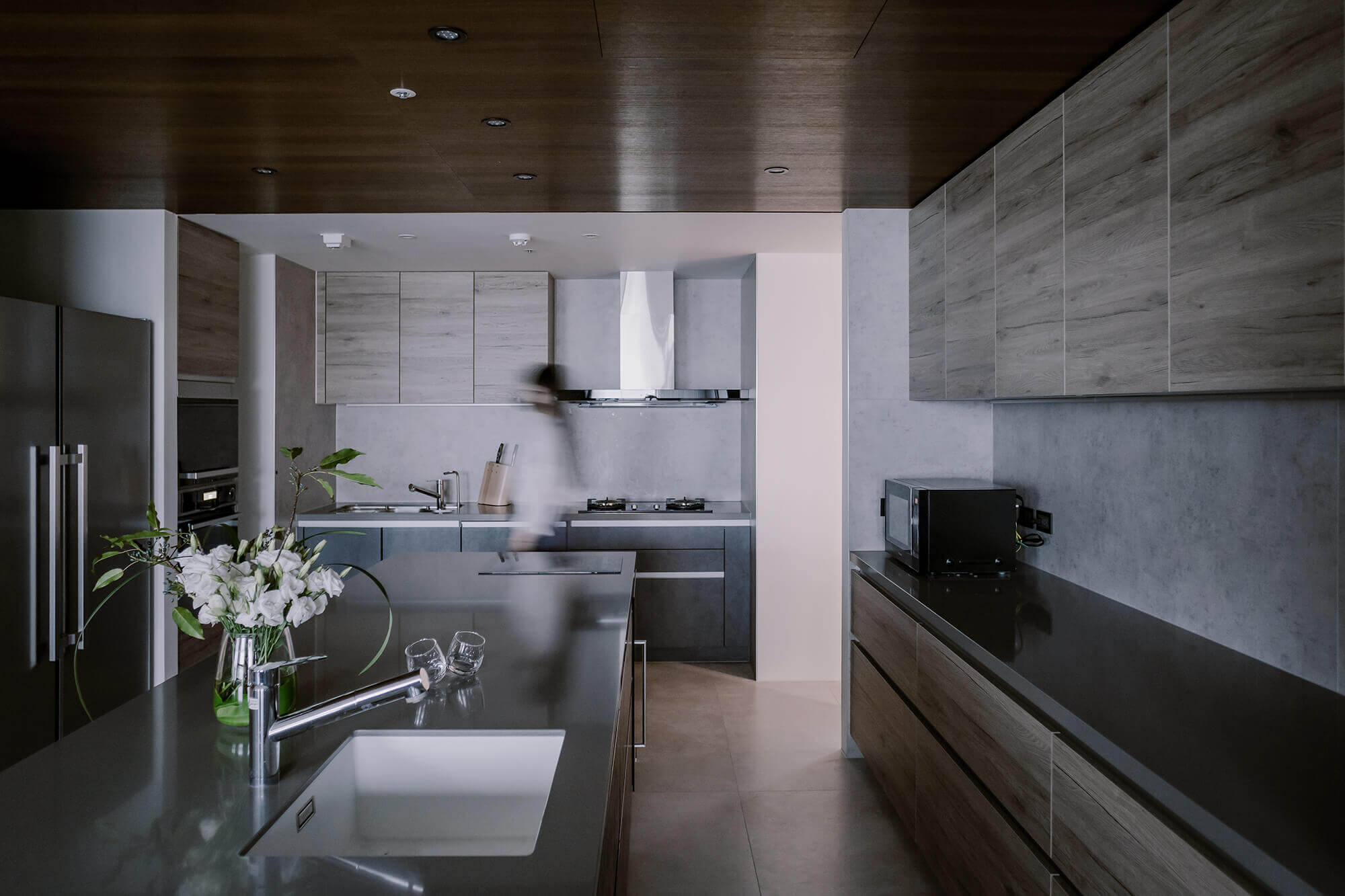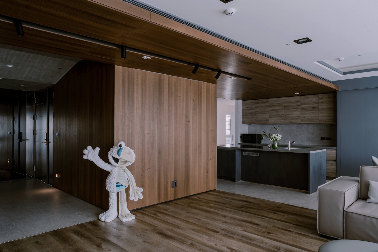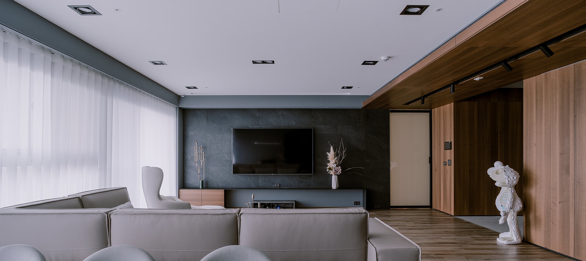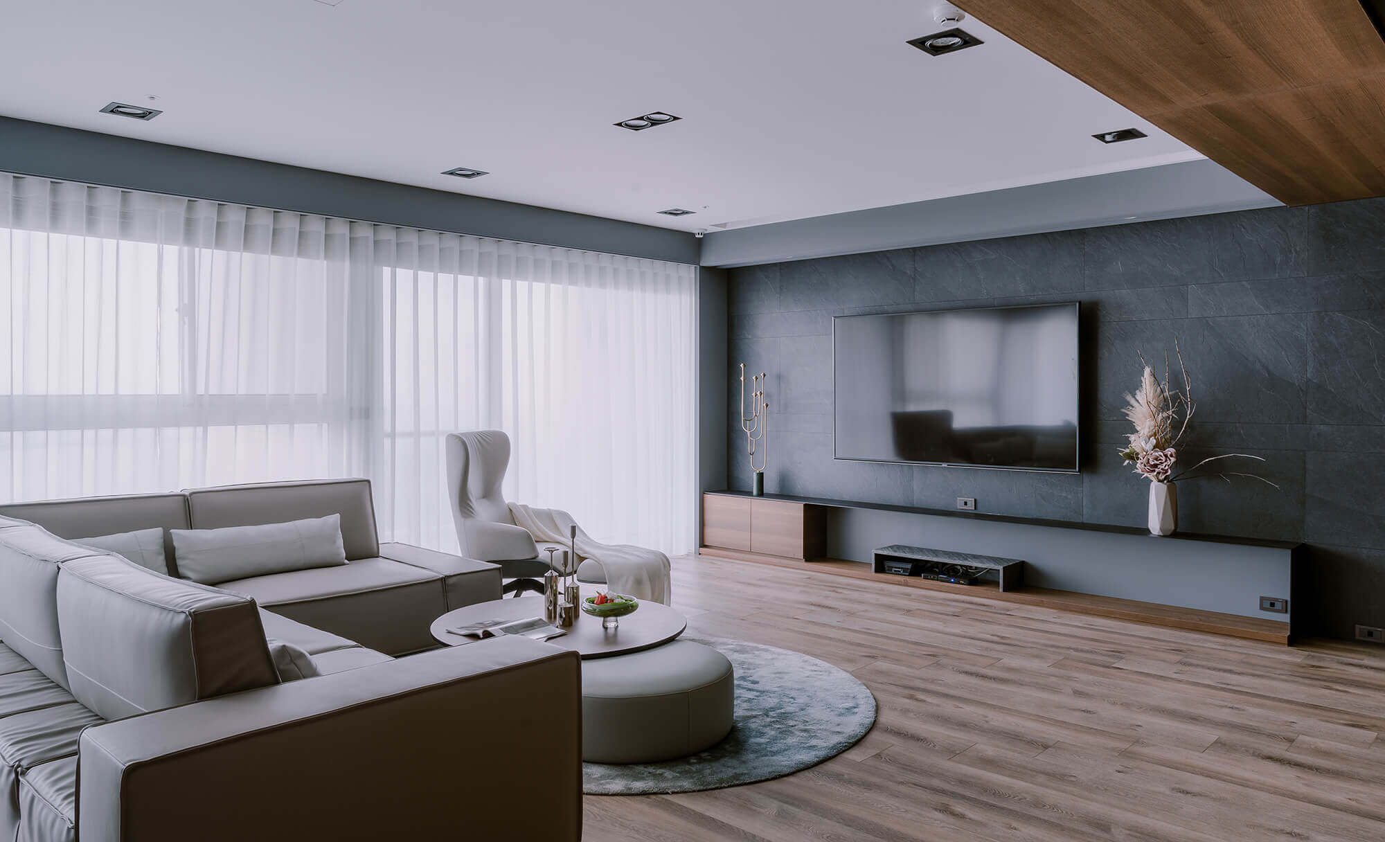 整體空間走低調、現代的設計風格,涵蓋著不同種類的材質,卻不偏離四種空間色彩。結合著不同材質與色彩的組合,不僅呈現出立體、俐落度,更著實增添了典雅寫意的氛圍。是個適合招待朋友聚會,也可以是溫暖的住宅空間。