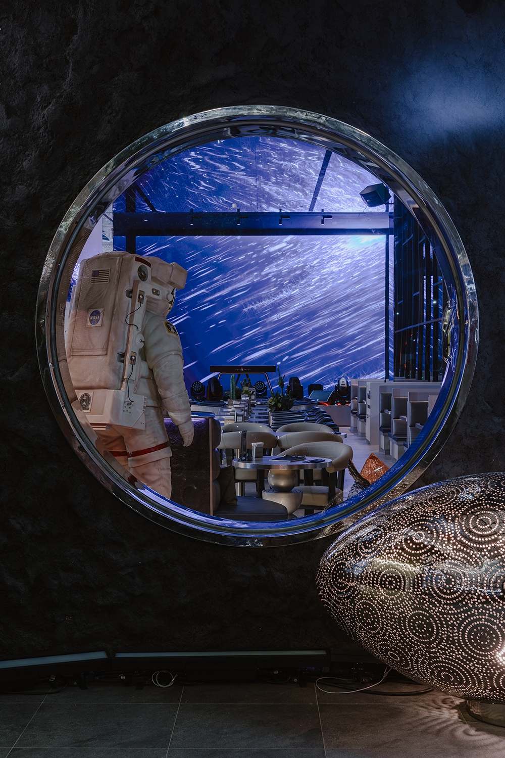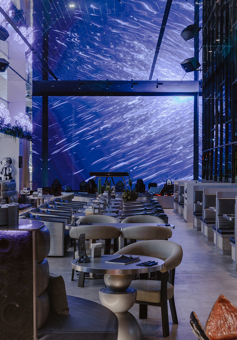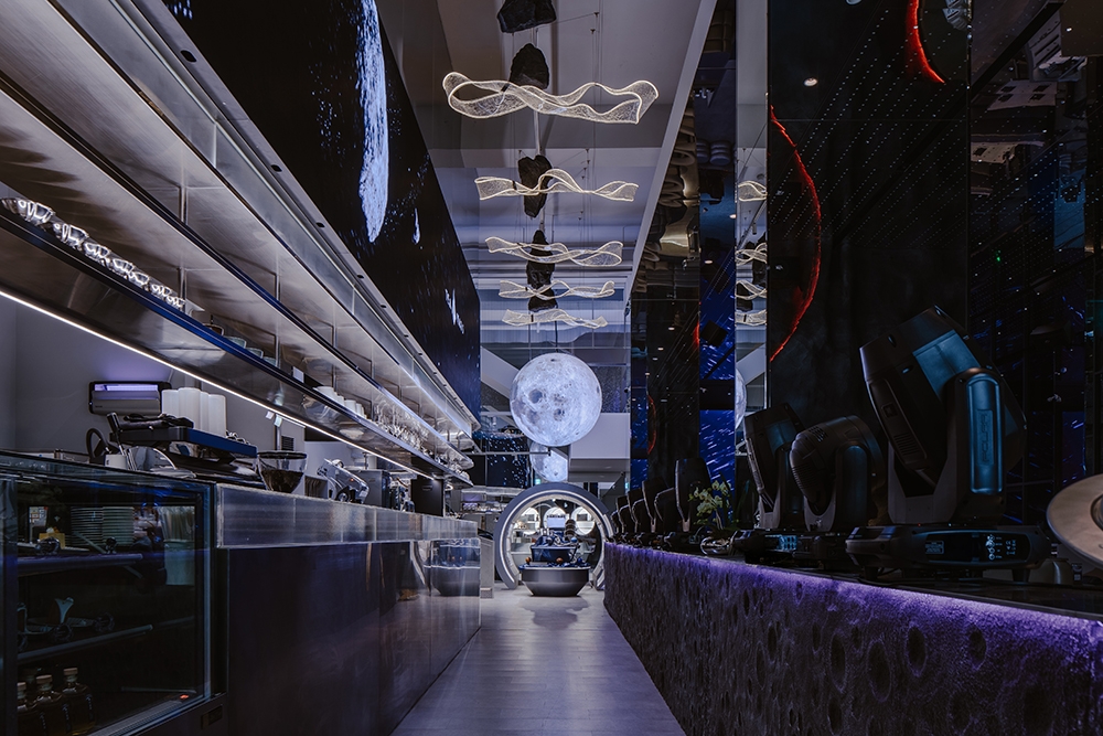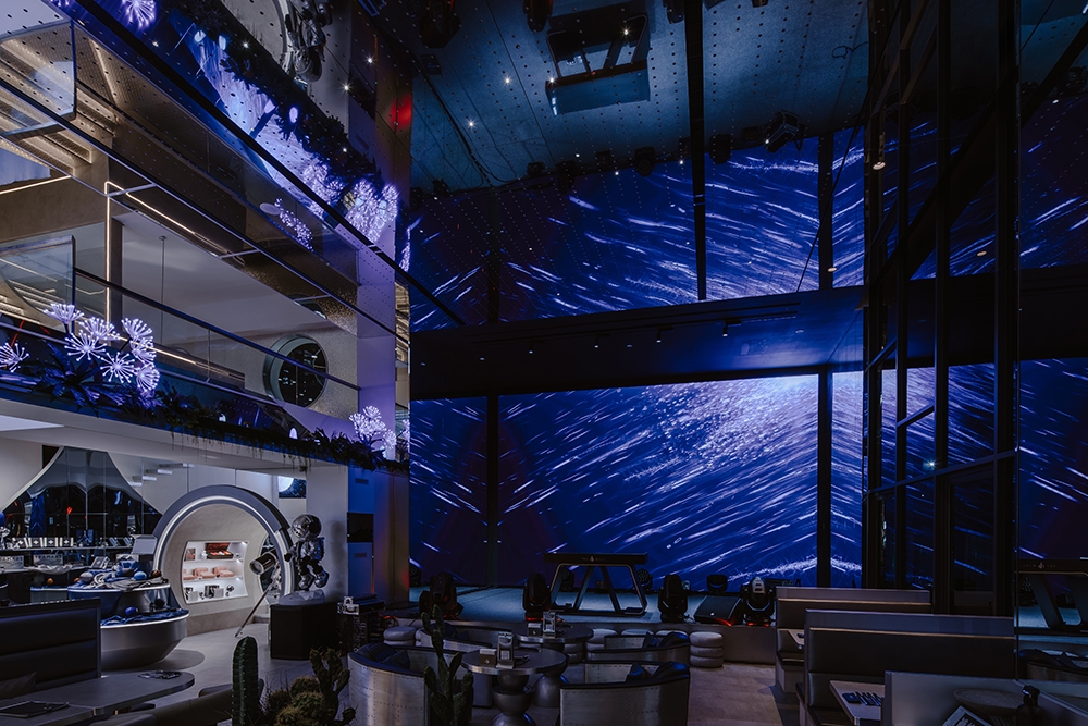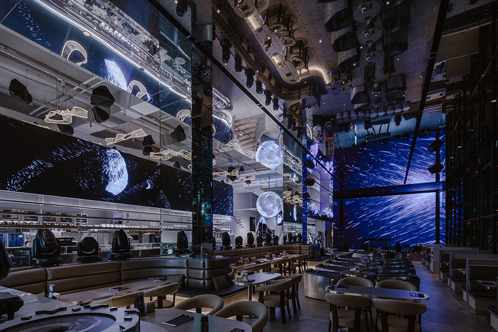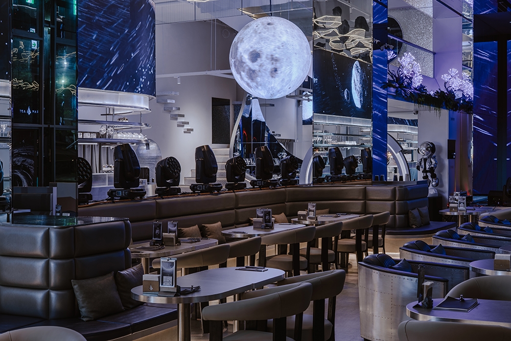 推開門,你會先被吧台上方大面弧形LED牆吸引,視線順著延伸,頂部有顆粒懸浮的LED星球。天花板是星星意象,燈光打開你的視覺感官,DJ台搭配大面積LED螢幕,音樂與動畫同步,釋放能量