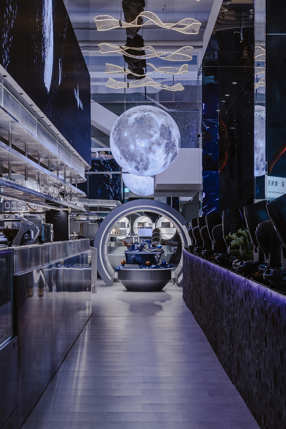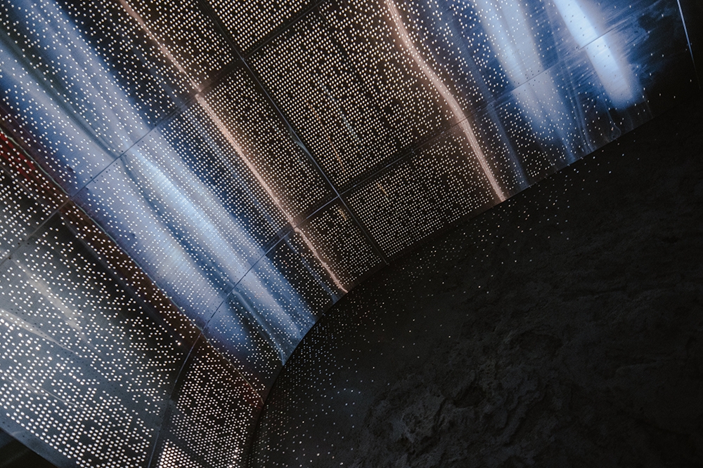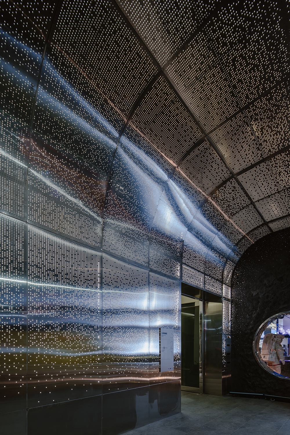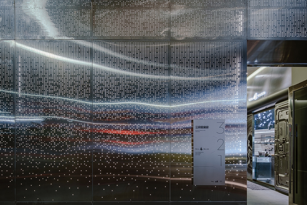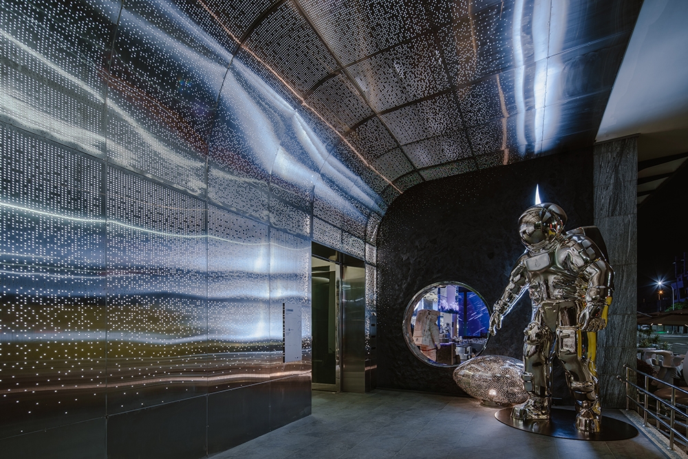 由一樓外放、動態、高刺激的感官狀態,藉由階梯逐步轉換至二樓靜謐、沉澱狀態的通道,視覺語彙由繁星、科技感轉為收斂
