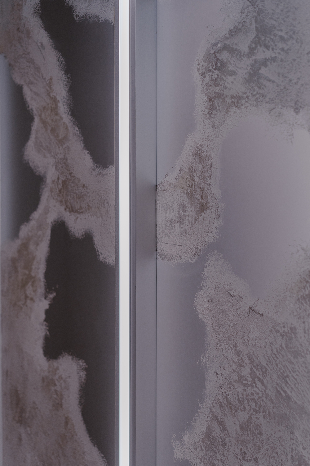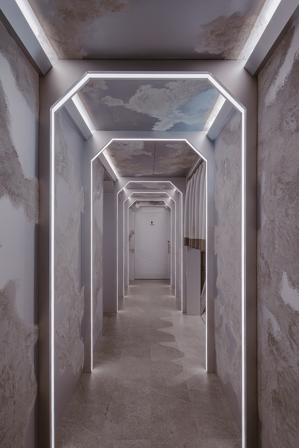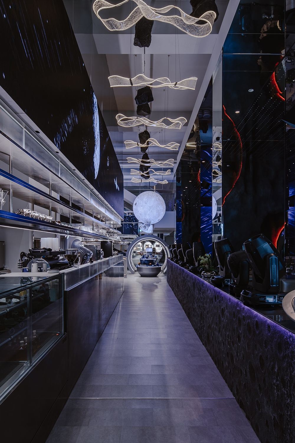 由一樓外放、動態、高刺激的感官狀態,藉由階梯逐步轉換至二樓靜謐、沉澱狀態的通道,視覺語彙由繁星、科技感轉為收斂