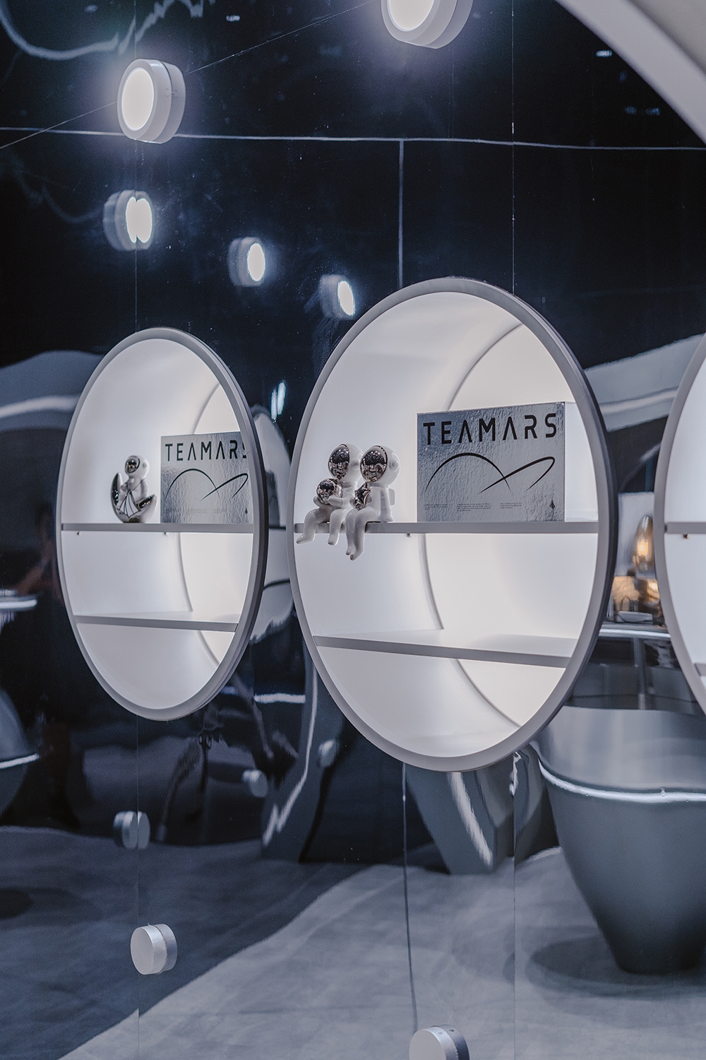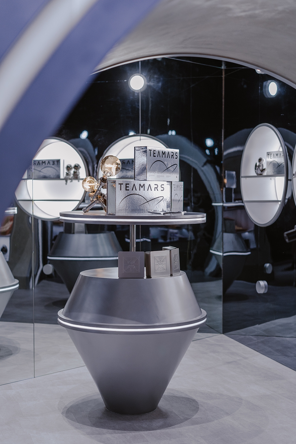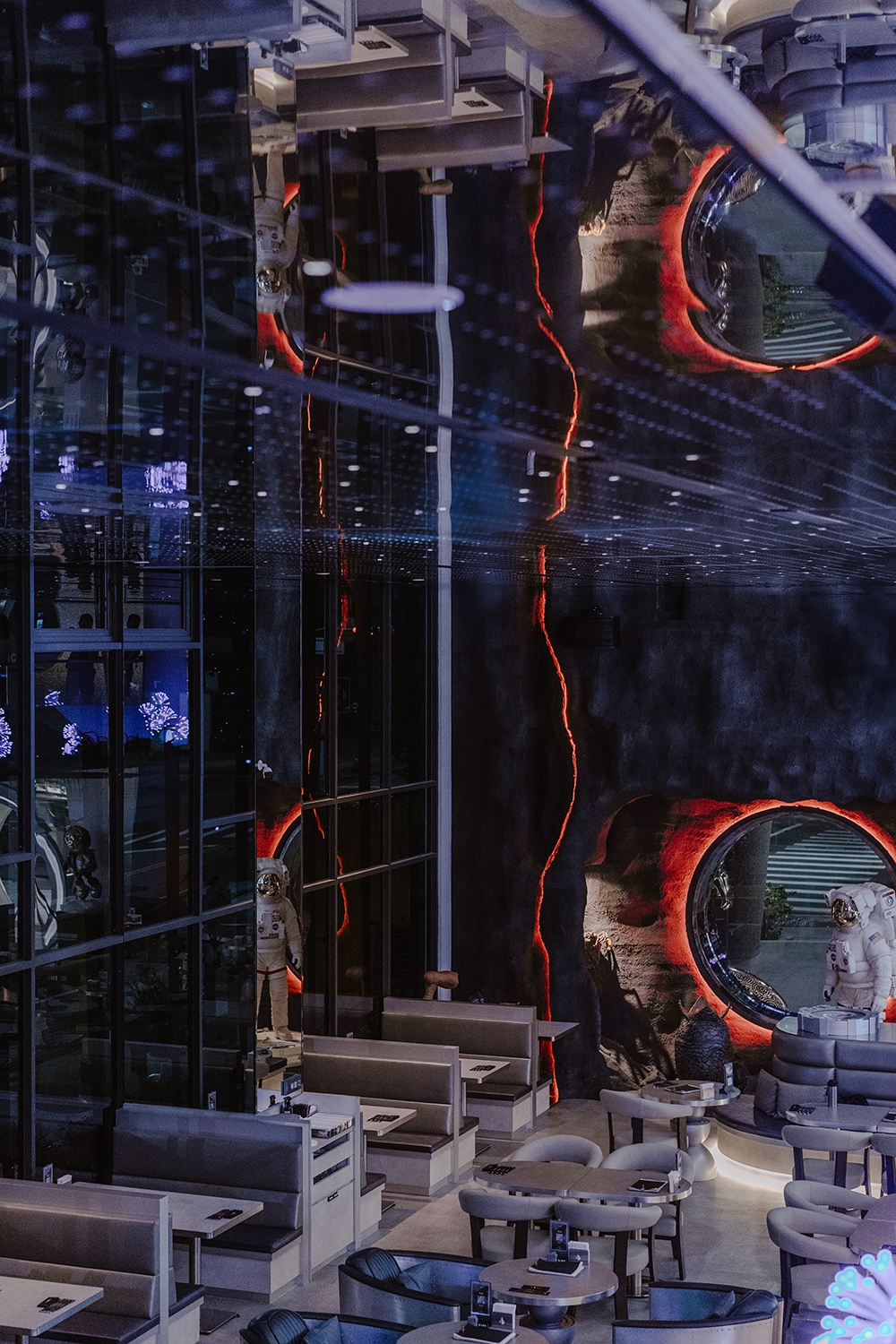 鏡面塑鋁板、金屬、低彩度色調,讓空間尺被拉大,四根巨大的柱體也被弱化,你會覺得自己走進了一個無邊際的感官場域