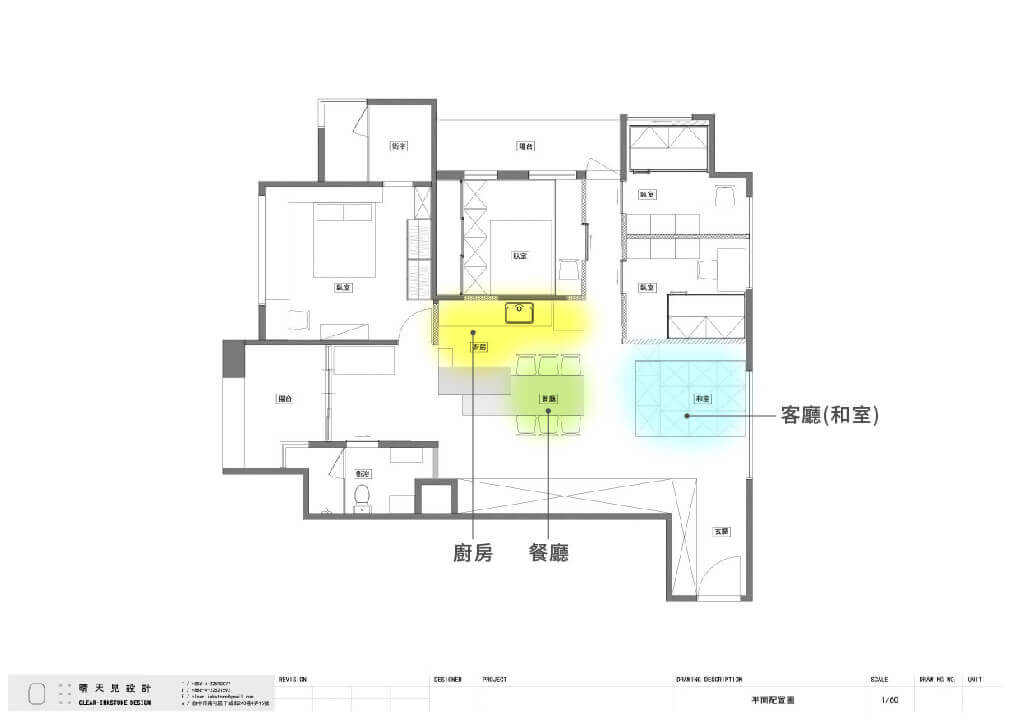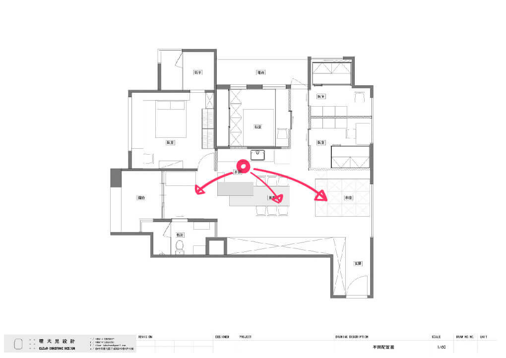 廚房、餐廳、客廳(和室)之間的關係,將廚房拉出來到外區,設定一個中島,並將餐桌連在中島的側邊!而廚房本來的位置讓給臥室,並且改變走道方向,將三個空間:客廳、餐廳、廚房完全連在一起!
