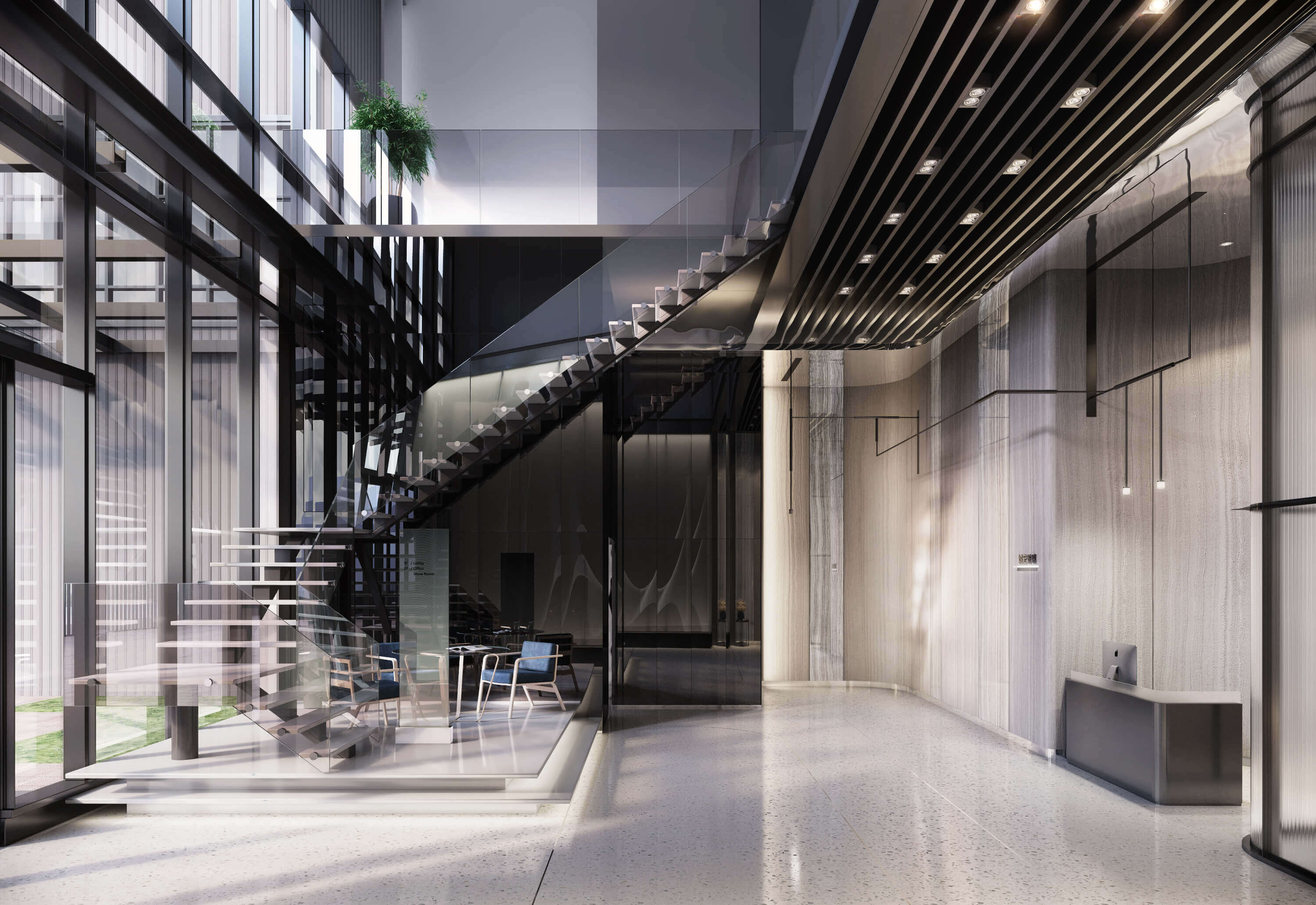 以鐵件結構加上白色石材踏階的樓梯,側面是清玻璃扶手,雖然玻璃給人的印象通常脆弱易碎,但這裡的扶手處,採用高強度玻璃,除了呈現透光的質感,也保持一定的安全性。而樓梯的背牆一直延伸到梯廳區域,我們使用大面積的黑鏡,反射對面的設計主牆,讓空間因為相互反射,增添玻璃的更多變化,增加空間感。
