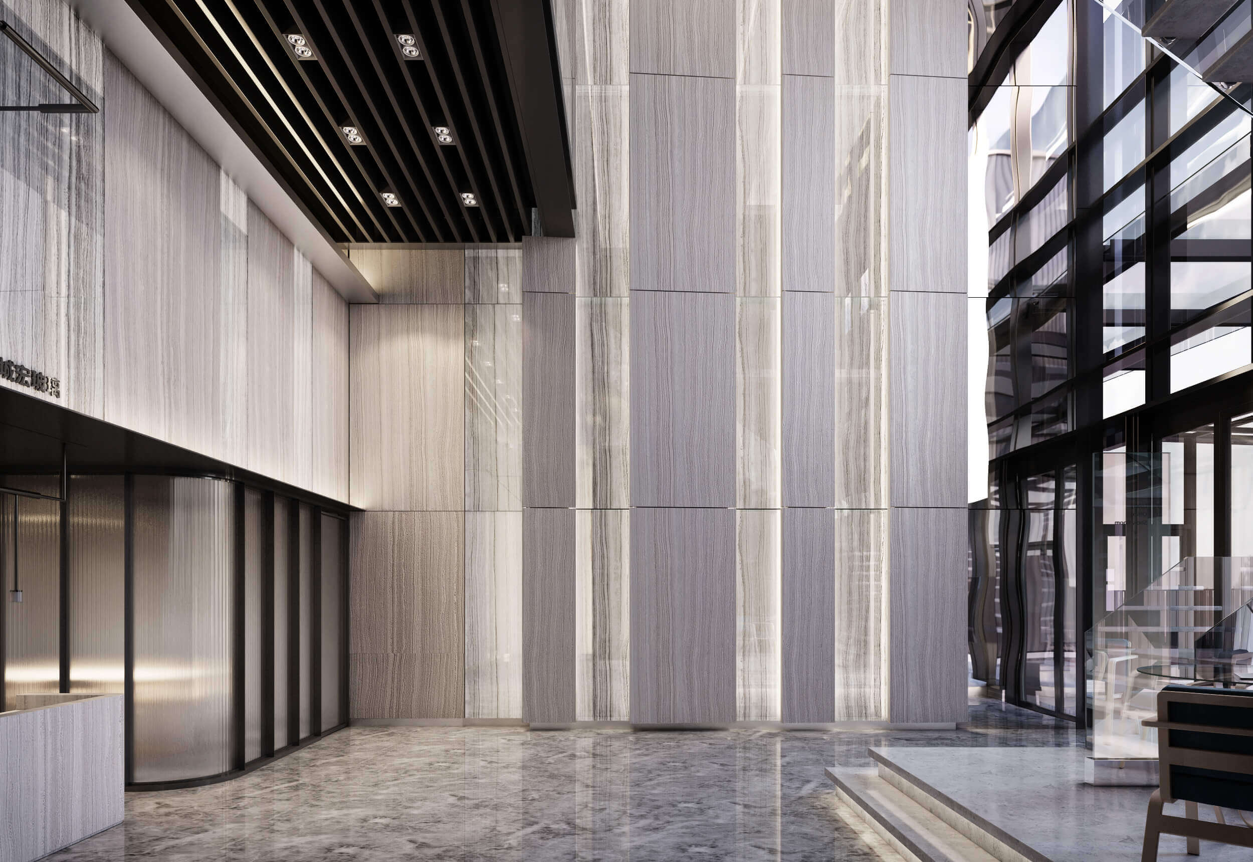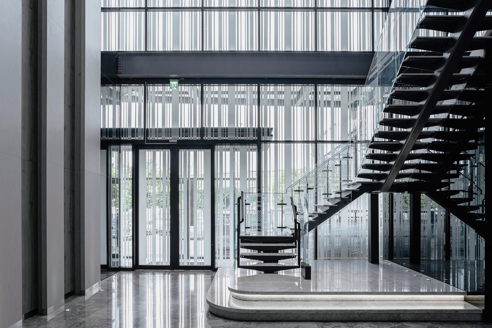 面對入口處的左側為梯廳區及往二樓的樓梯。梯廳區的牆面使用木紋印刷玻璃與木皮的垂直分割,整體上帶有木紋質感的玻璃與真實木皮交錯,唯有近距離接觸,才能分辨出真正的材質。