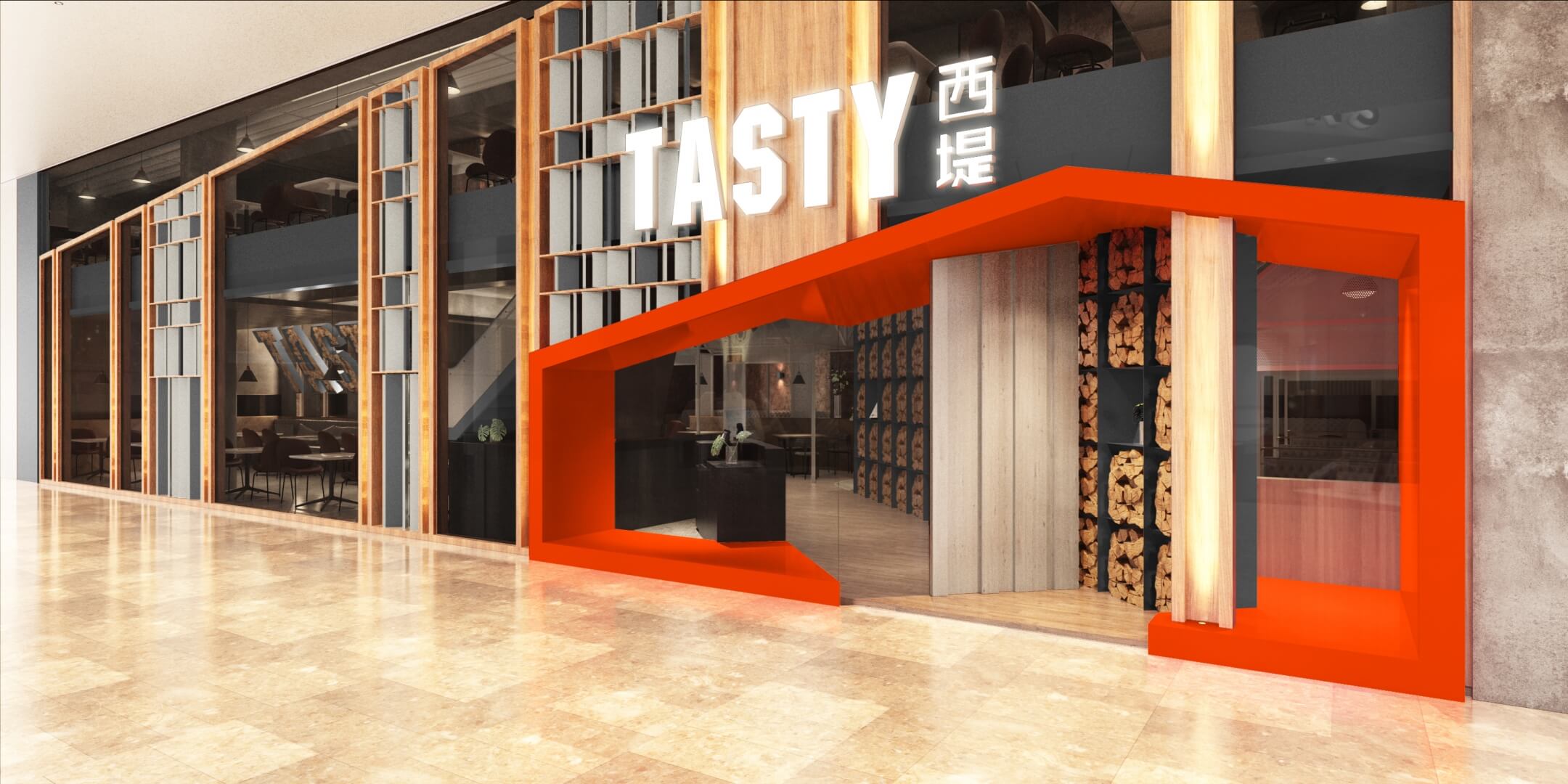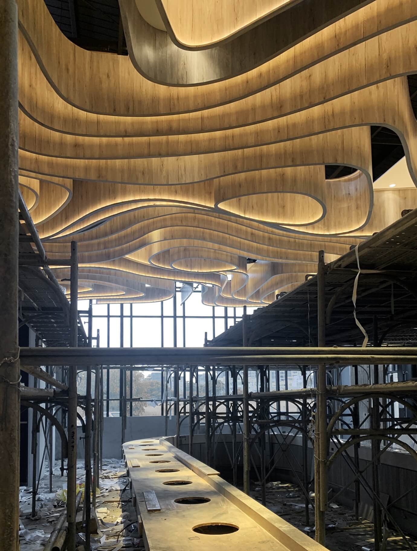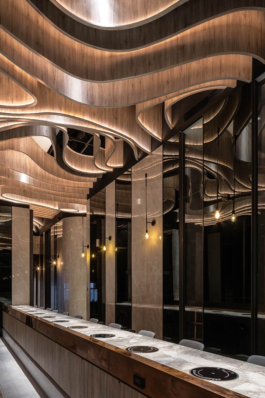 出入口的右側主牆,使用大片木紋挑高的手法,當客人在此