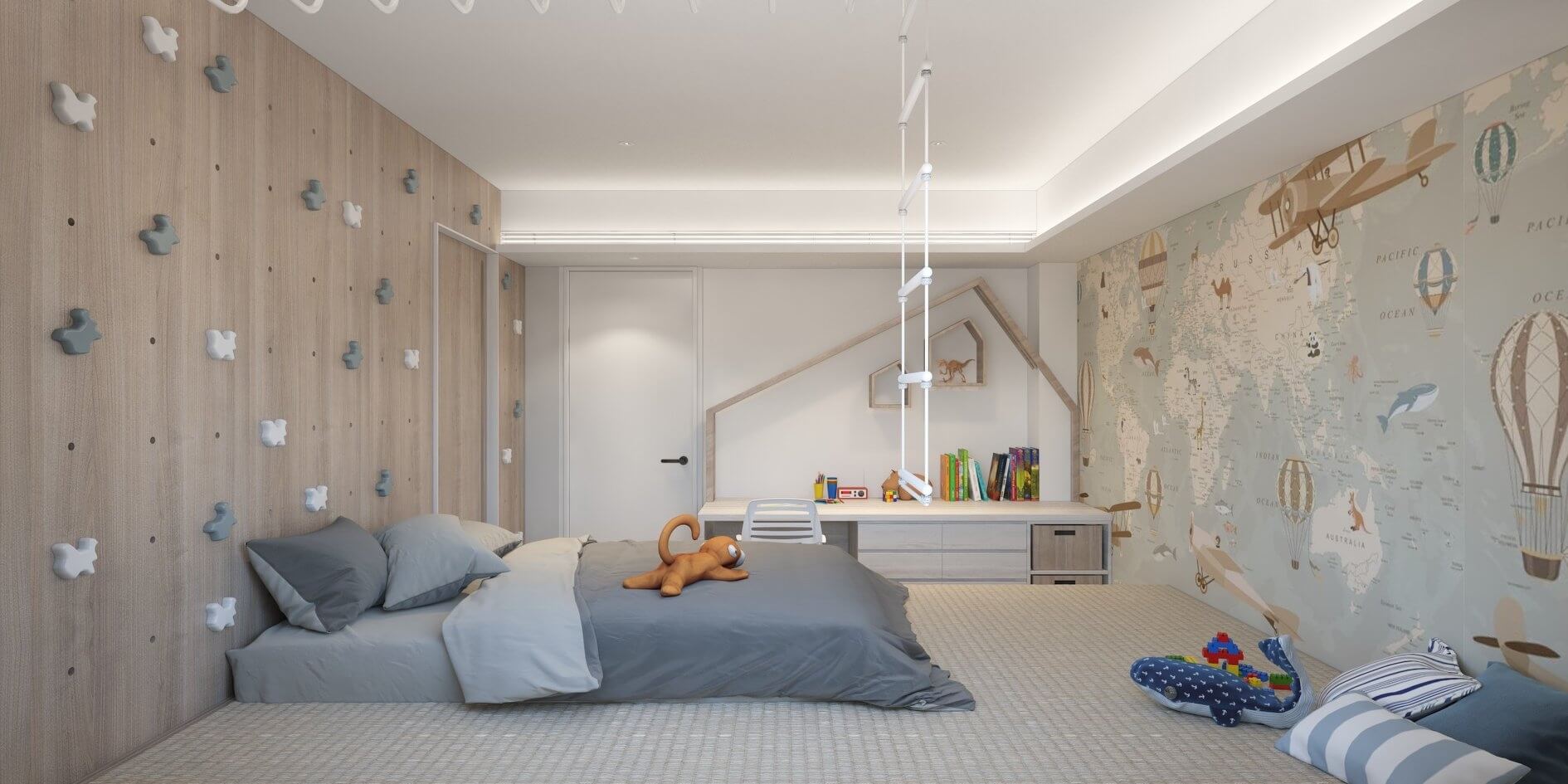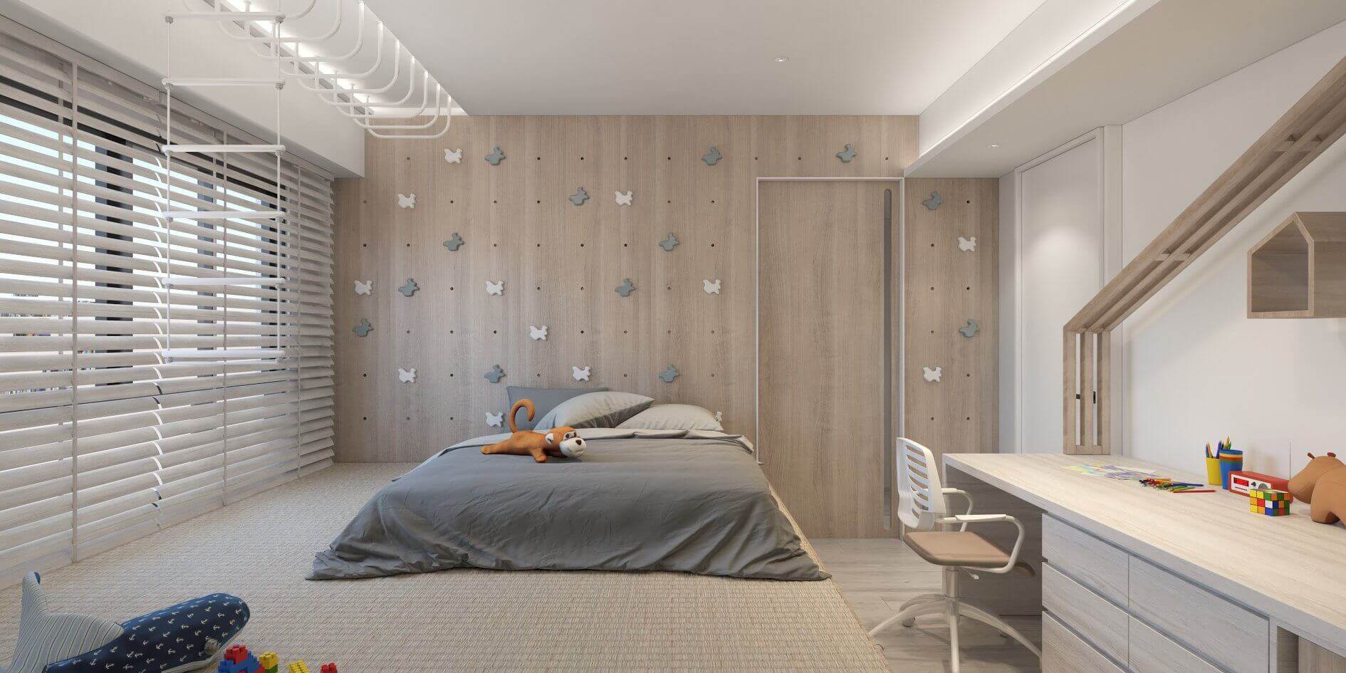 二樓的男孩房,是冒險王會嚮往的夢幻房間。我們裝設可自行移動攀岩的洞洞板牆面,因這面牆有加強承重加厚板材,從床頭爬上去之後可以沿著單槓從繩索盪下來,單槓部分直接鎖到原始 RC 天花板上,穩固的結構讓小孩玩得開心、父母也放心。