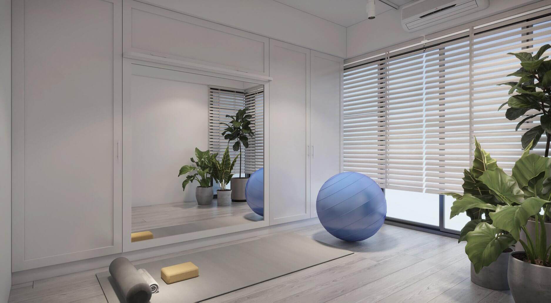 五樓多功能房,可以是客人臨時來作客的客房,或是瑜珈課的活動空間,因此使用活動掀床。當不用床時,床的底部貼了一塊明鏡,收納起來便能作為上課用的鏡子。