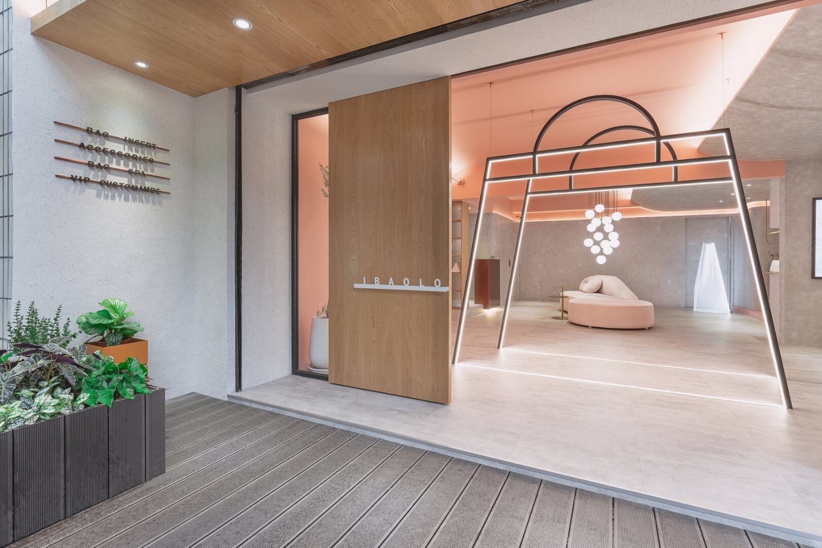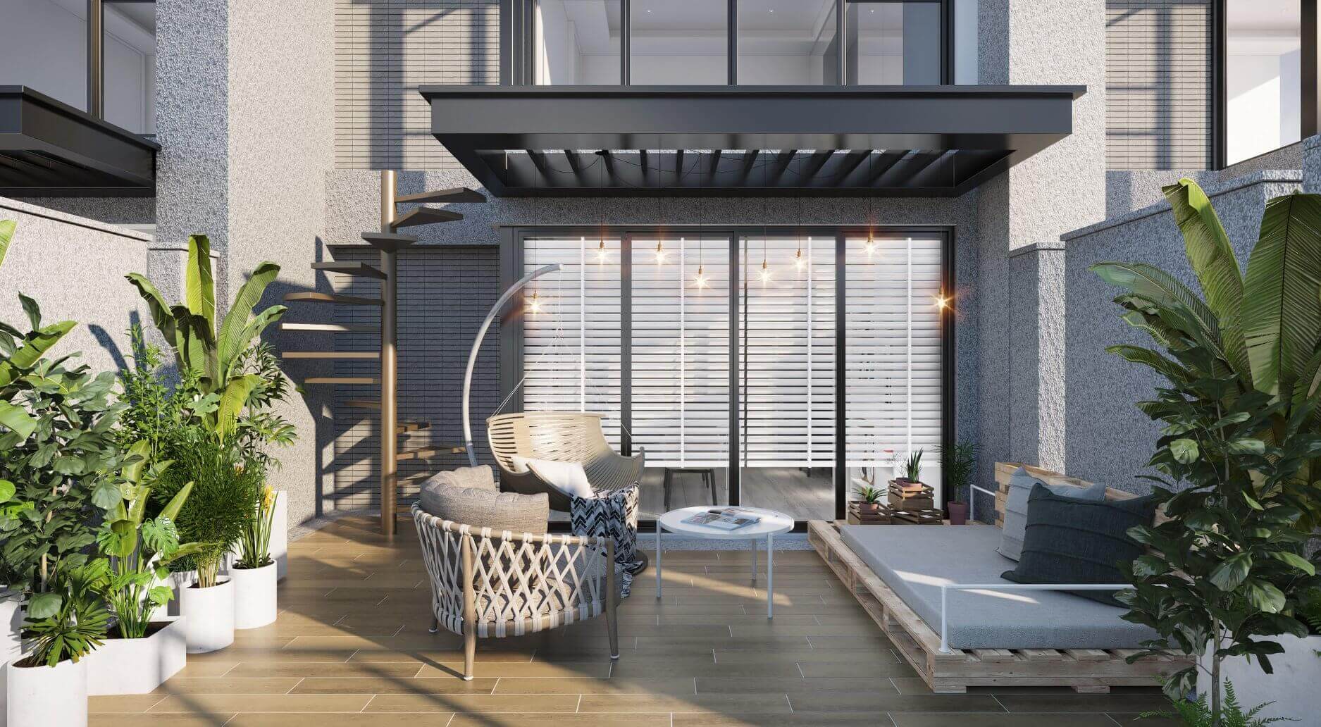此外,四樓的半開放露臺遮雨棚設置藝術掛燈,木棧板上方放置防水軟墊當作沙發,營造戶外休閒的放鬆氛圍。
