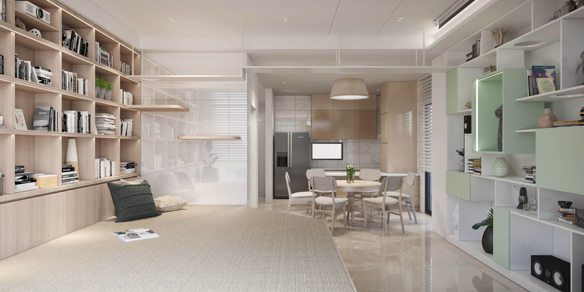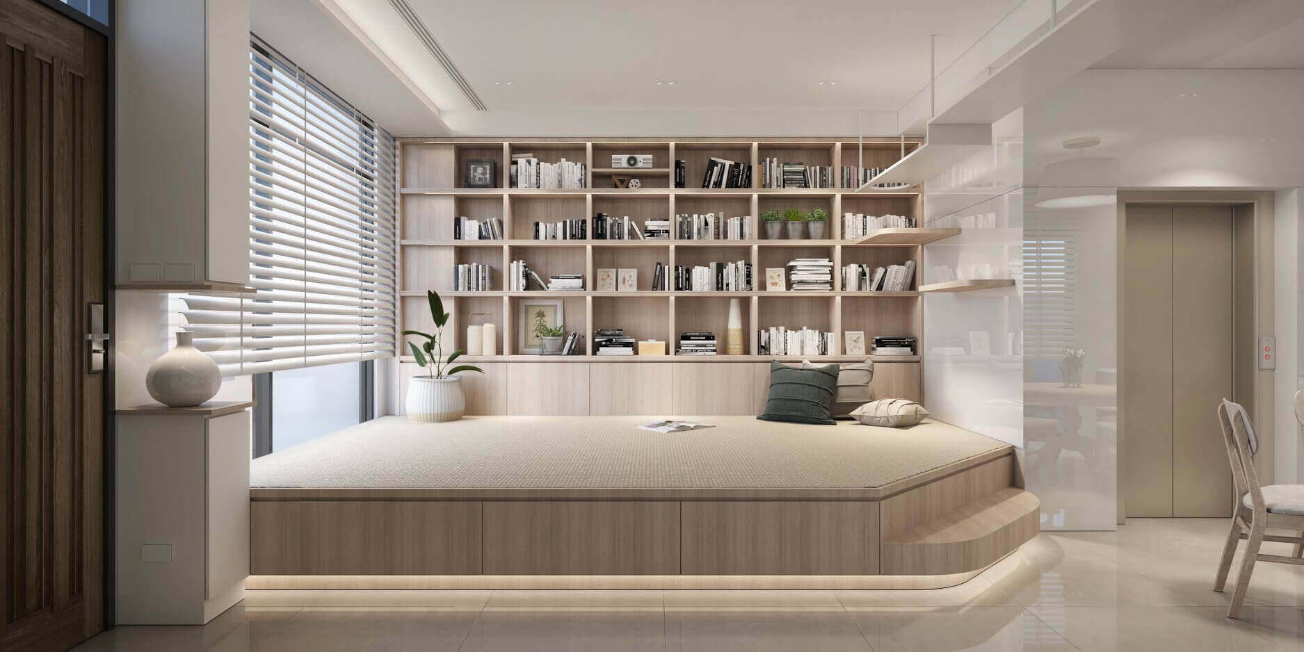 有別於客廳常見的沙發家具,取而代之的是架高的榻榻米,配合業主的觀影與收藏光碟習慣,榻榻米對面的櫃子使用不規則隔層,活用放置的物品。層板之中更設計一些小洞讓業主飼養的貓咪可以在櫃子中穿梭,沿著天花板的貓道,貓咪也能走到對面書櫃再跳下來。榻榻米旁的牆面設置多功能的磁性烤漆玻璃,方便家教老師教學、孩子們塗鴉。