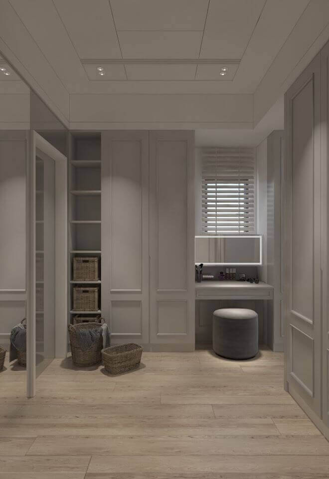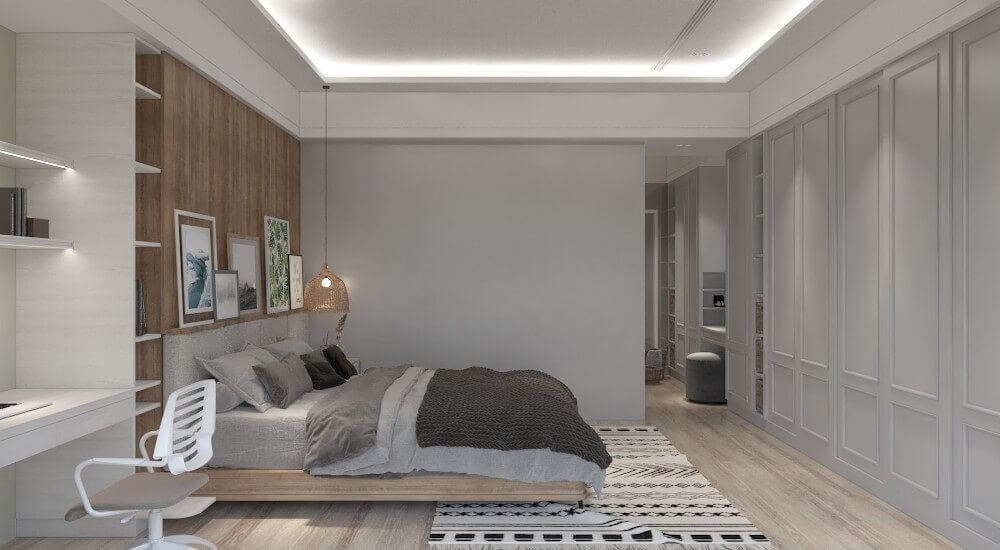 相較於二樓的空間色系,三樓主臥的色調更加沉穩。空間的功能重點,除了收納外,我們特意將熨燙板位置設在房間內的衣櫃裡,如此一來當女主人在做家事時,也能先生一起聊天,增加彼此互動。