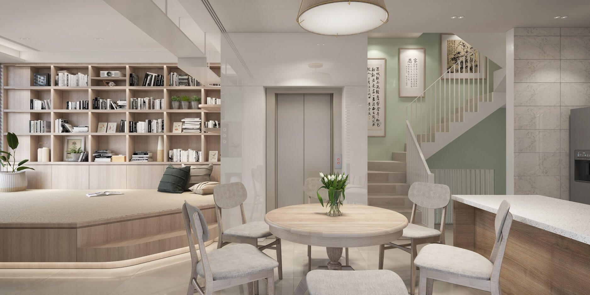 整體的空間採柔和明亮的色調,請燈光專家評估後,燈光使用自然舒適的 4000K 有含遮罩的崁燈,使光均勻柔和地漫射於環境之中。 即使是陽光沒辦法直接照到的梯間,白色的格柵扶手鐵件搭配灰綠牆面,仍然維持住空間清爽明亮的調性。在這裡,不管是工作、學習或是娛樂活動,家中的成員都能用最自在的心情度過生活中的每一天。