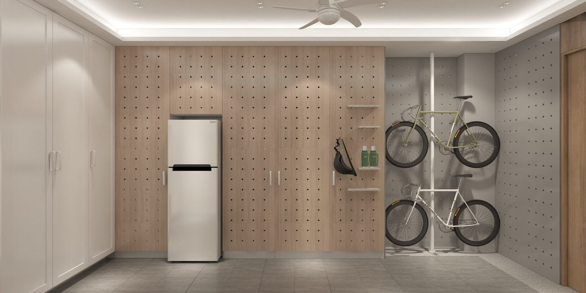 地下一樓因有大量收納空間的需求,所以我們不只是設置成員專屬的收納區域。外部牆面亦使用洞洞板,讓使用者能輕易拿取需要的物品。
