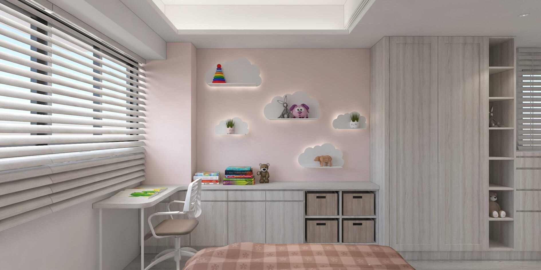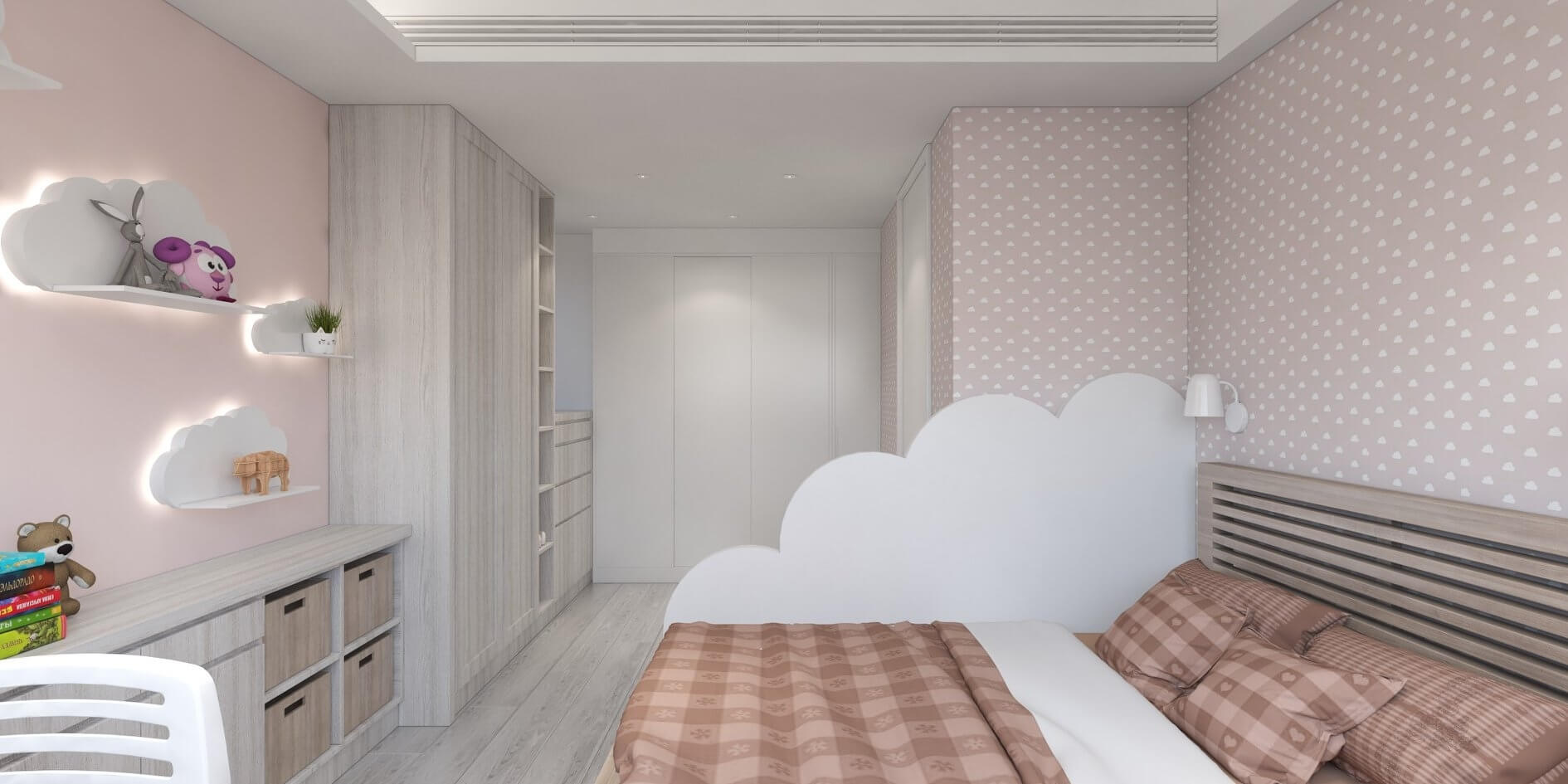 二樓另一邊為女孩房,空間採粉色系搭配白色雲朵造型燈光層板,使房內的浪漫與活潑感同時並存。格局上,我們捨棄了更衣室的空間,將隔間拿掉,使用者可以在前面的小空間吊掛滑軌式帳棚,躲在自己的秘密基地。
