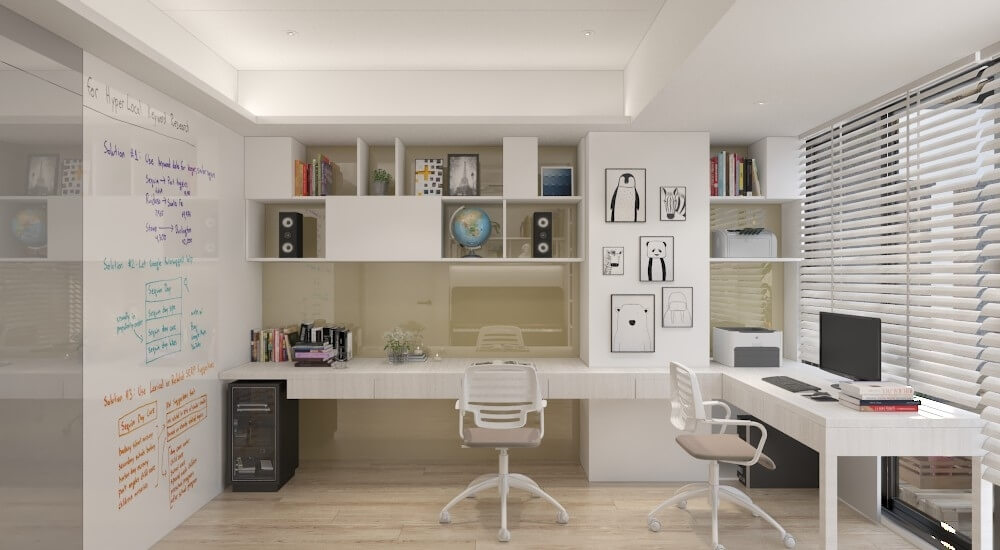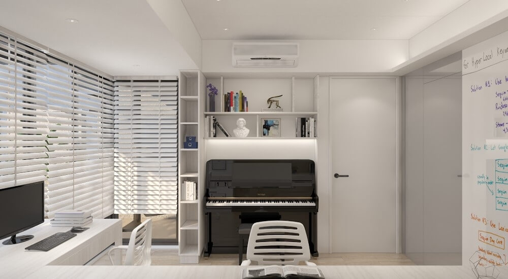 來到四樓書房,主要的功能是男主人工作房、孩子寫作業、練鋼琴、女主人手做裁縫的空間,因此這裡常需要大面的磁鐵烤漆玻璃,讓男主人和孩子顯微觀察實驗時能方便紀錄。