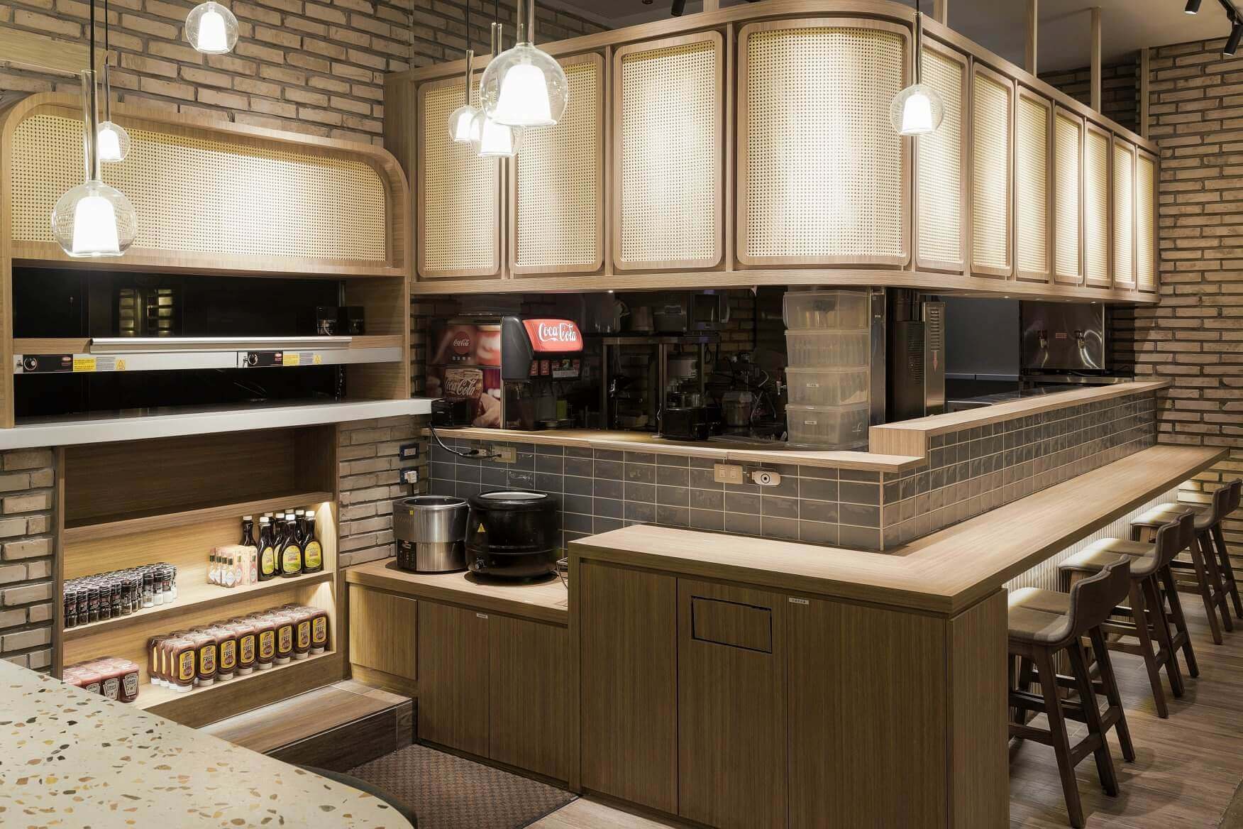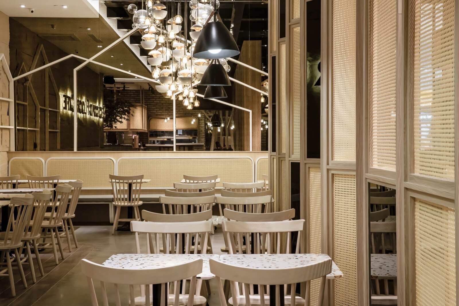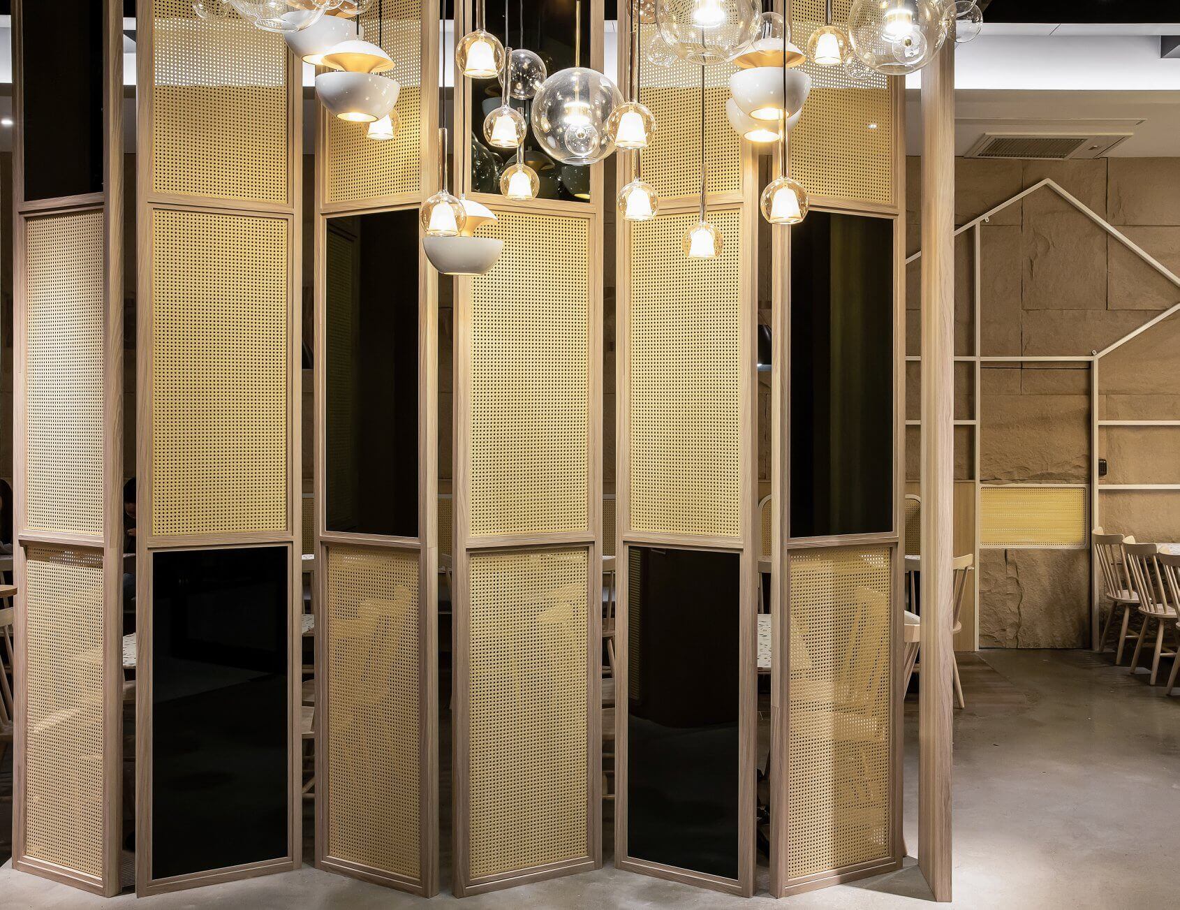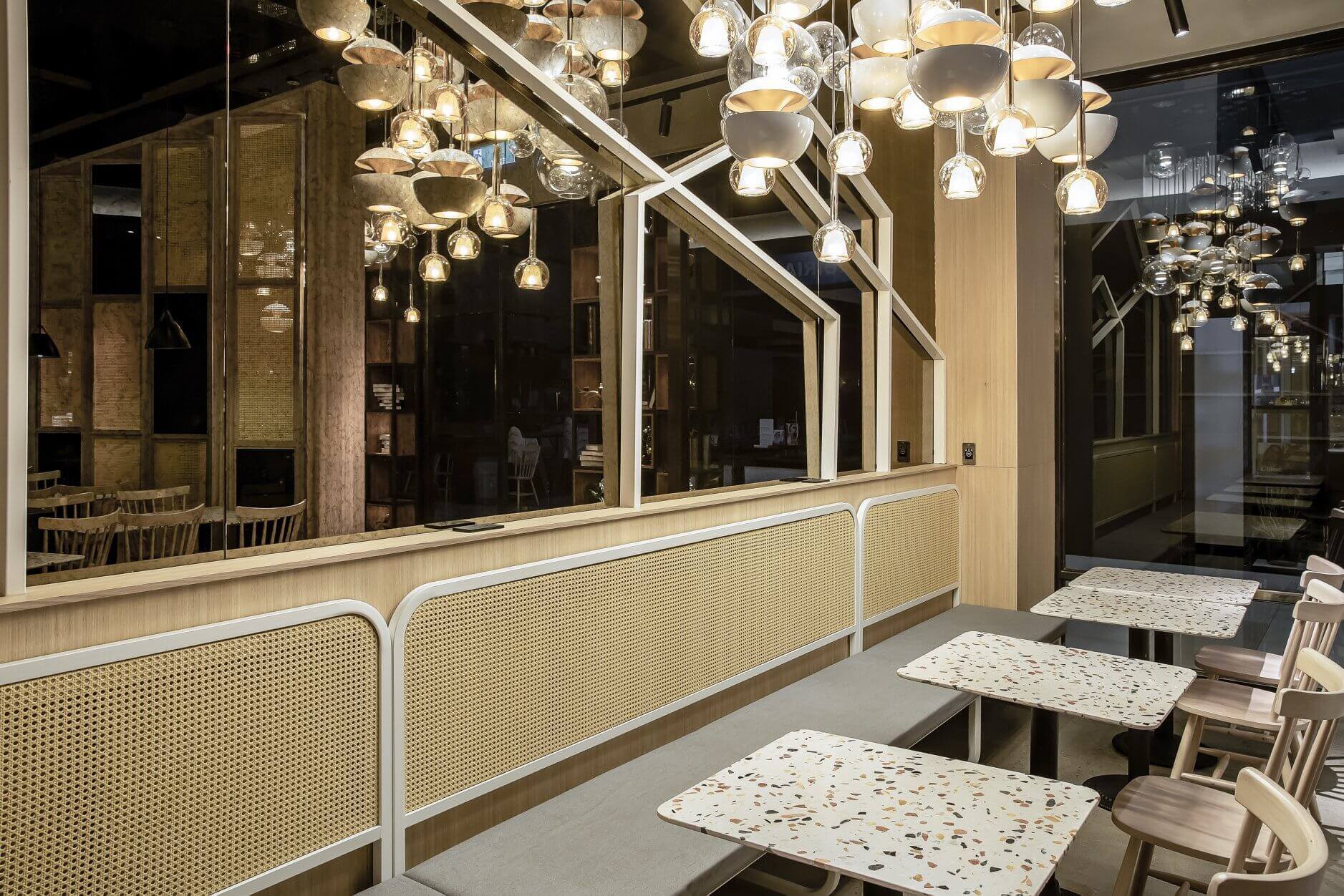 在店面入口處混合書房裡方形陳列的視覺,象徵收藏記憶深處的回憶,並透過點狀光源的引導,邀請每個沿著大片落地的藤編黑鏡牆,悠閒緩步地走進餐廳裡。