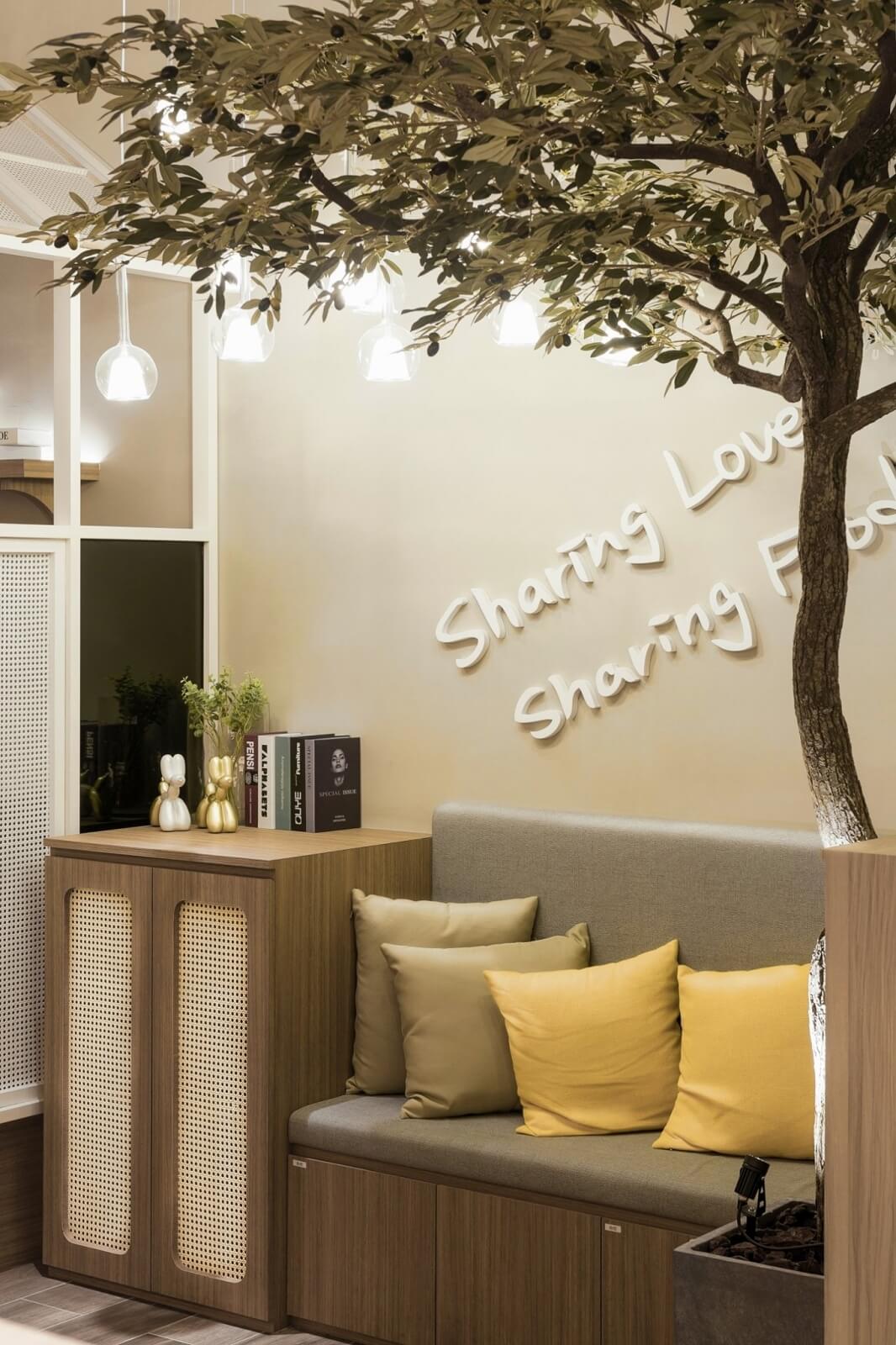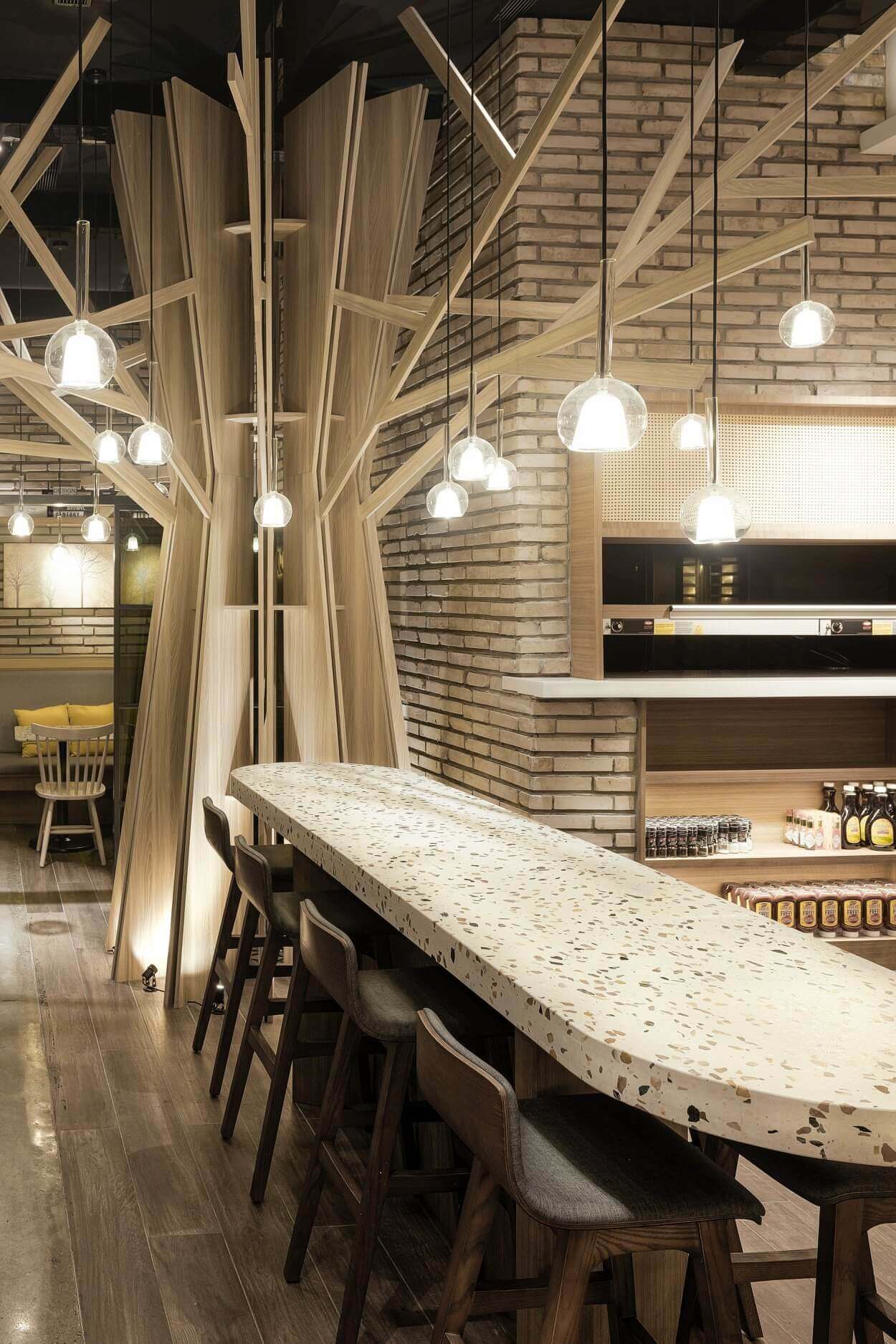 當客人走到餐廳亮點的樹下時,能透過木造質地的結構感和巨大的視覺輪廓,傳達熱鬧、溫暖的空間氛圍。此區的整體材質以溫潤的文化石、木紋和藤編為主,因此流明設定在 1000lux 以上。