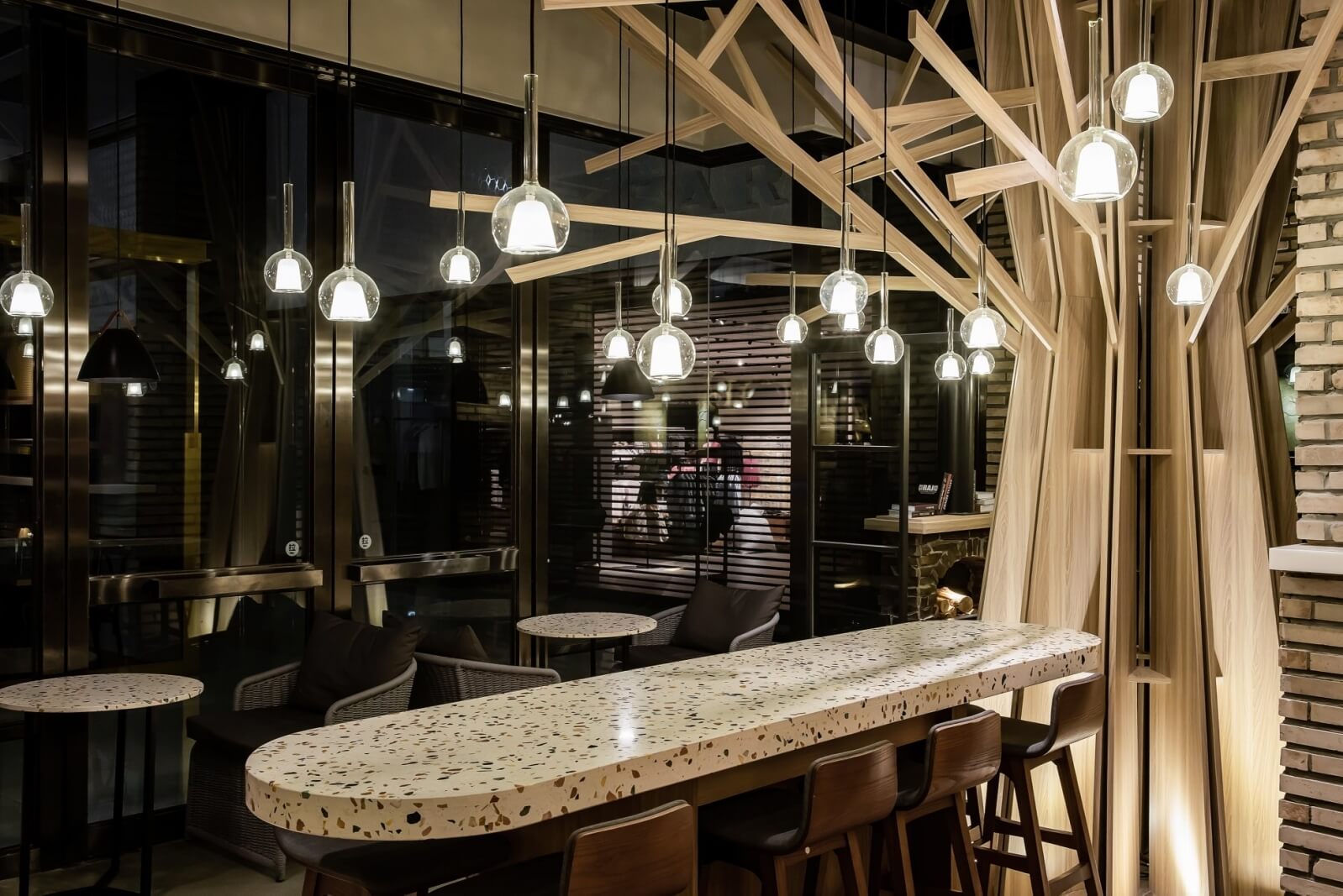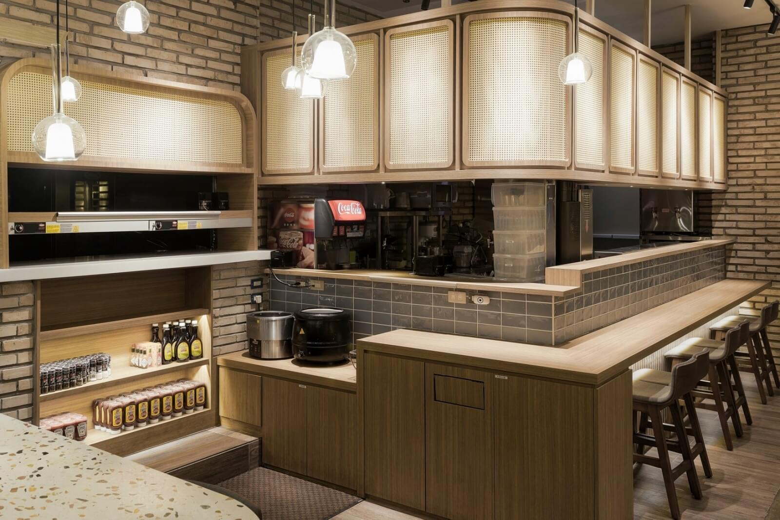 此為餐廳中繼帶的吧台區,銜接內部藤編、木質的歡樂與外部玻璃落地的慢活感