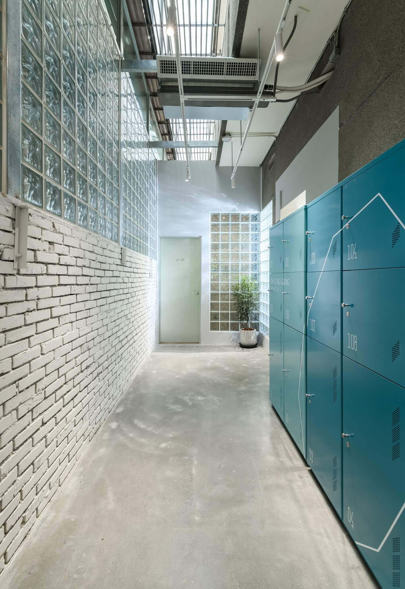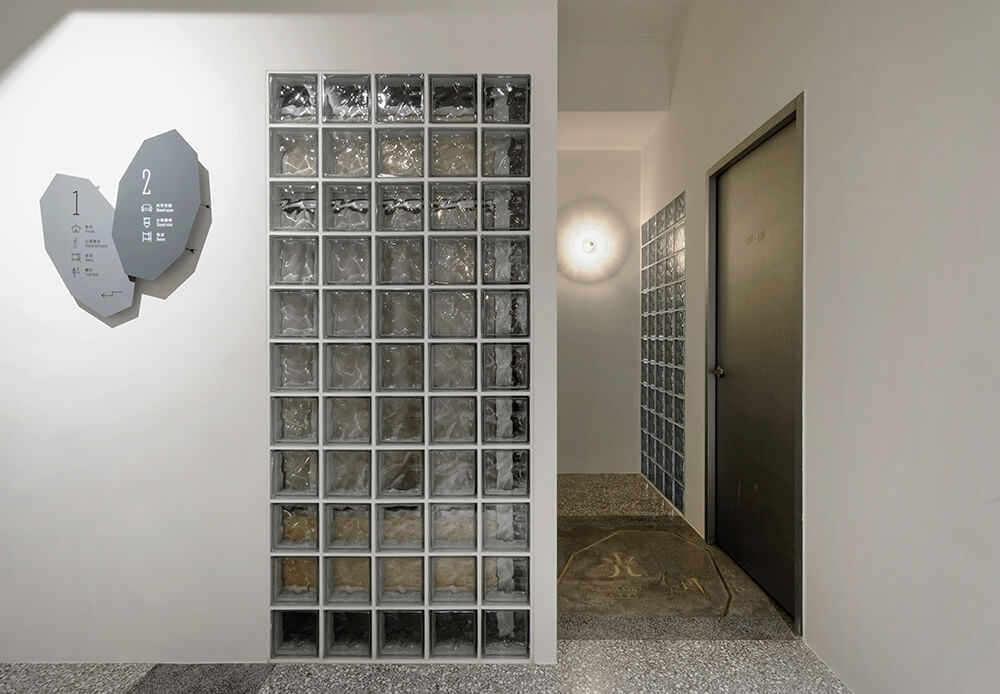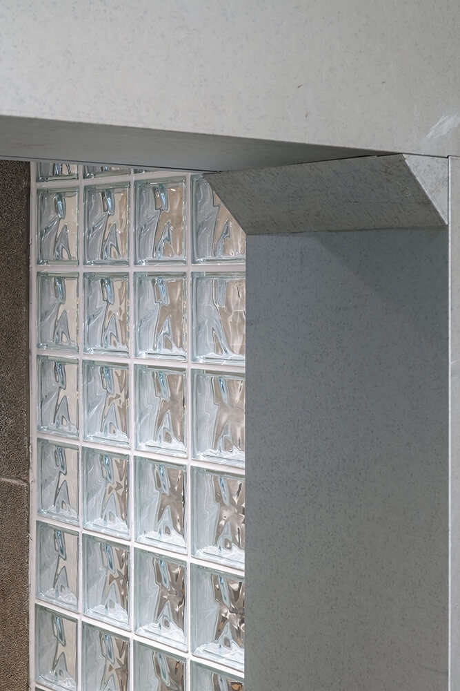 通往廁所、房間、廚房的挑高長廊利用玻璃磚透光,白天時將光線從上方採光罩引入至長廊及室內,透過光的傳導反射在地面或牆面的水波紋使整體氣氛更加清新明亮。