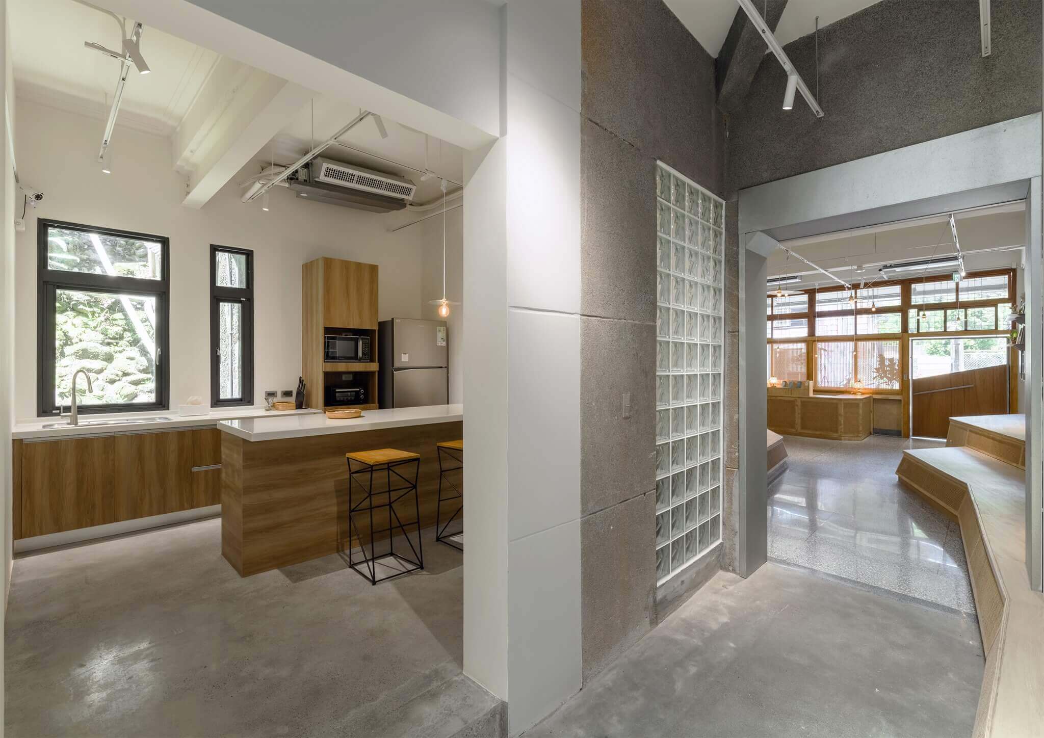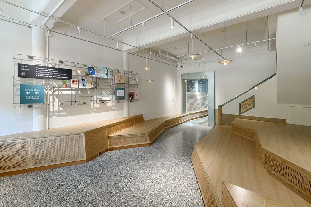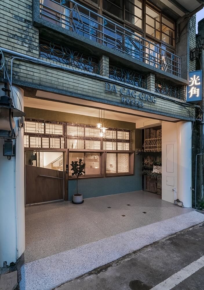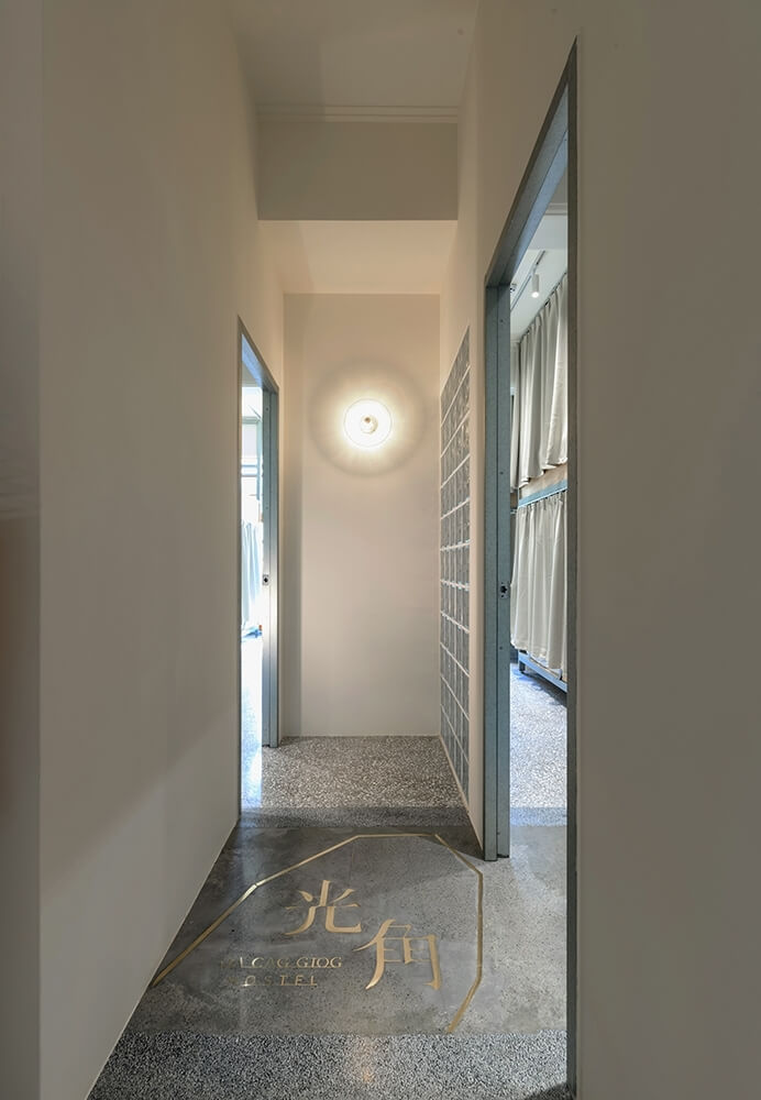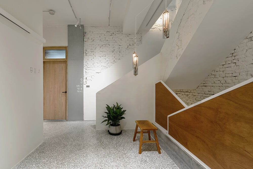 接著來到騎樓,門面上以藍綠色馬賽克磁磚為主要元素,保留原有木窗框以松木夾板施作門框、窗框延續至屋內大廳,而地板則貼磨石子磁磚,使空間流露出樸實的氛圍。
