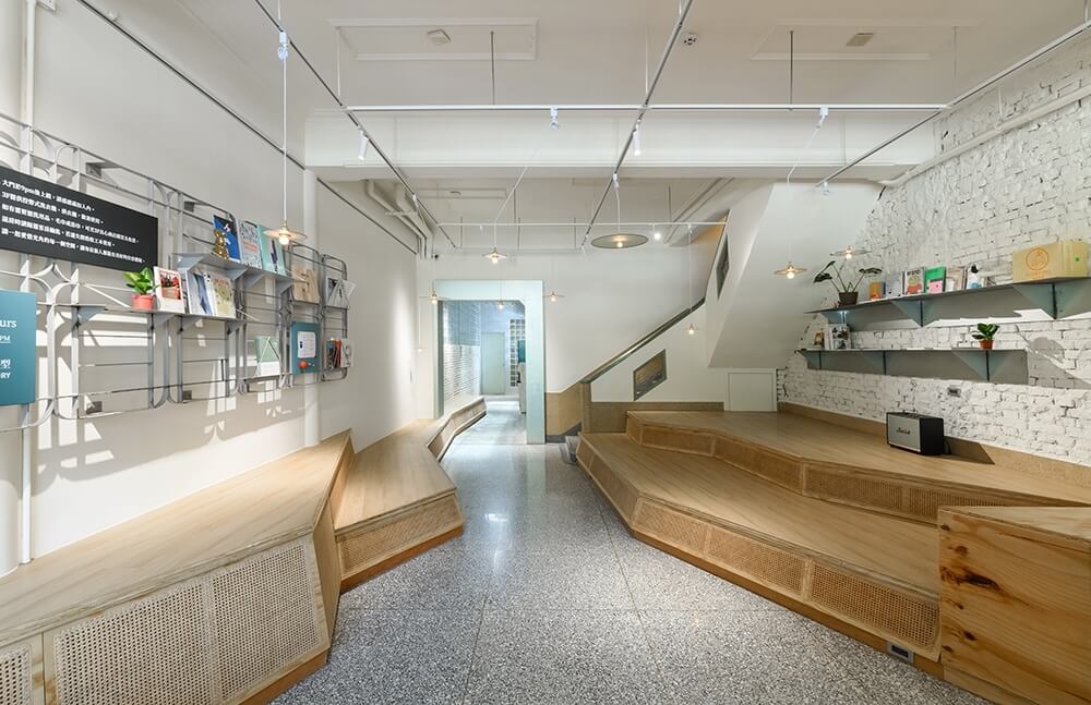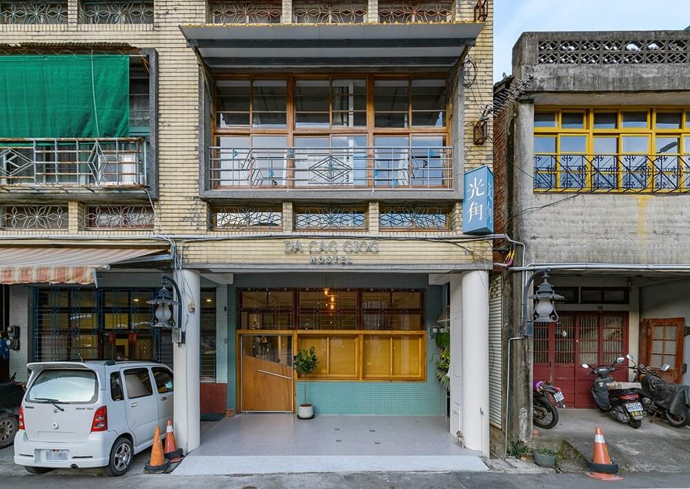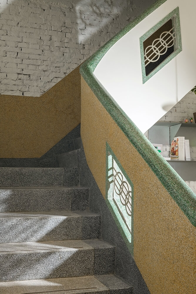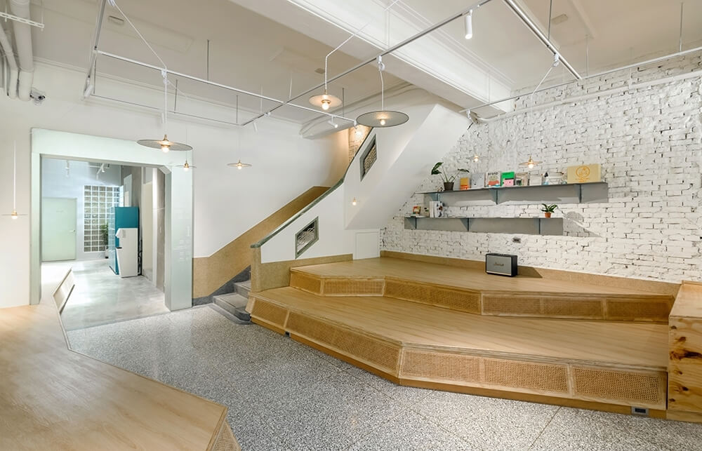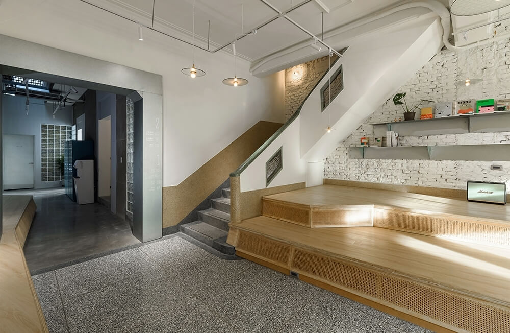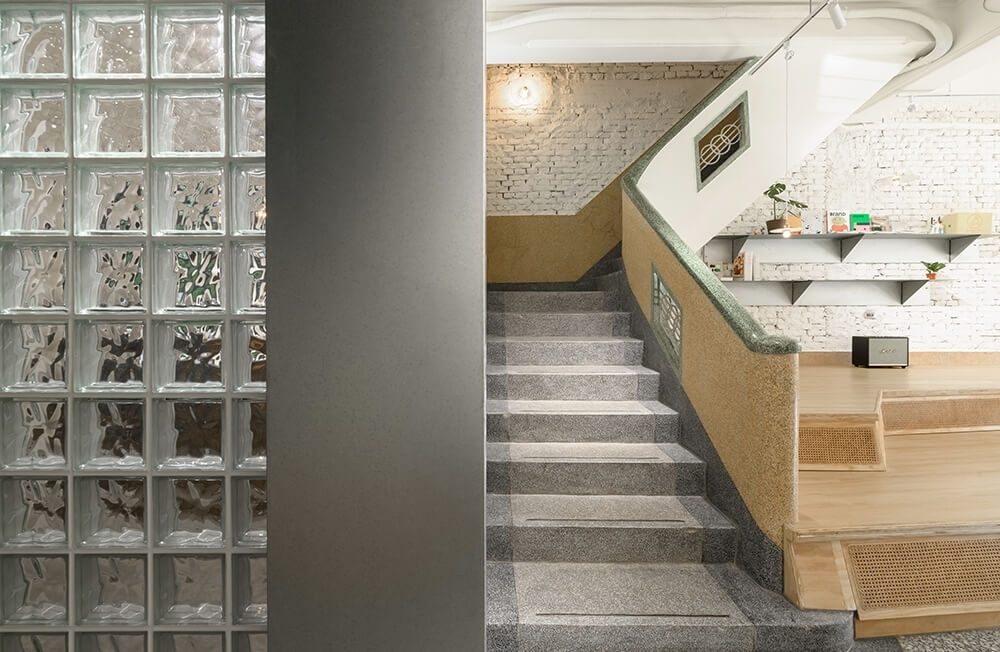 接著來到騎樓,門面上以藍綠色馬賽克磁磚為主要元素,保留原有木窗框以松木夾板施作門框、窗框延續至屋內大廳,而地板則貼磨石子磁磚,使空間流露出樸實的氛圍。
