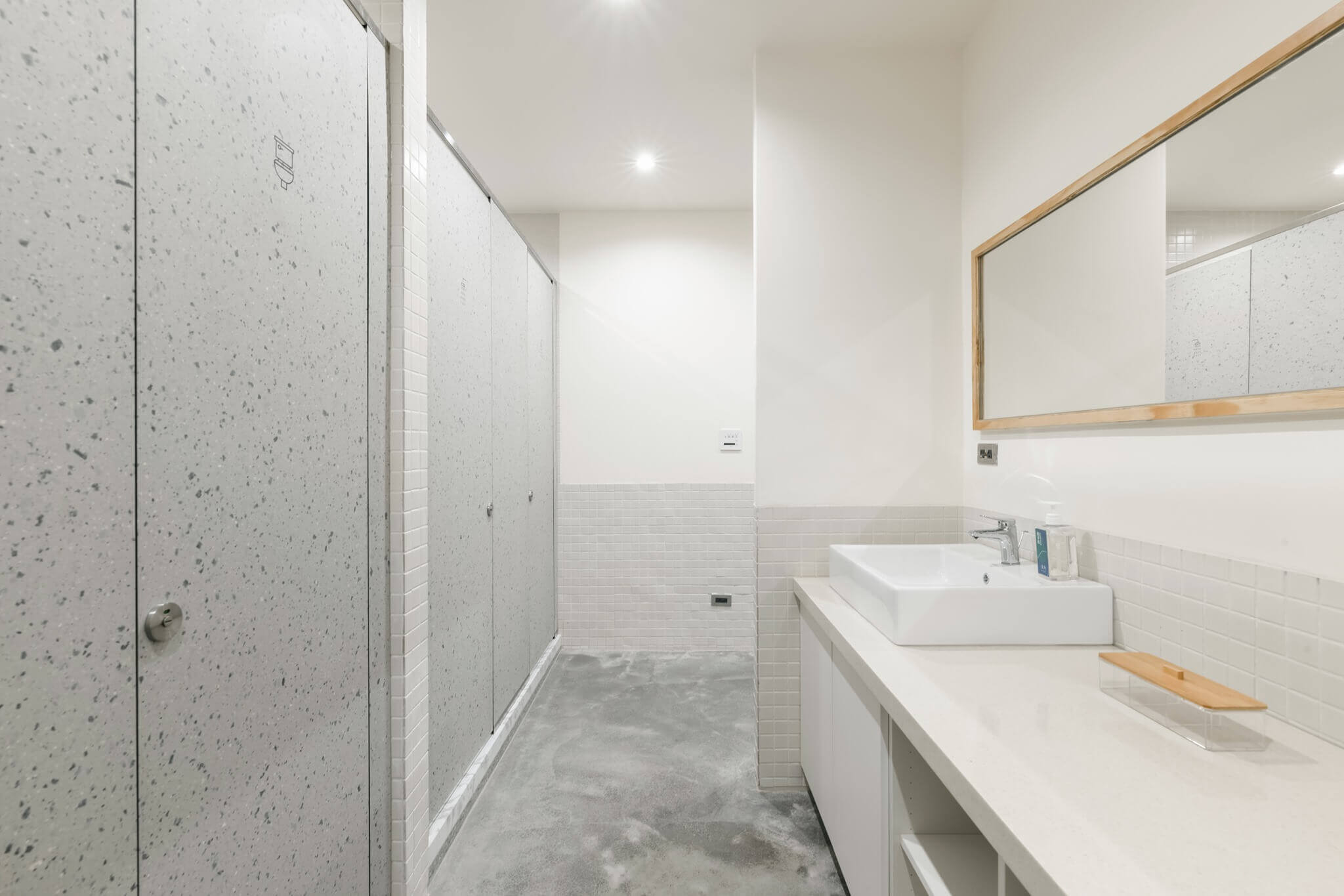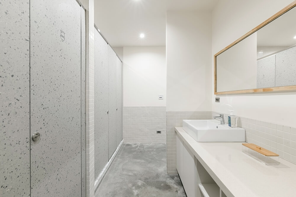 壁面以白色馬賽克磚及白色油漆處理,地板使用水泥粉光研磨地平,廁所隔間搗擺門也採用防水磨石紋理造型,以上材料應用與原有物件作材料呼應、延伸