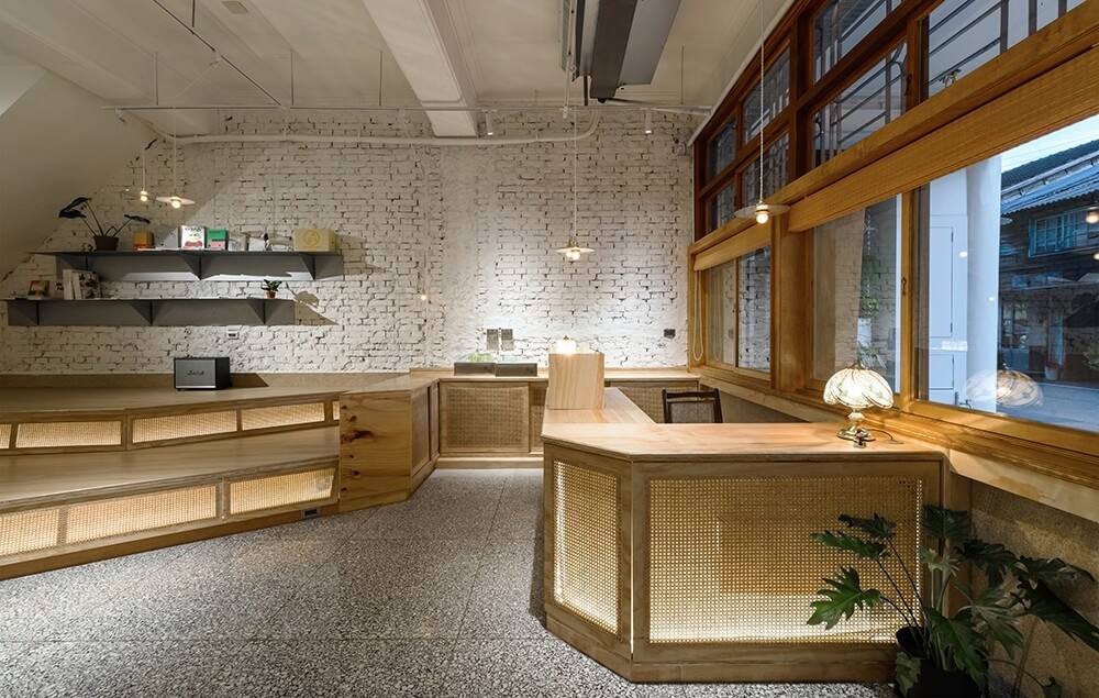 作為適合櫃檯和公共空間區域的一樓,我們採吧台及開放平台仿效「山」的形式高低轉折作為平台延伸運用,以松木夾板作為基底,結合「藤編」表現出透光性的效果,讓光線是慢慢漸層滲透而出,呈現出「光」的想像。展示層板架的地方,維持同樣的脈絡,運用原有花窗與投射燈光線與牆面反射出美麗的倒影。