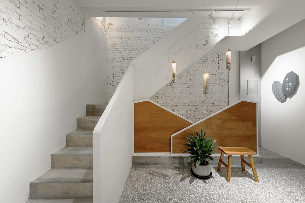 結合溫暖和光的元素,我們在建築物外牆保留了黃色磁磚,並修繕戶外欄杆,其中將欄杆中結合三角形光的鐵件,讓外觀代表著生生不息地延續本建築物的精神。