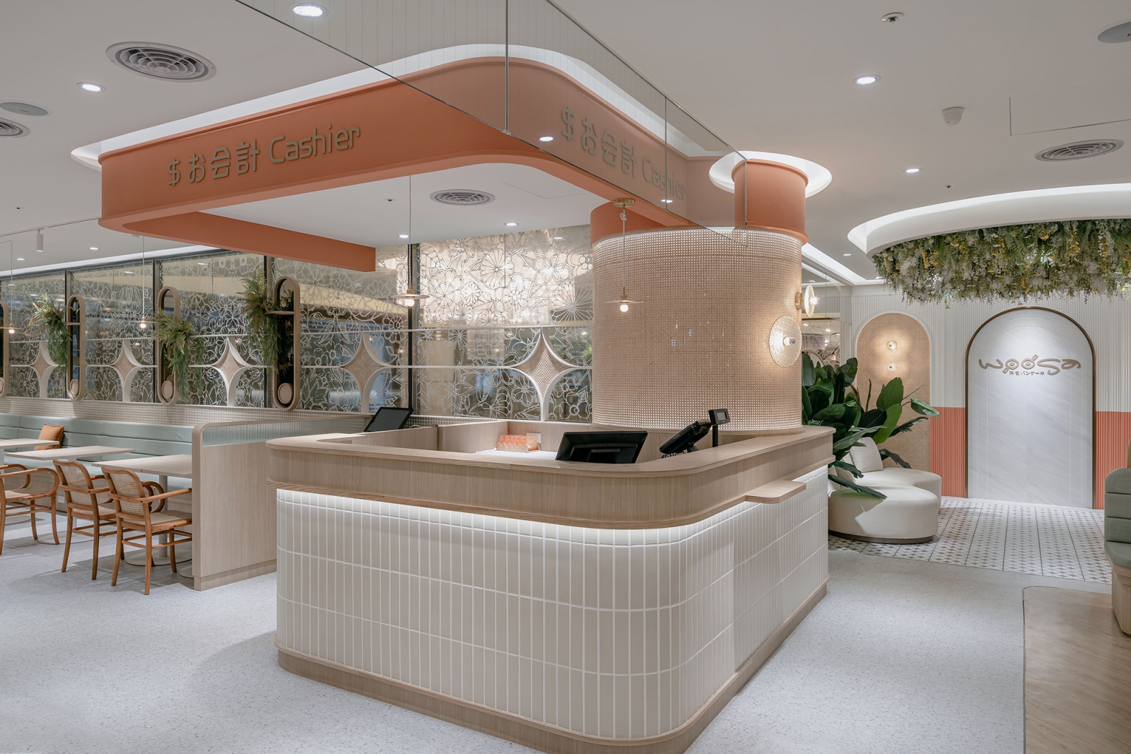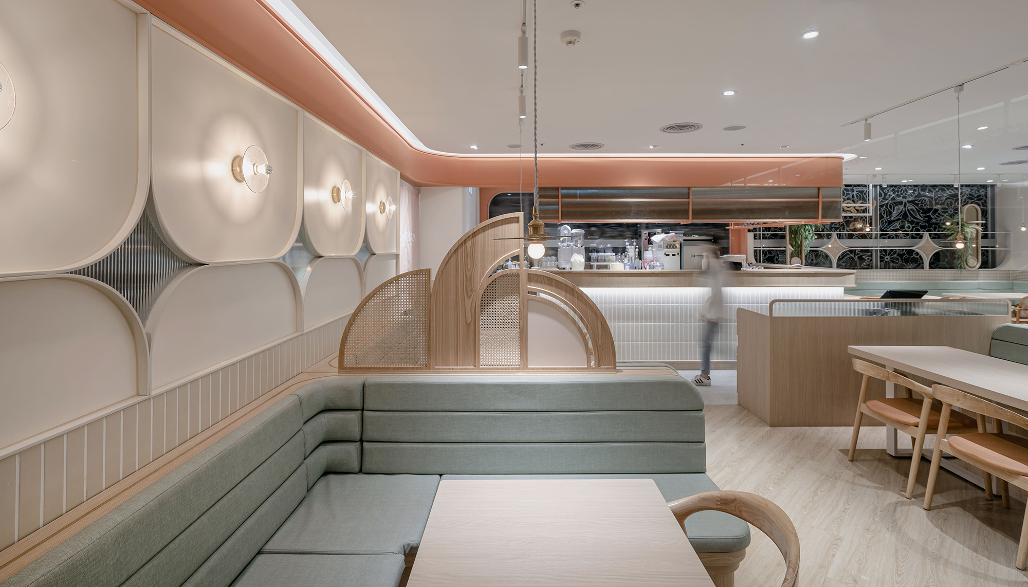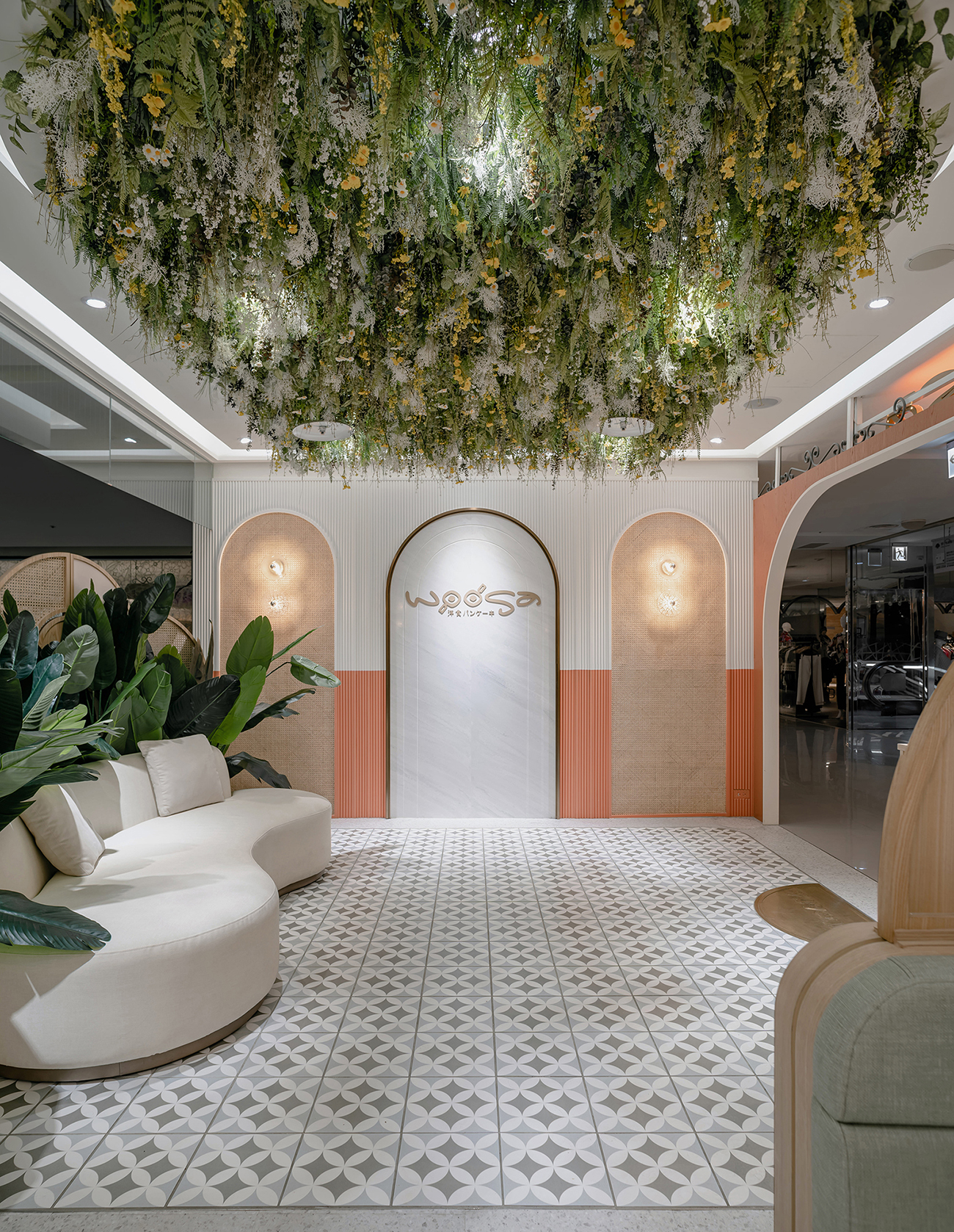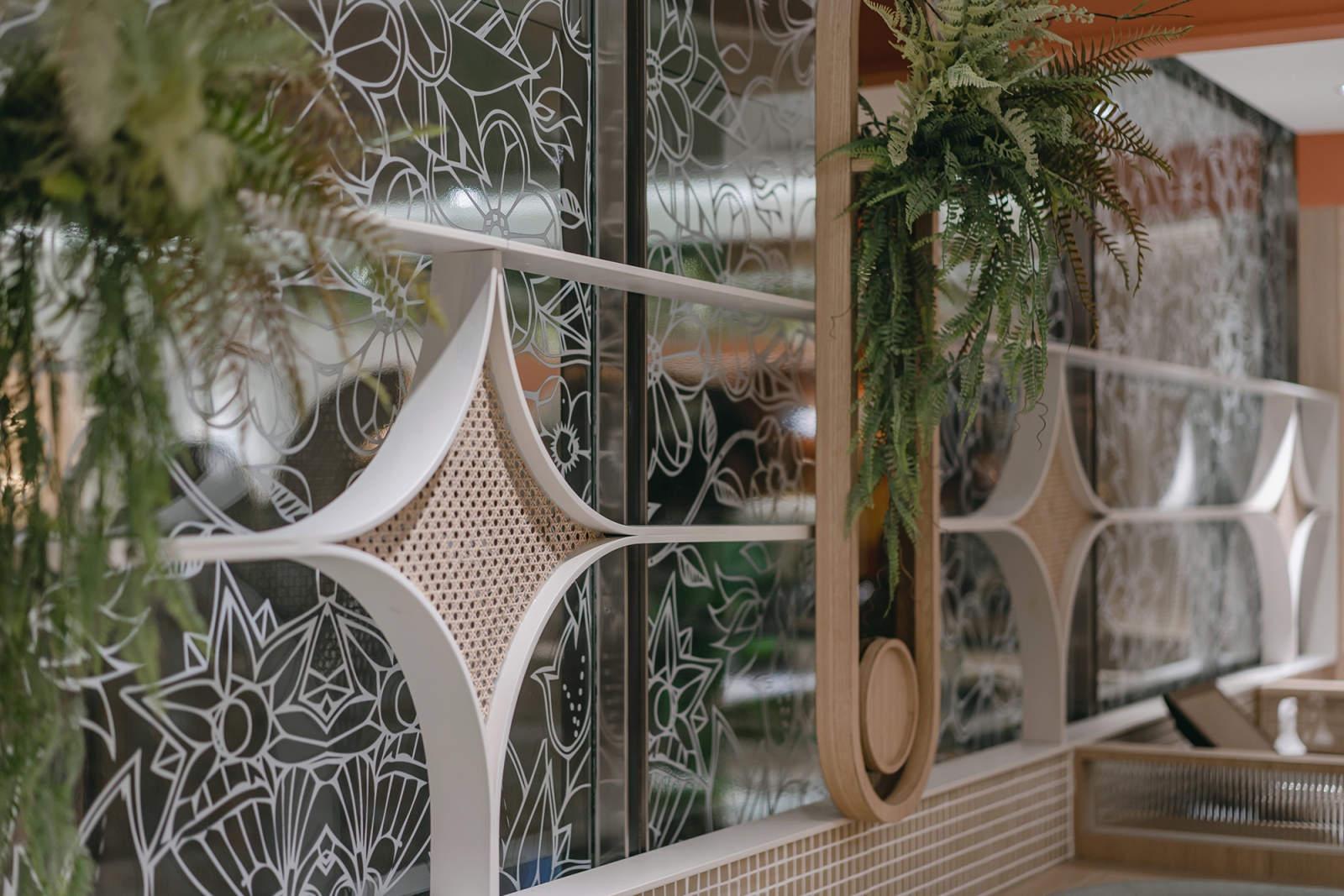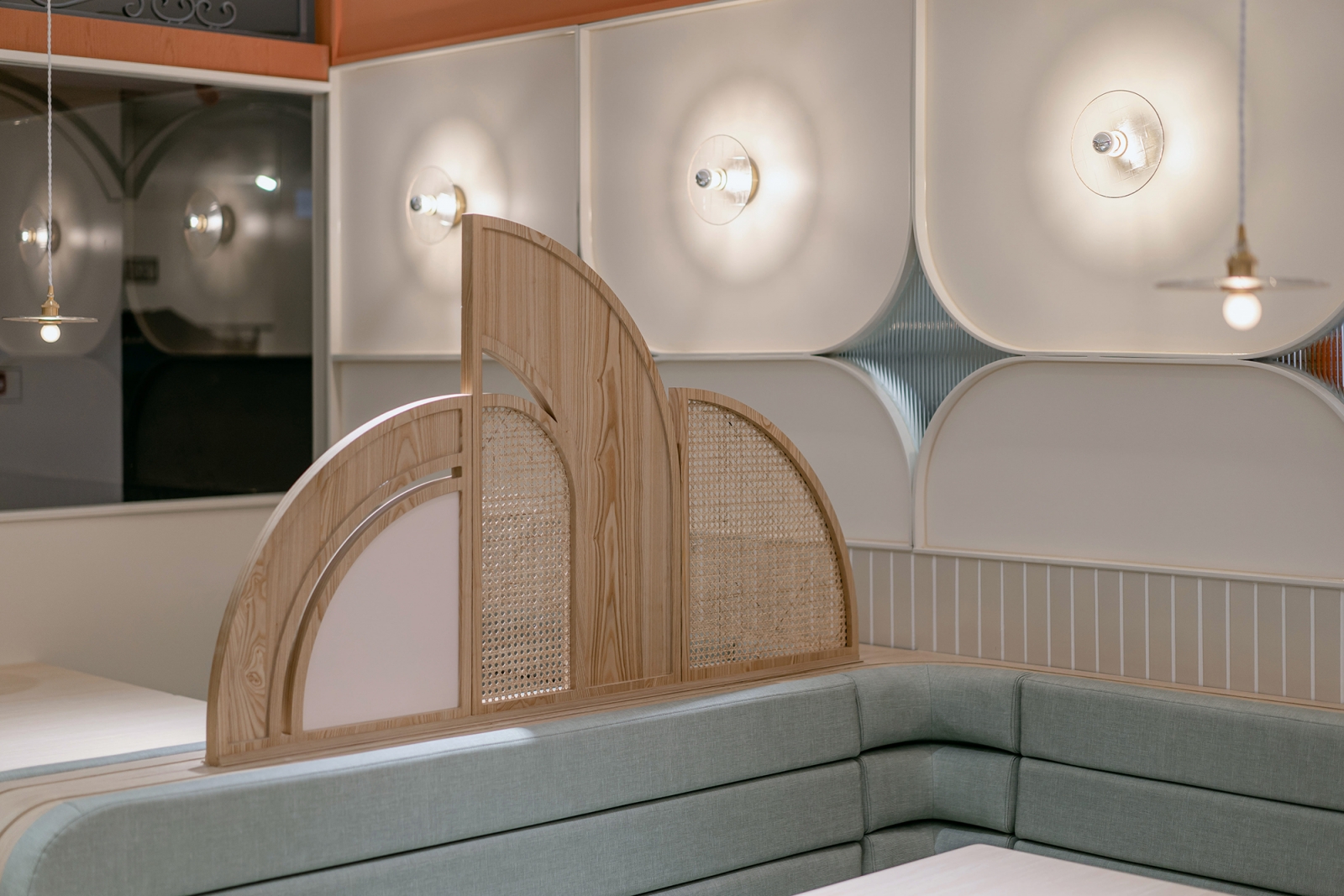 當從外面進入此空間時,客人能被頭上的天花植栽以及花磚包圍,使氛圍瞬間感到放鬆。此外,消費者亦能透過橘色及藤編符號慢慢地被引導到用餐空間內。而外觀隔屏,則利用大弧面的跨距作造型,讓下方呈現出幾何造型分割。
