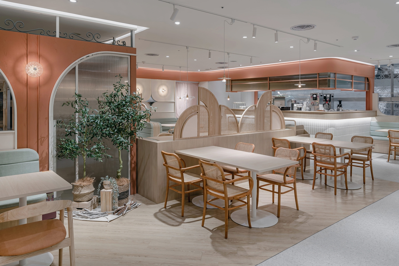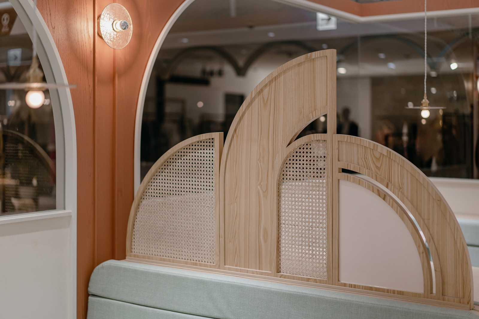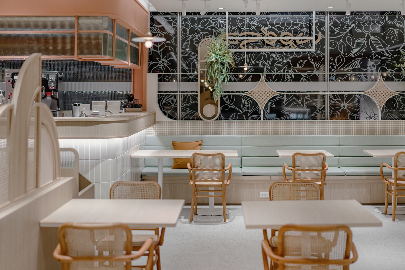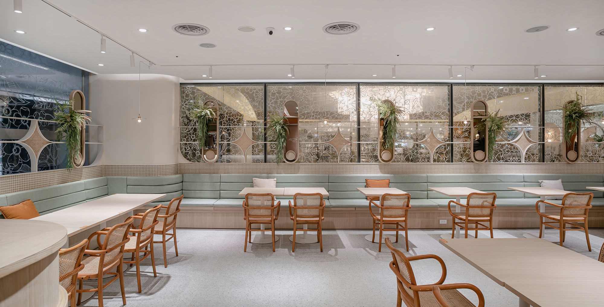 當從外面進入此空間時,客人能被頭上的天花植栽以及花磚包圍,使氛圍瞬間感到放鬆。此外,消費者亦能透過橘色及藤編符號慢慢地被引導到用餐空間內。而外觀隔屏,則利用大弧面的跨距作造型,讓下方呈現出幾何造型分割。