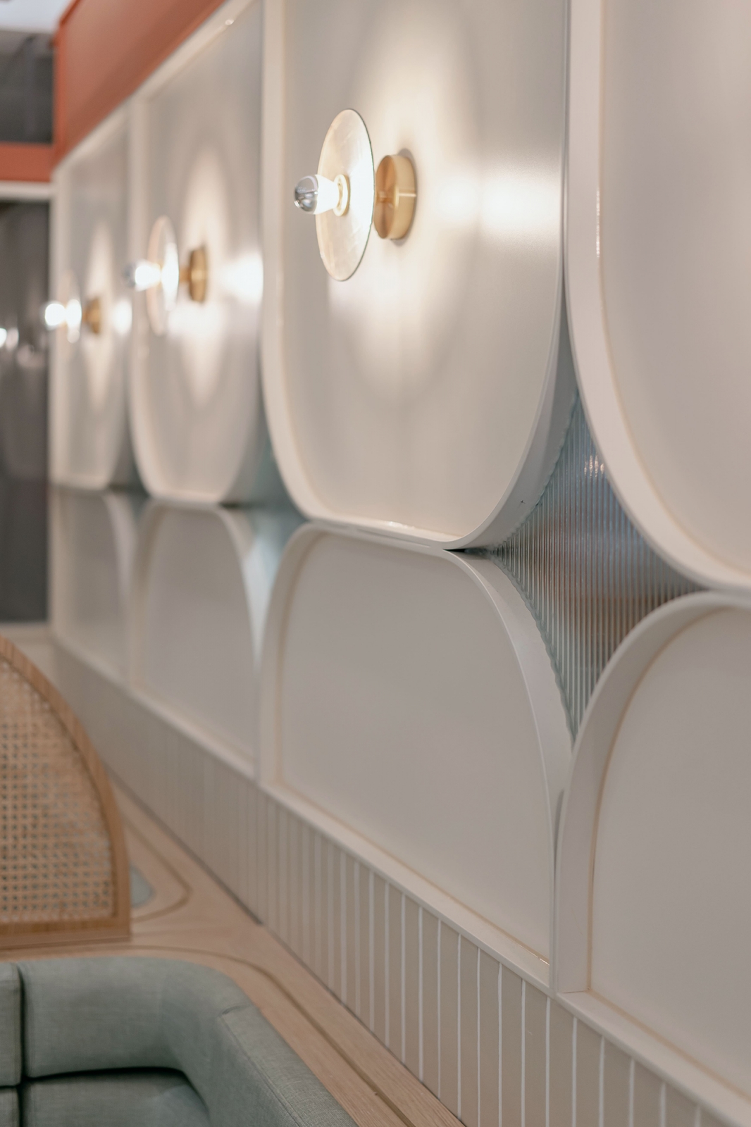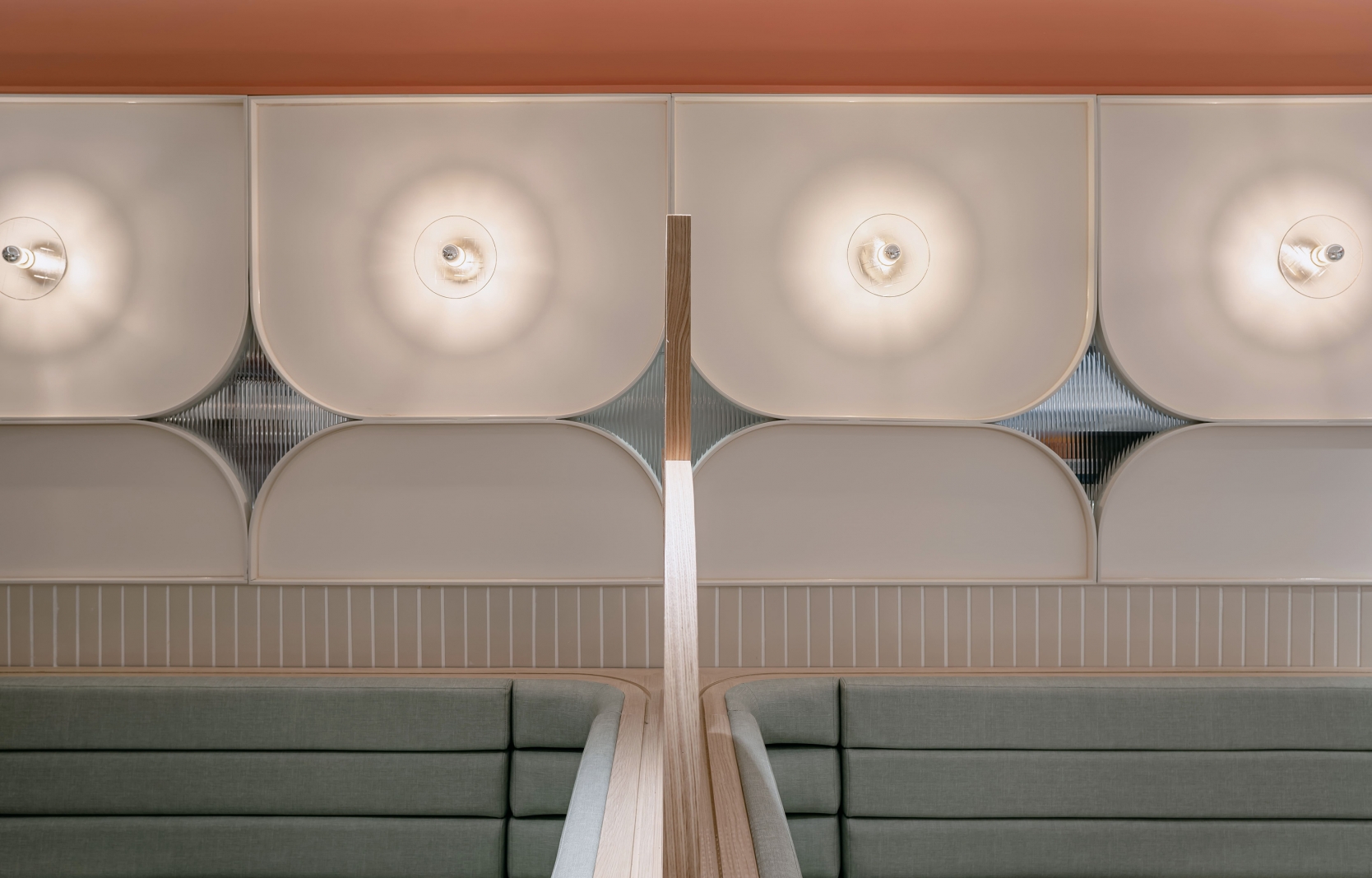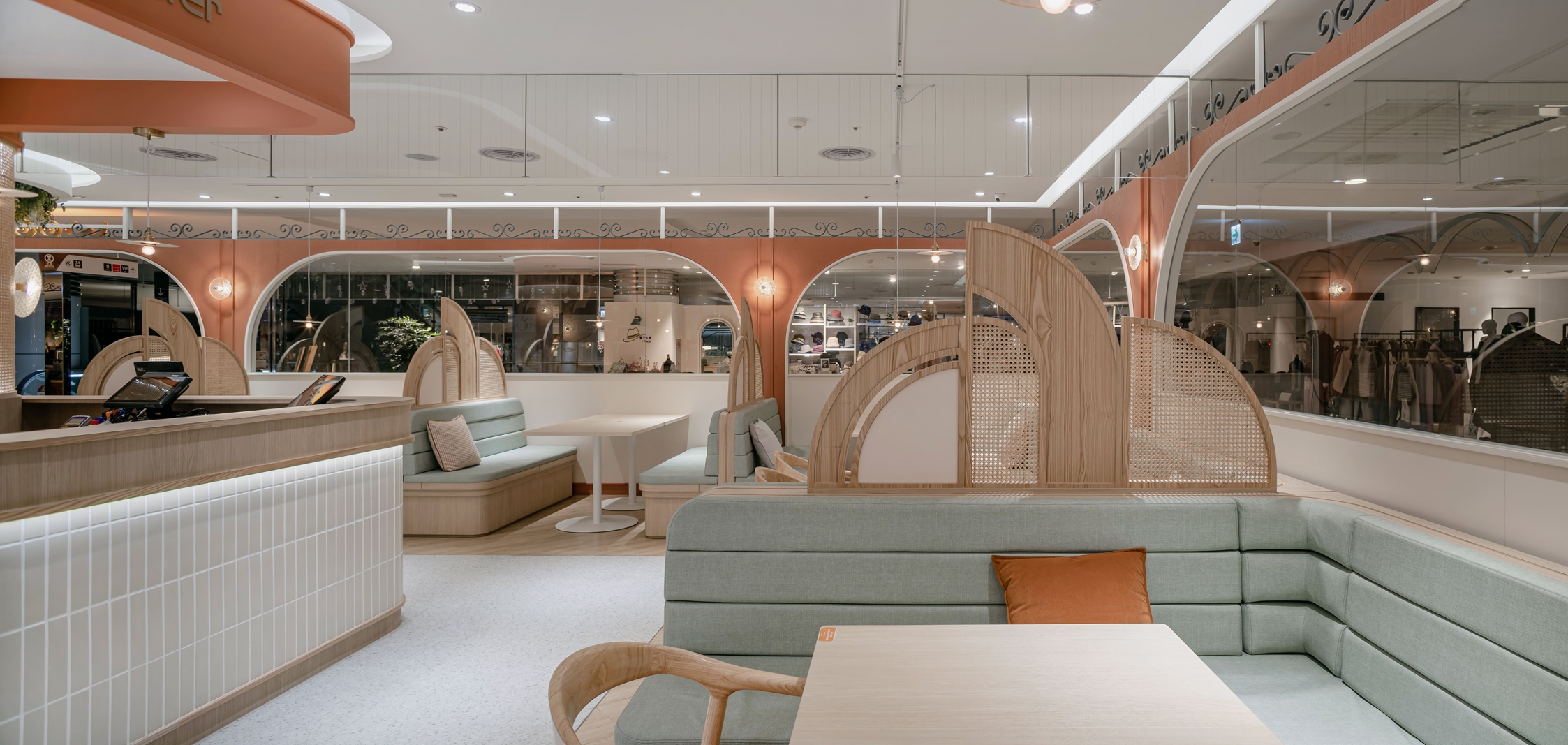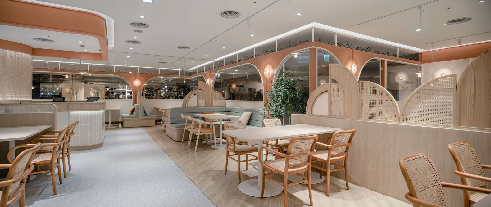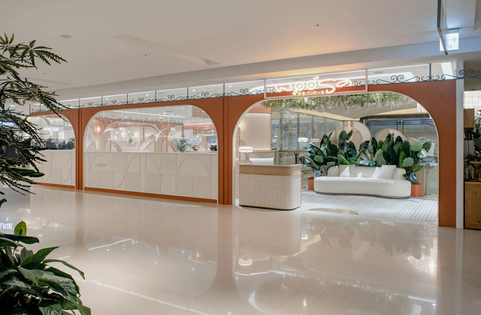 當從外面進入此空間時,客人能被頭上的天花植栽以及花磚包圍,使氛圍瞬間感到放鬆。此外,消費者亦能透過橘色及藤編符號慢慢地被引導到用餐空間內。而外觀隔屏,則利用大弧面的跨距作造型,讓下方呈現出幾何造型分割。