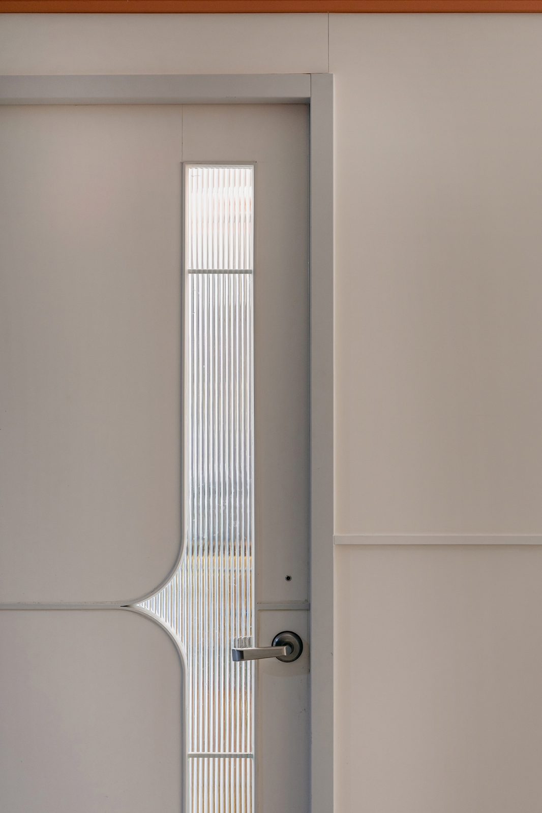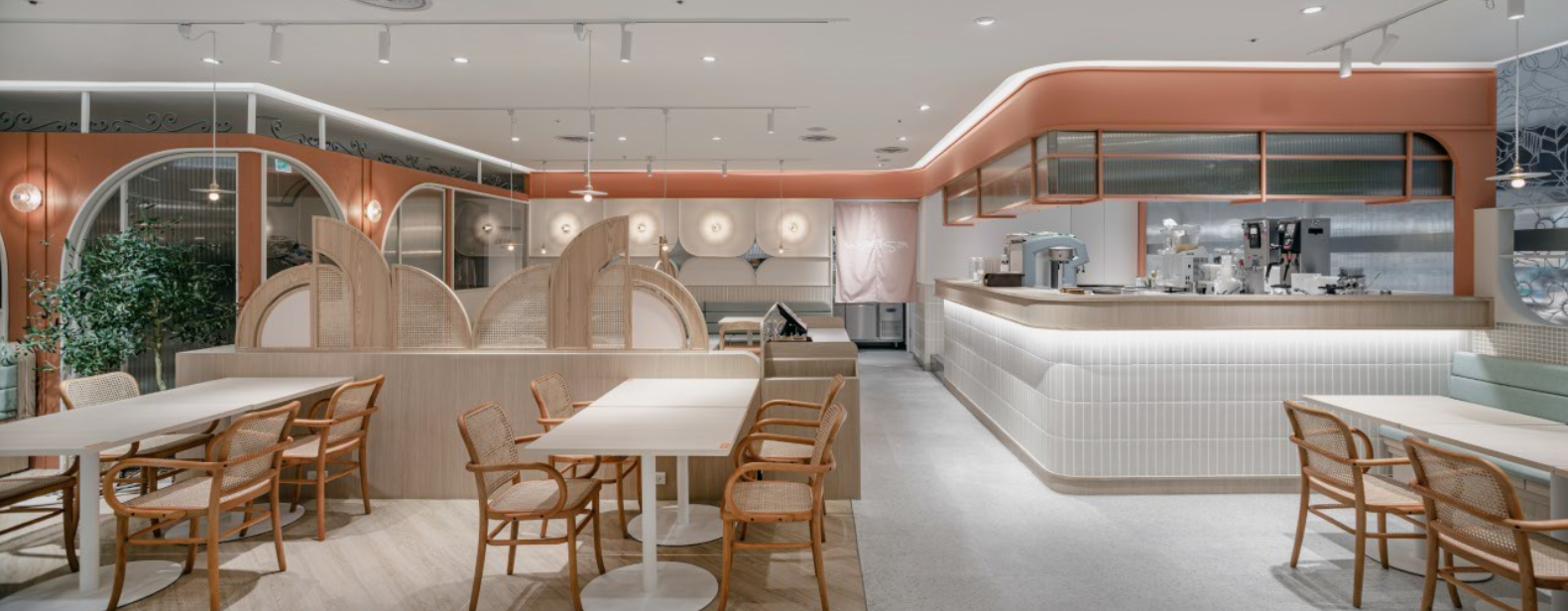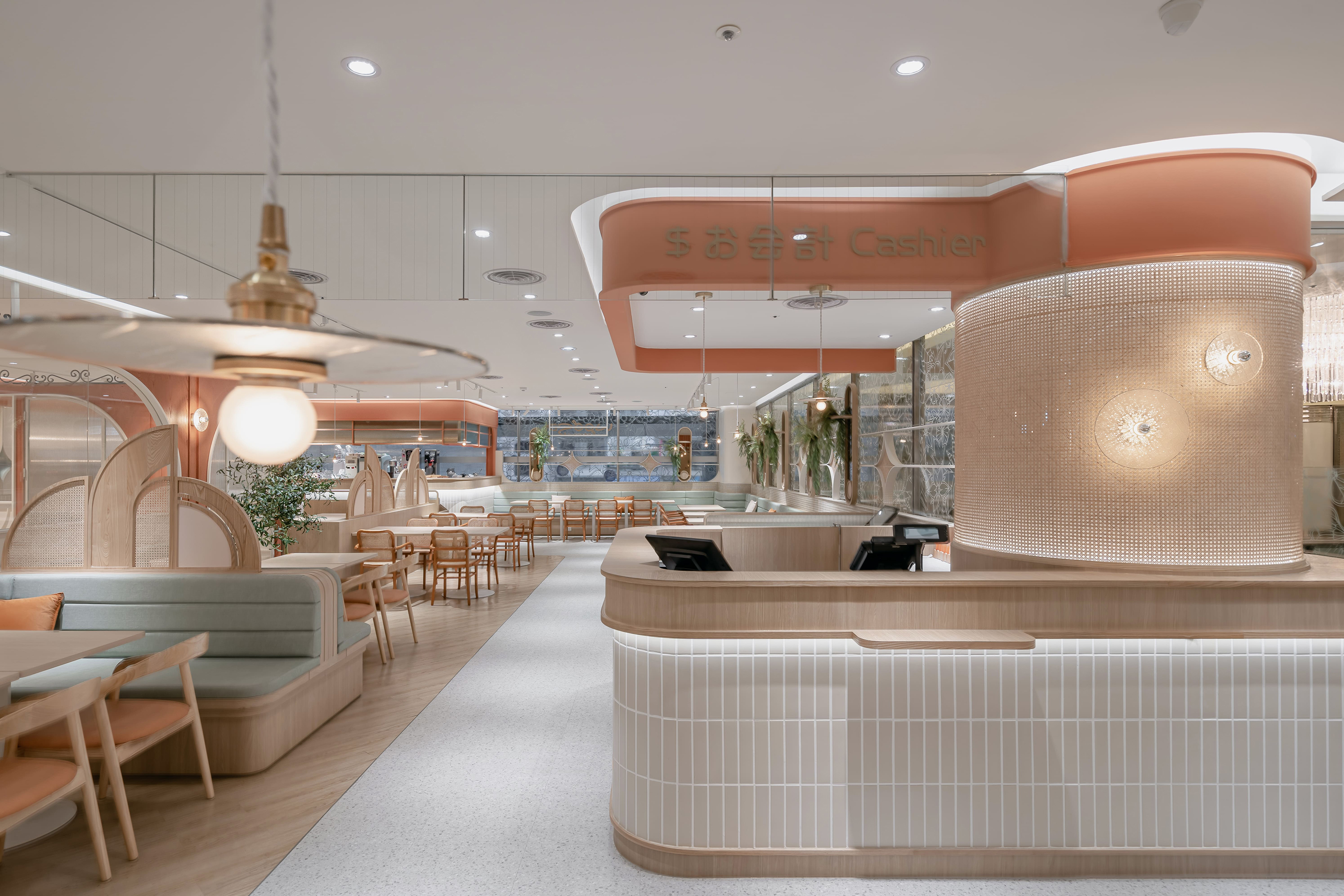 用餐完畢後,來到收銀服務台、備餐檯,吊頂天花板利用橘色弧線,便於讓客人知道此區域為工作服務區。矮隔間立面使用長條磚、美耐板、橘色烤漆作為服務台視覺。