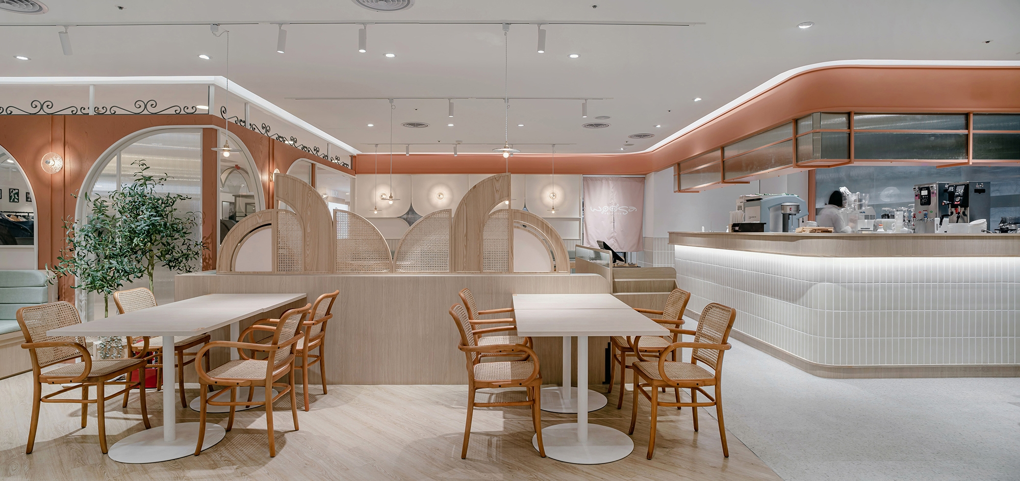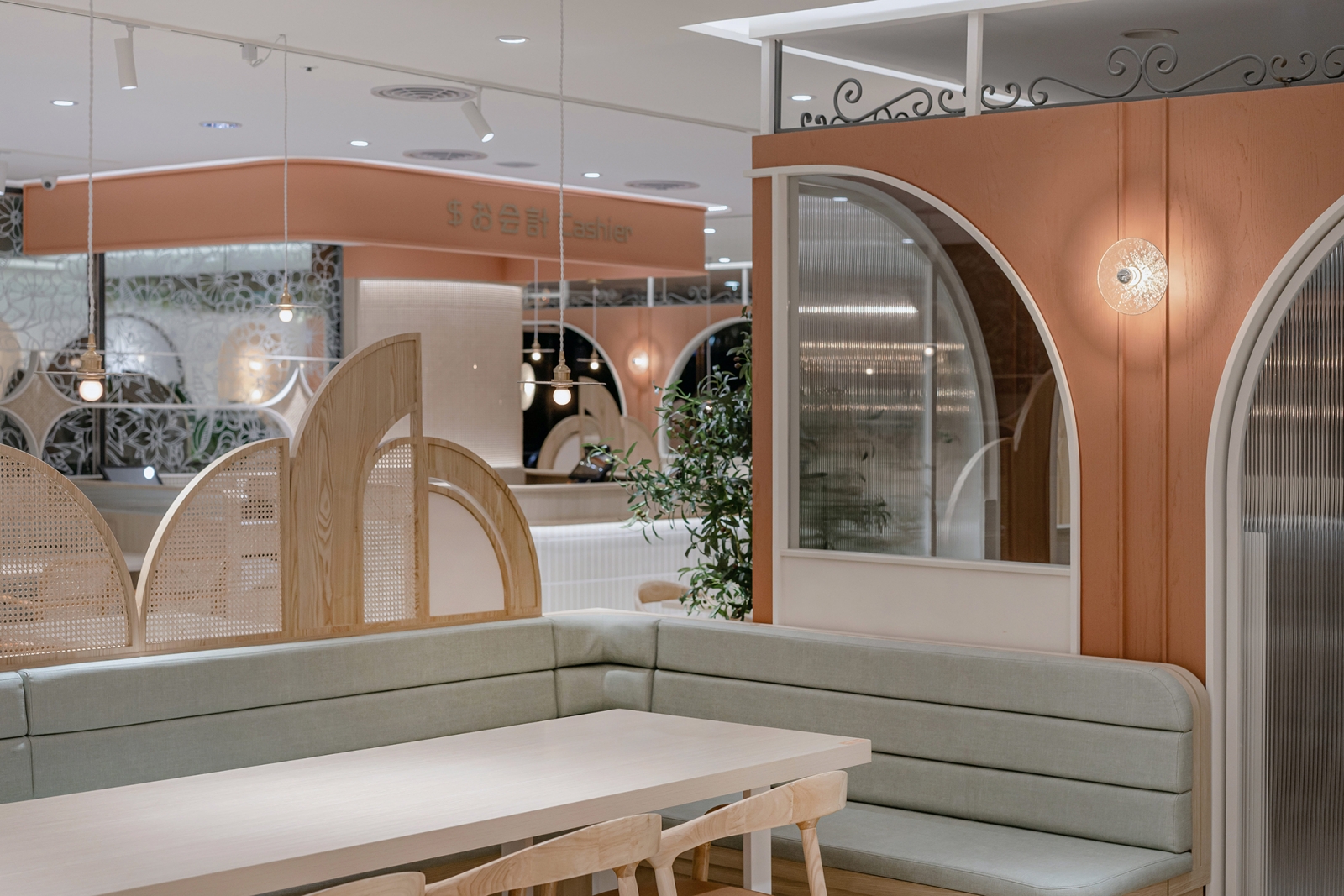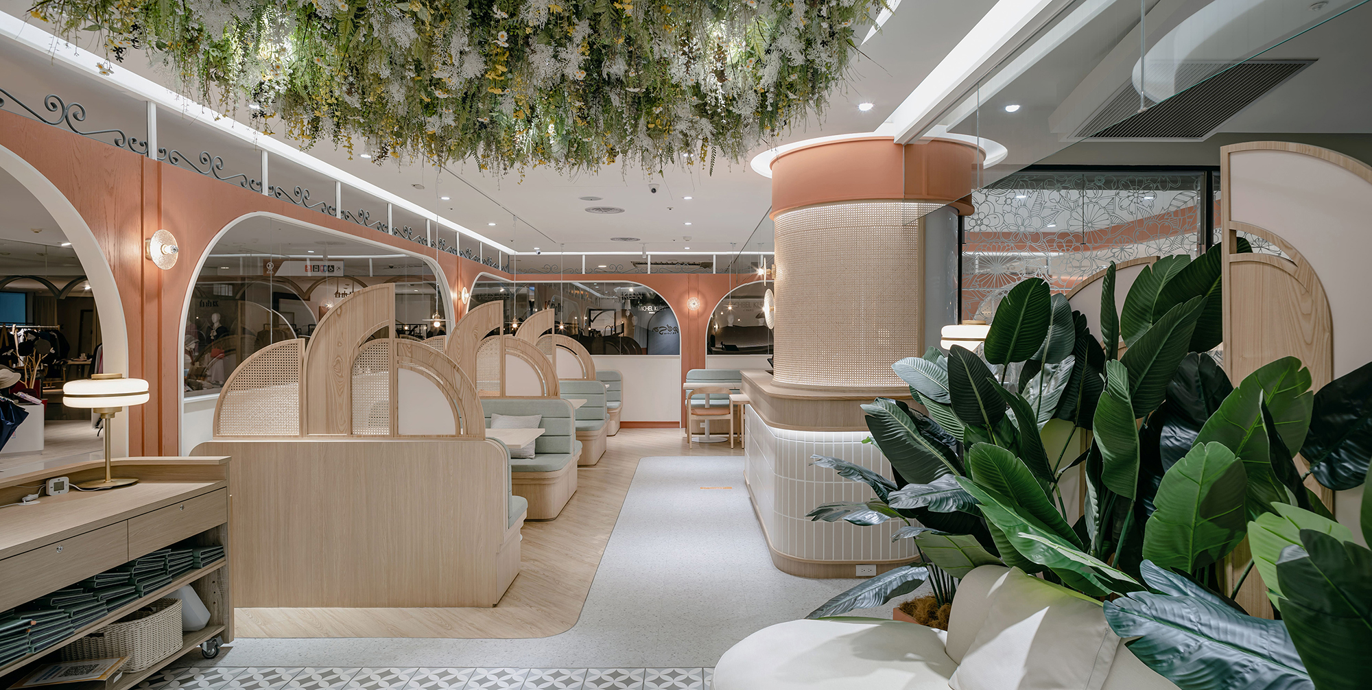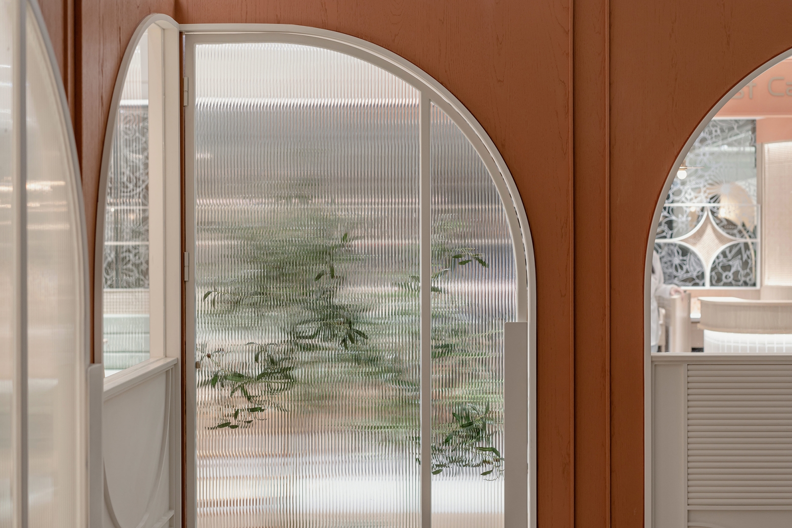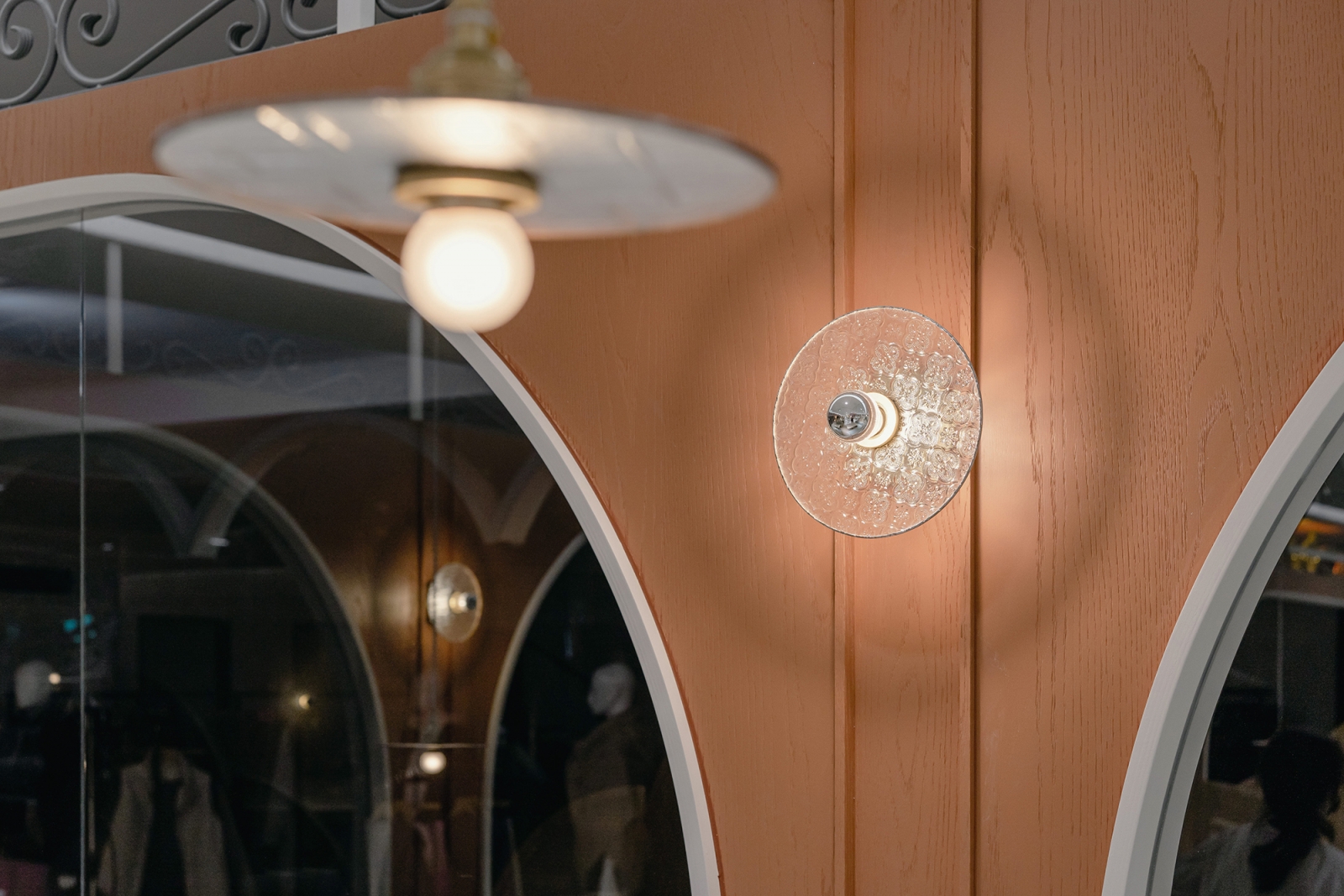 同時在店內放入落地型植栽、天花板吊掛植栽,利用不同種類的蕨類植物穿插交疊降低飽和度,讓綠色不致搶過新的主題色系。在造型吊燈和壁燈上,則用海棠花、十字紋玻璃畫龍點睛,使空間的光影更具層次和紋理。