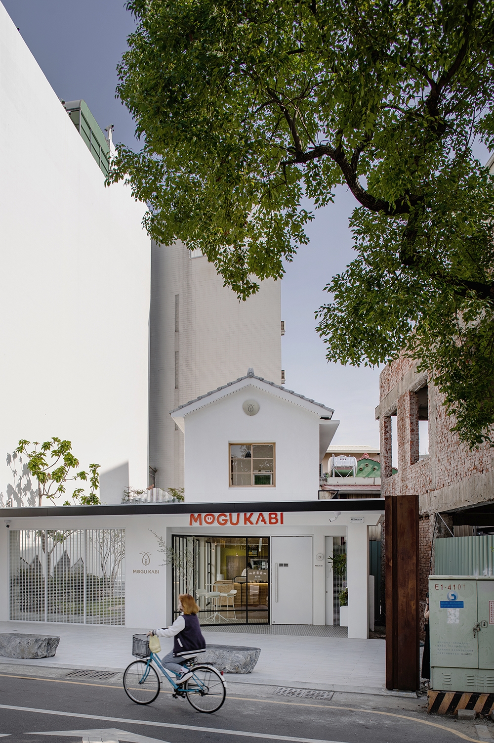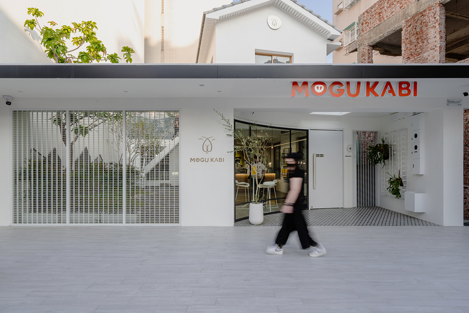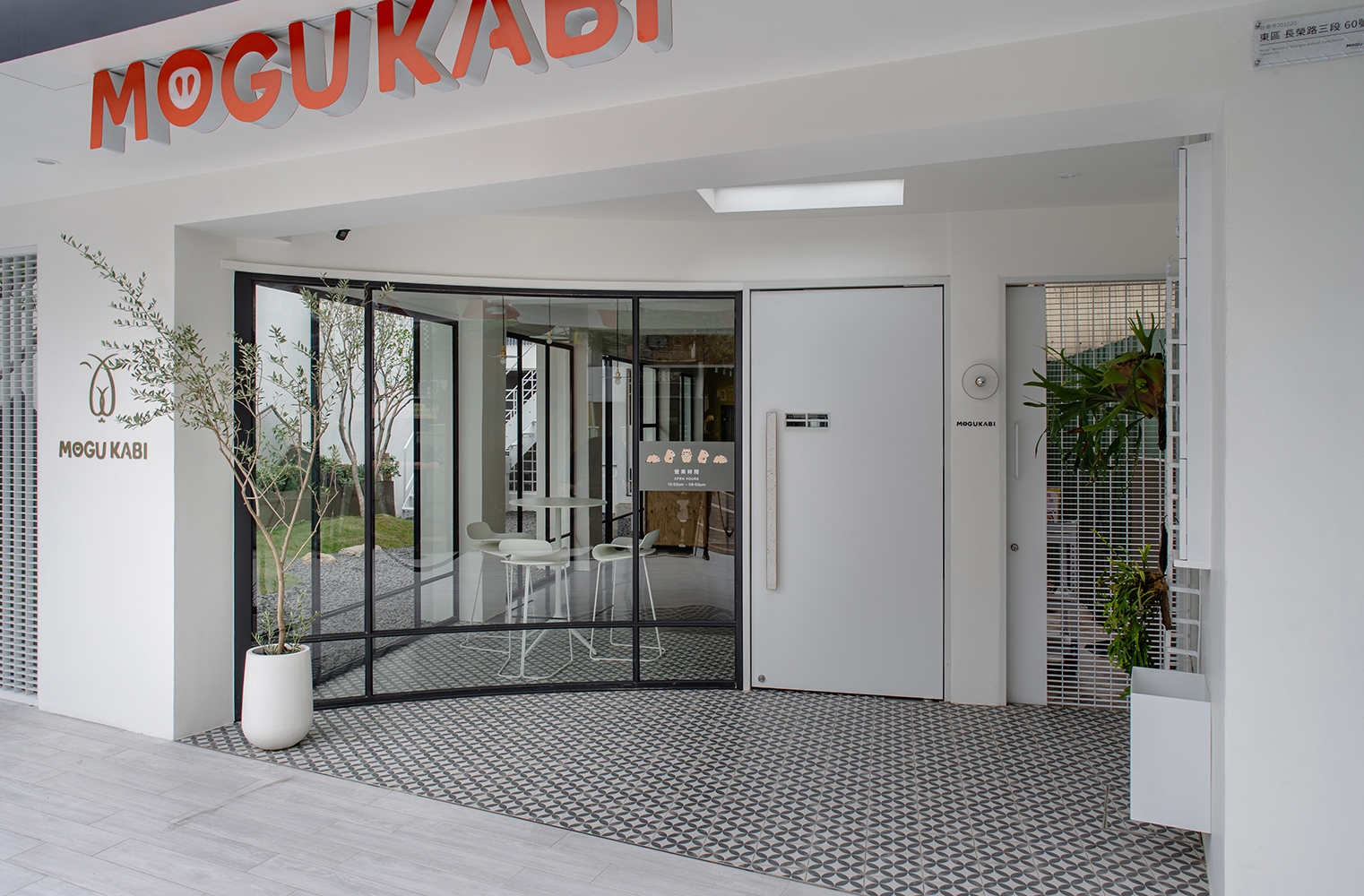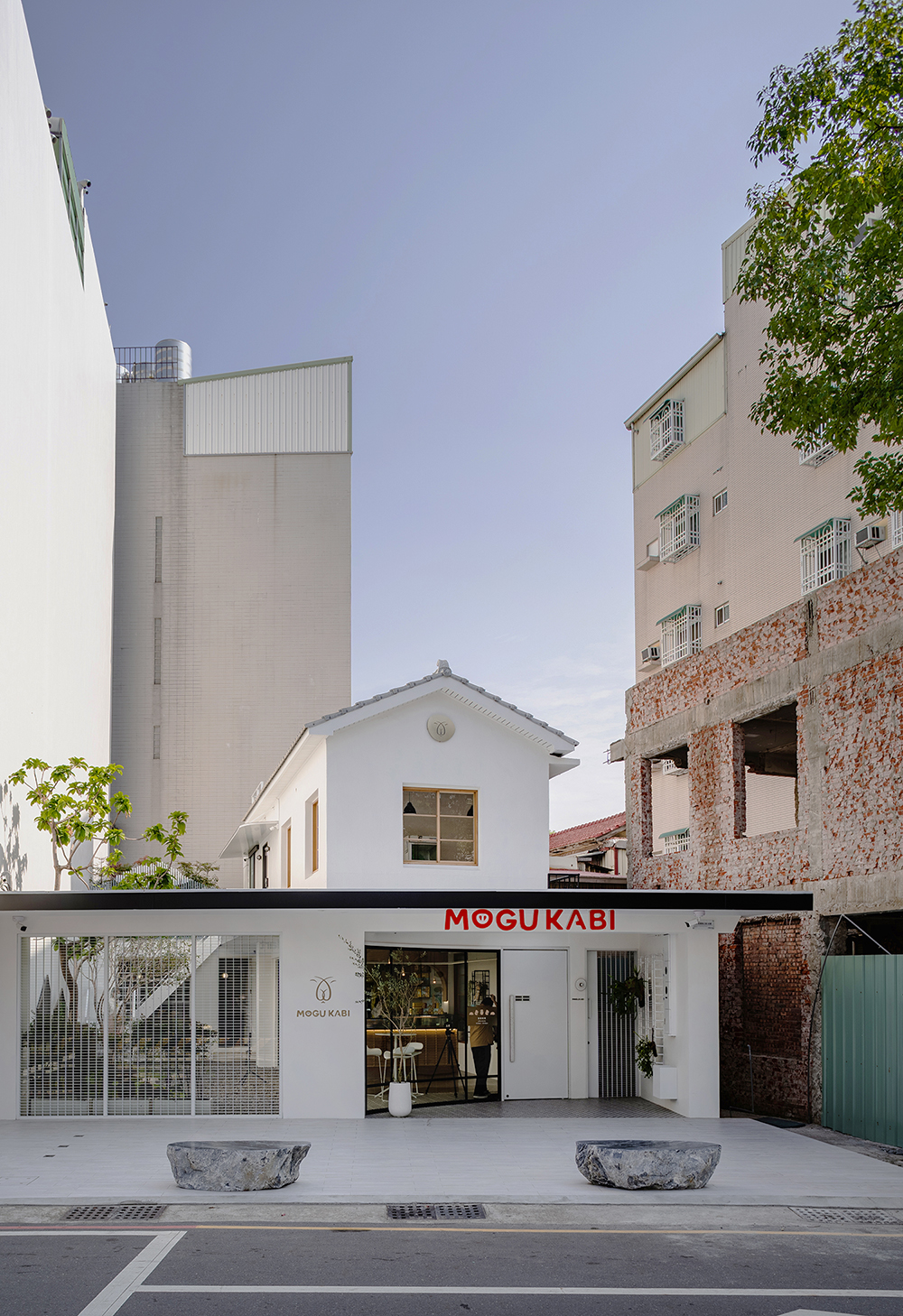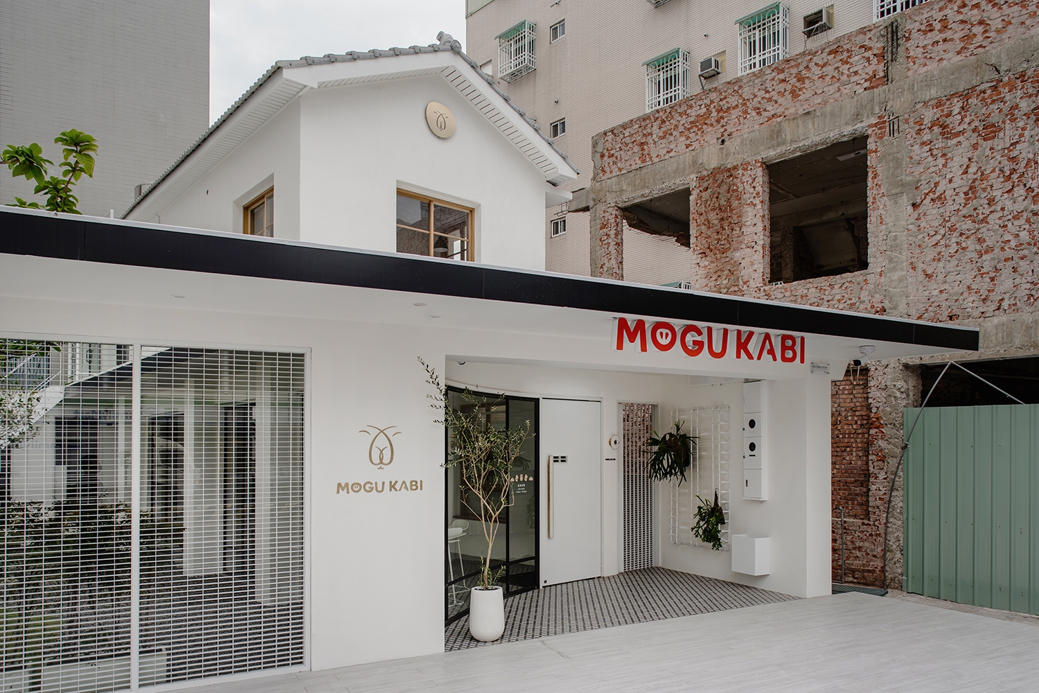 MOGU KABI 的建築物原為 40 年屋齡的混泥土磚造老屋,白色基底的建築體,走進裡頭則能感受到室內簡潔大方的氛圍,配合低裝飾性的設計與局部點綴黃銅飾品,使原有老屋的輪廓注入新的靈魂。