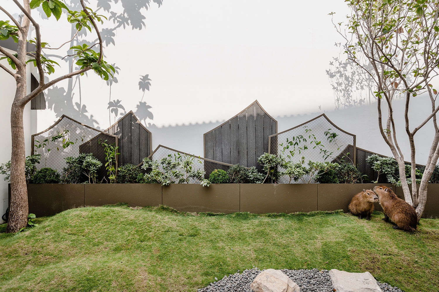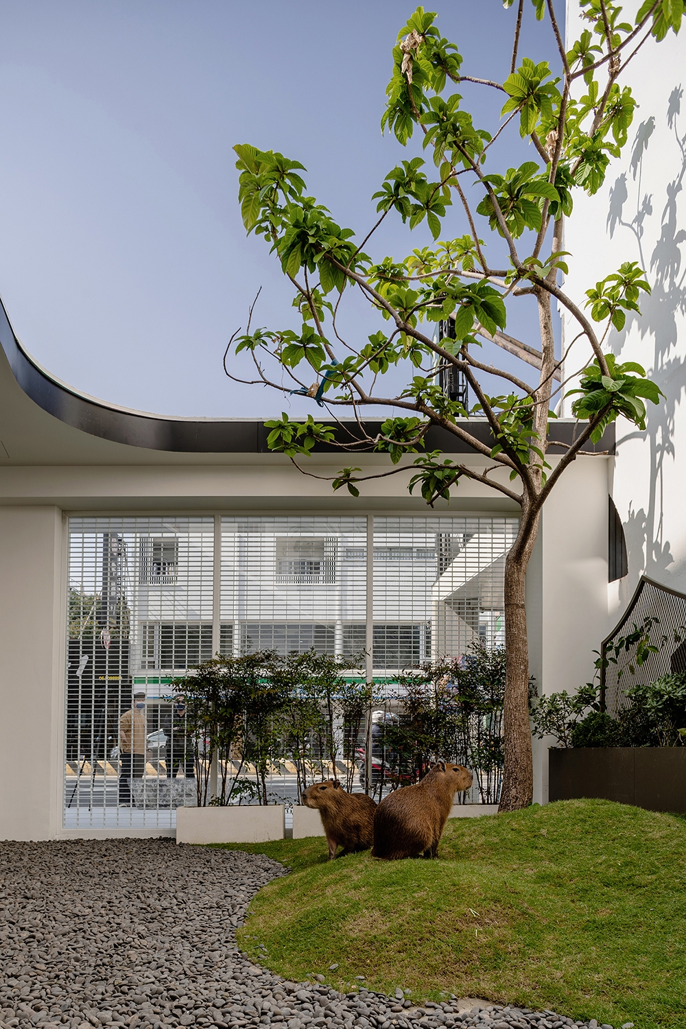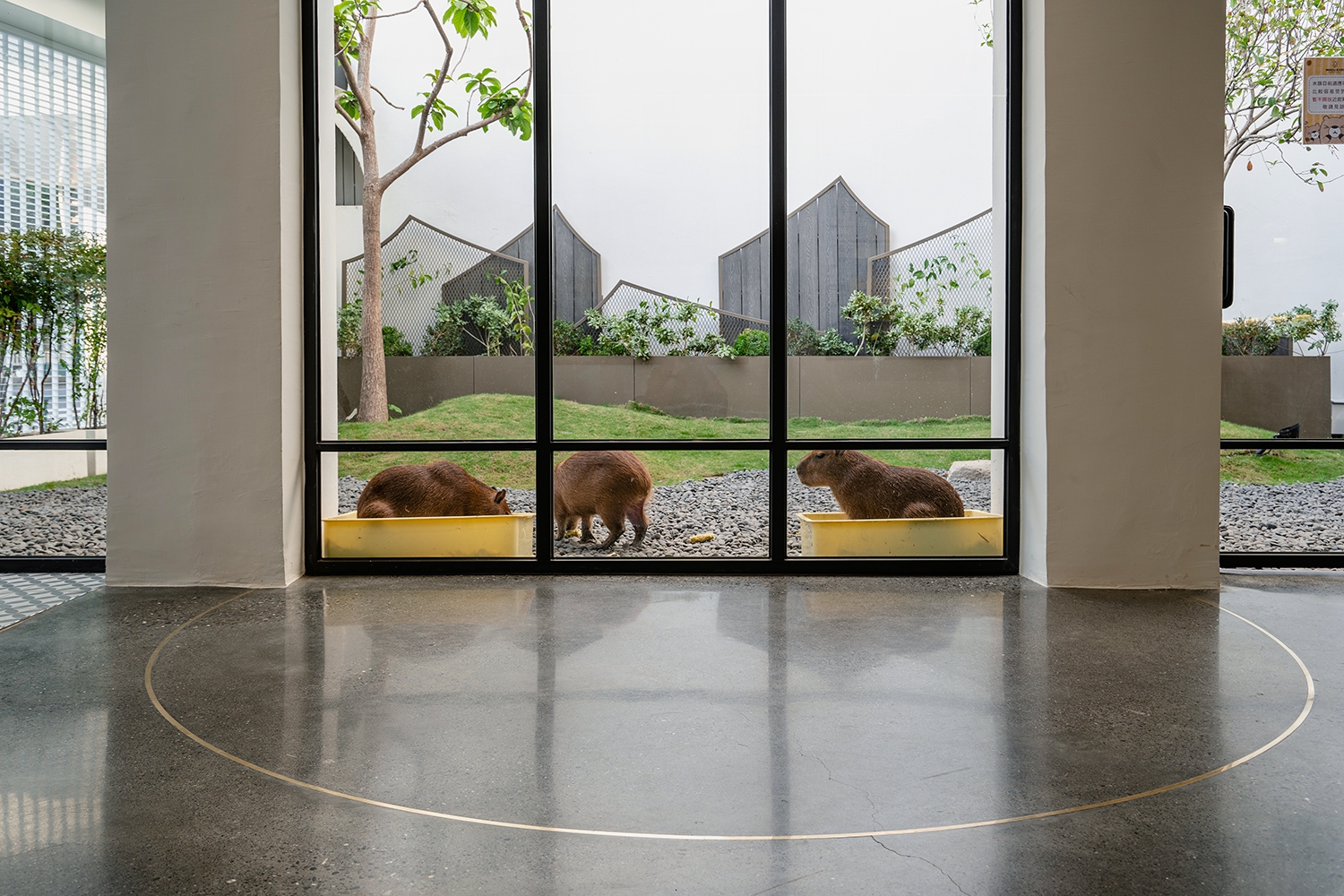 配合老屋裡花窗上的長型格所穿透的光影,再結合水豚大多時間都浸泡在水池中的生物特徵,空間地板分割以水波漣漪的弧線呼應水豚的生長環境。