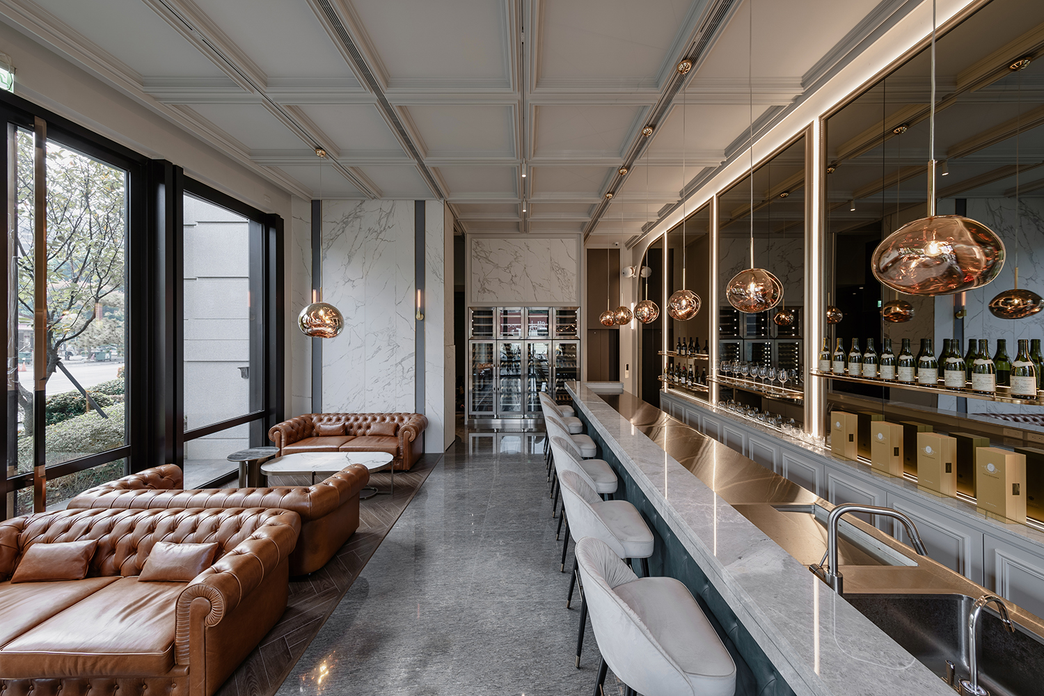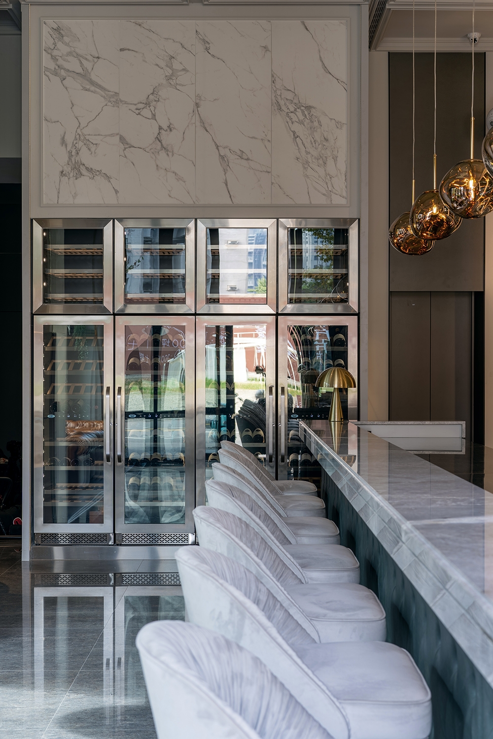 一進入到 CRU cave a vin,映入眼簾的便是 Divin 紅酒冰箱,因一樓空間挑高,原先的紅酒冰箱高度僅有 175cm,視覺感相對不足,因此我們在上方空間多增加一排不鏽鋼紅酒收納櫃,讓整體視覺拉長,而上方則以磁磚大板搭配,帶出視覺焦點。