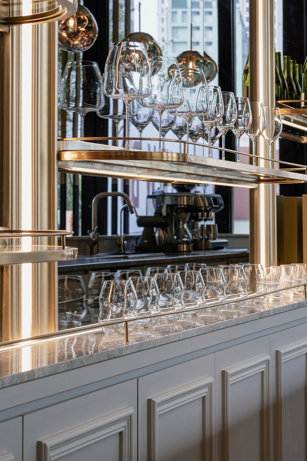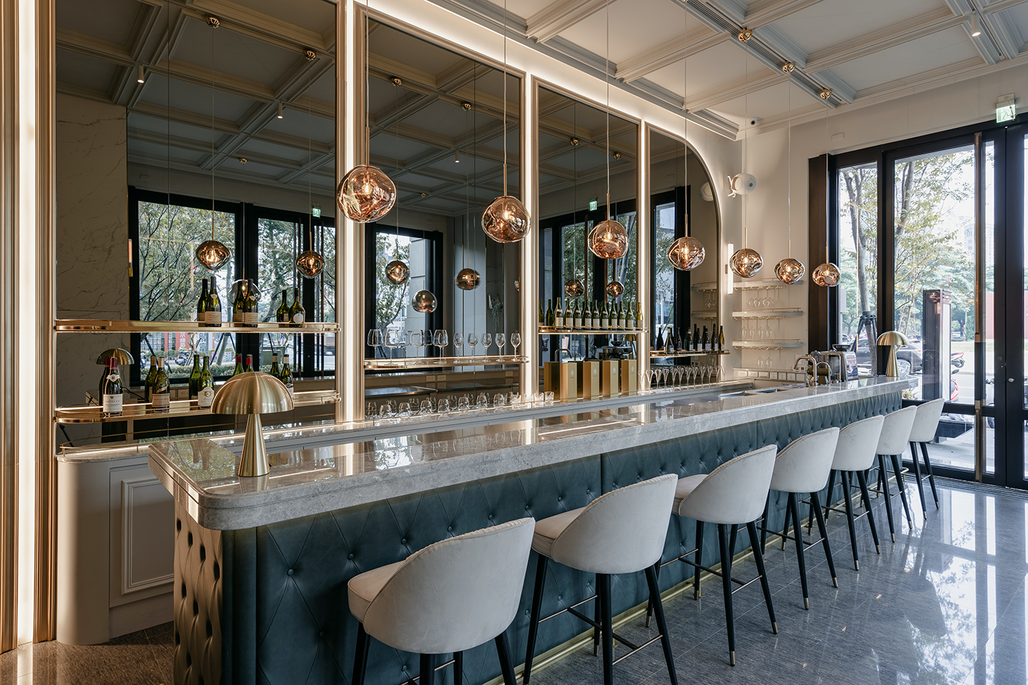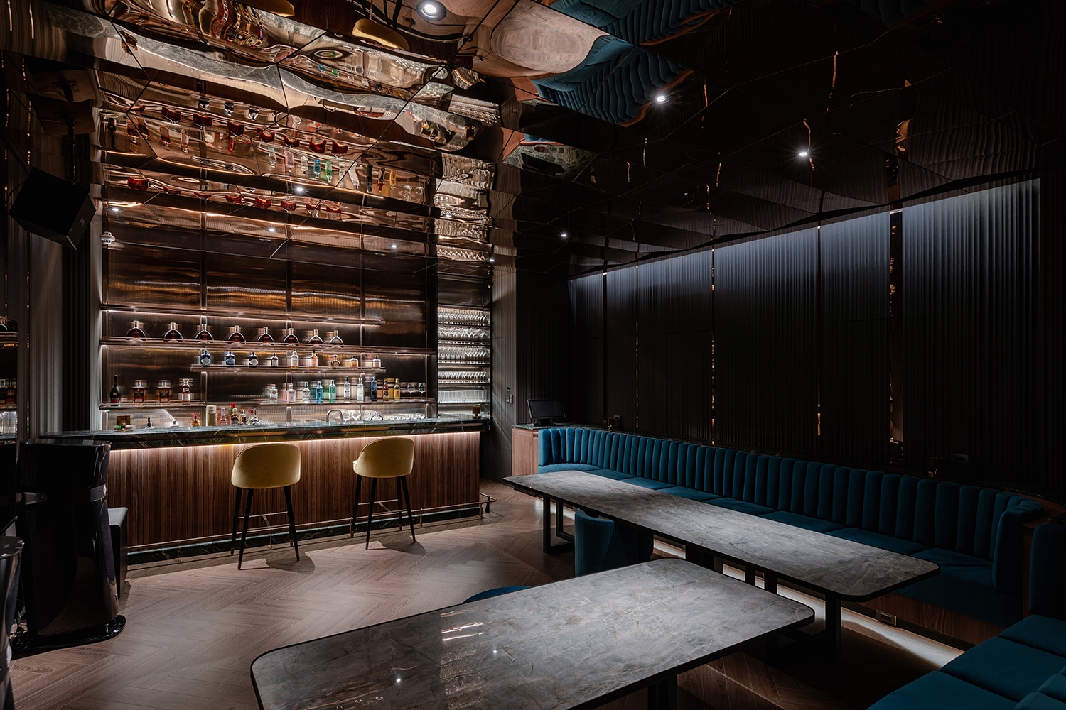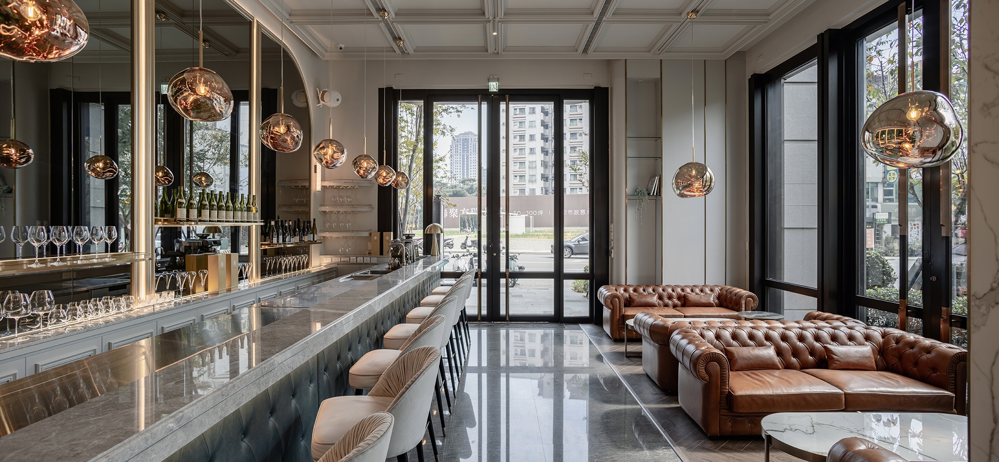 吧檯主牆運用大面烤漆線板鏡框搭配灰鏡,除了可以反射室內空間物件,像是酒瓶酒杯及吊燈提升精緻度外,連帶反射室外造景區,讓空間添加綠意,達到舒適放鬆之感,而鍍鈦金鐵件展示架搭配光線的漫射為空間帶來高級感,使酒牆區有豐富精緻的整體效果。