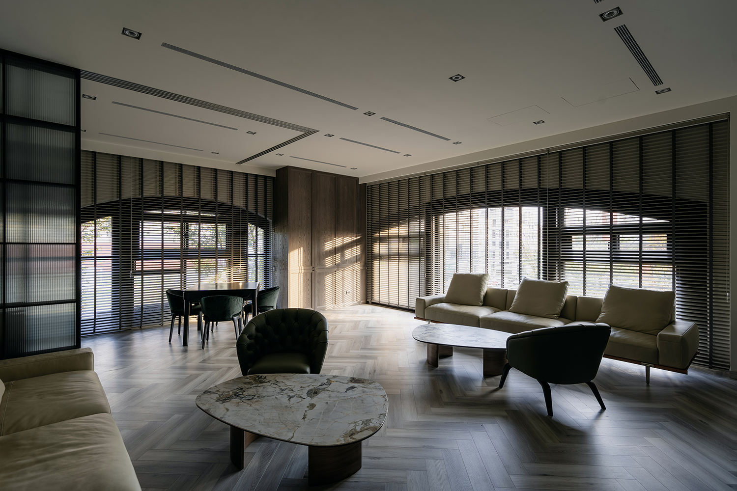 兩側窗戶部分則加裝淺灰色木質百葉簾,使陽光灑落室內時,多了活潑感。