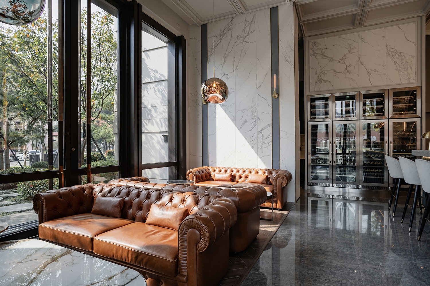 沙發座位區的底牆則以石紋磁磚大板搭配鍍鈦不銹鋼收邊條,及布紋壁紙搭配分割,而磁磚大板則延伸至弧形轉角展示櫃並與紅酒冰箱上方聯貫,讓空間關聯性更緊密。