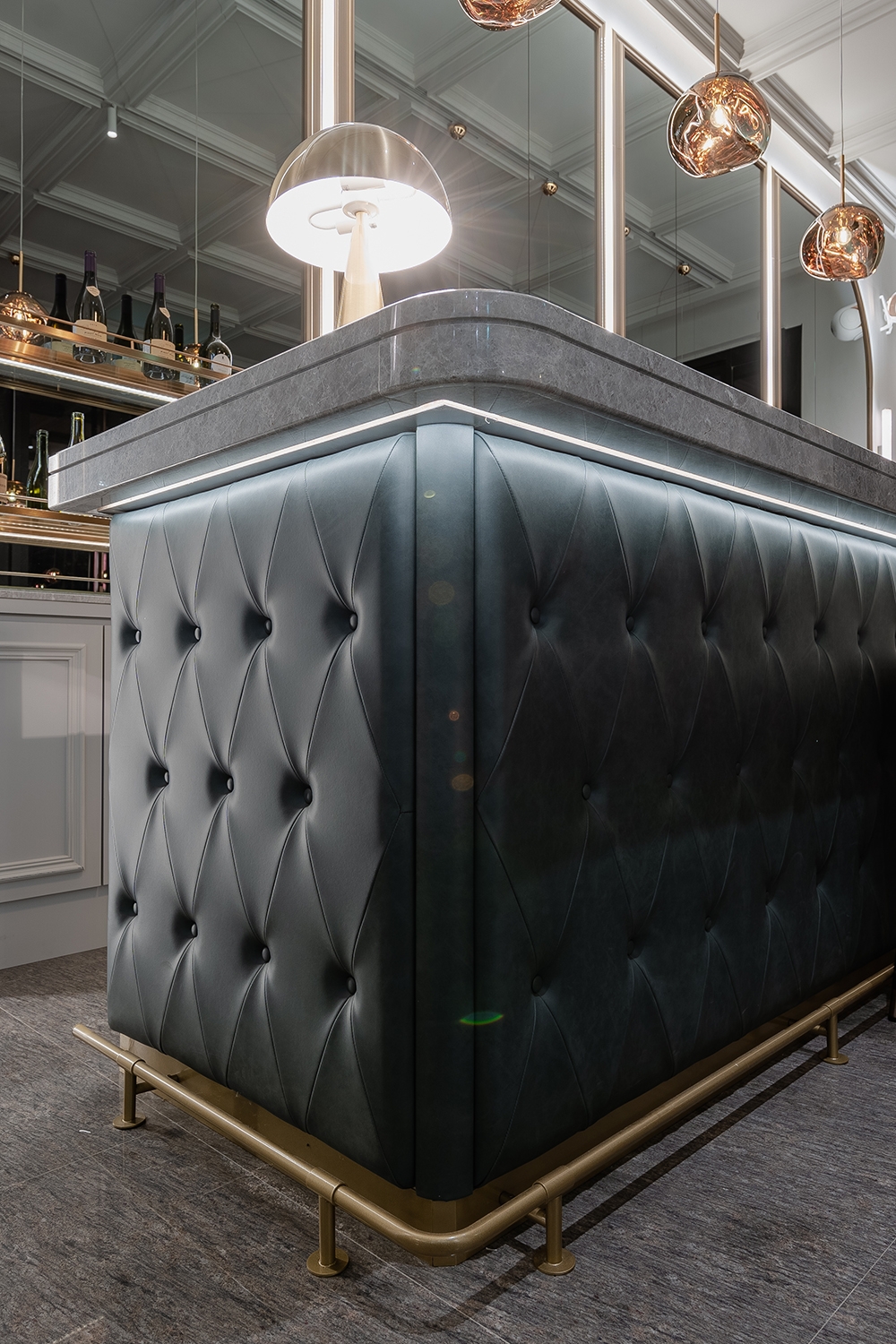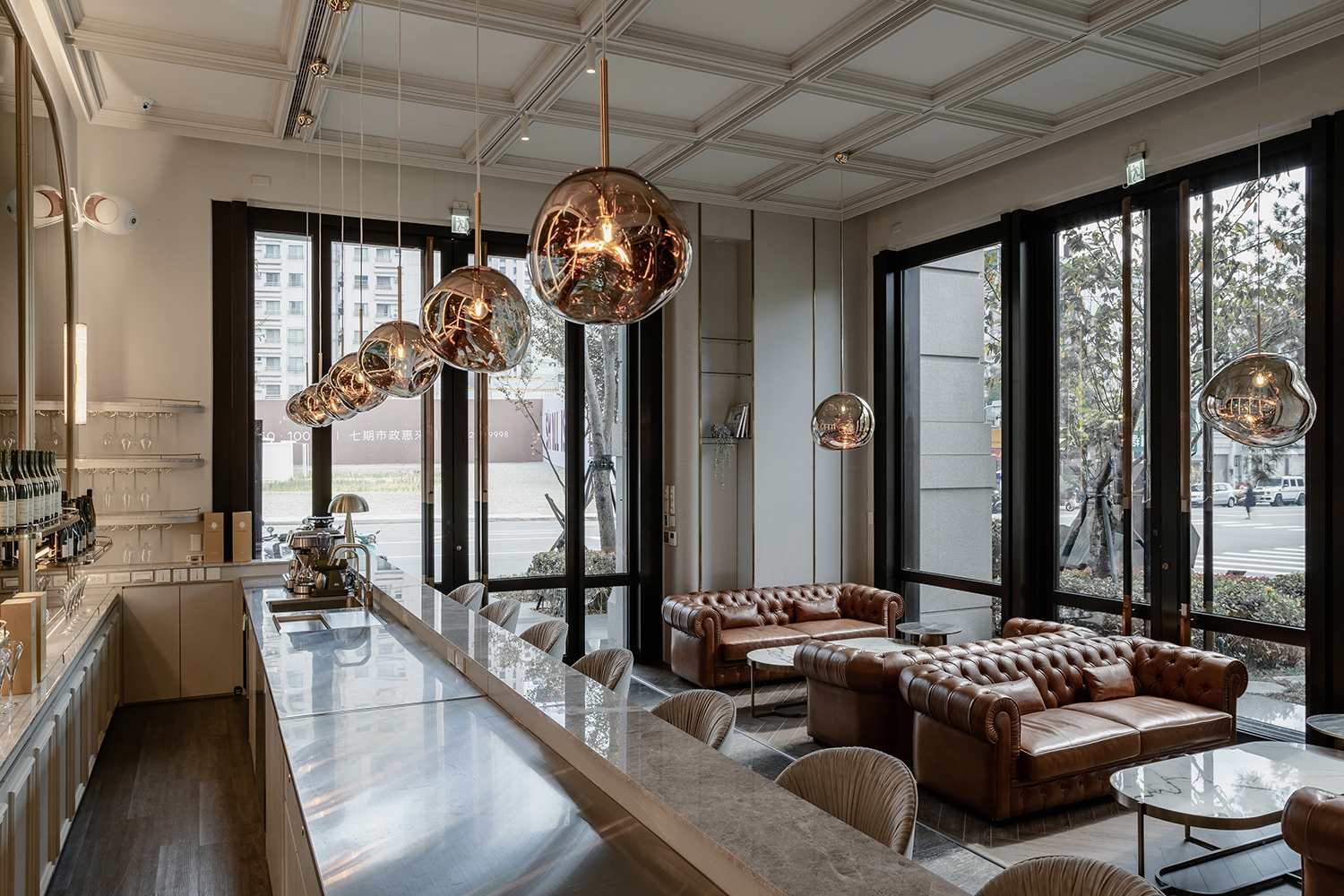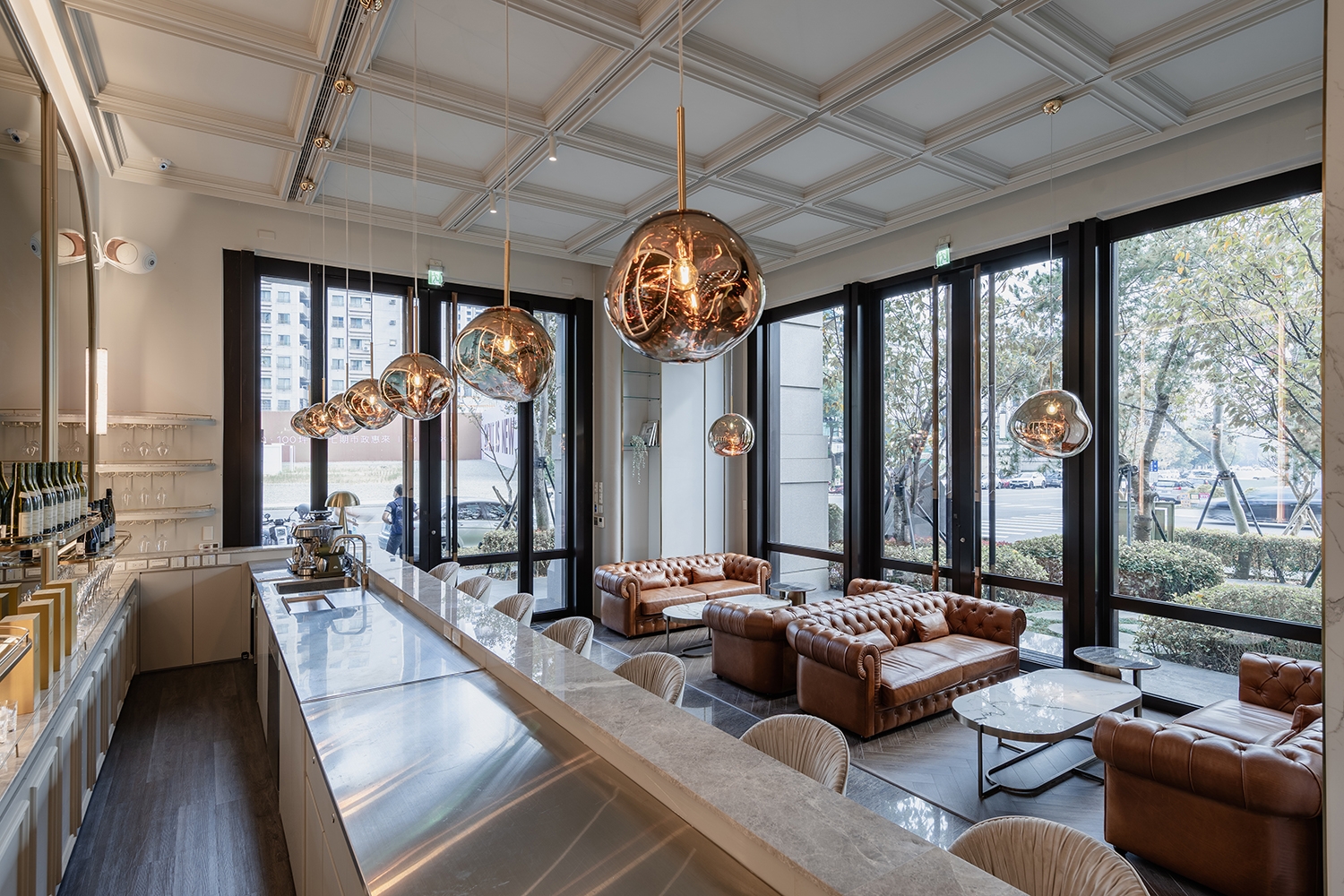 吧檯座位區由入口延伸至冰箱區,長型走向拉長視覺感。灰白大理石長桌,搭配沈穩的深綠色皮革拉扣以及鐵件烤漆基座為主體,並置入進口熔岩吊燈,使空間的完整度更升級。