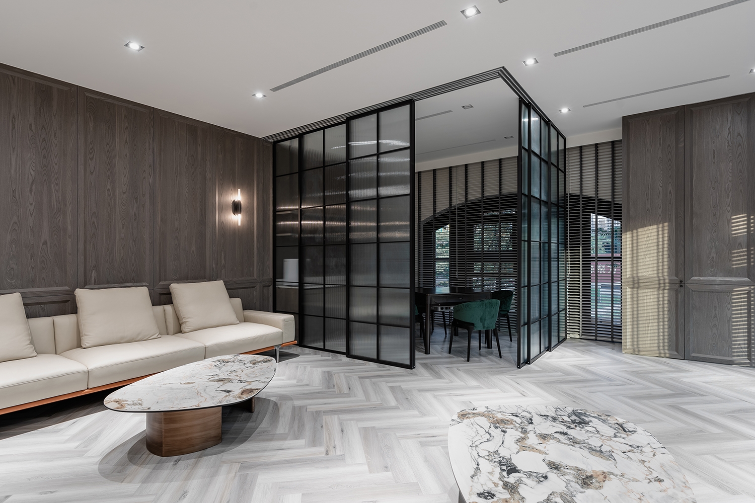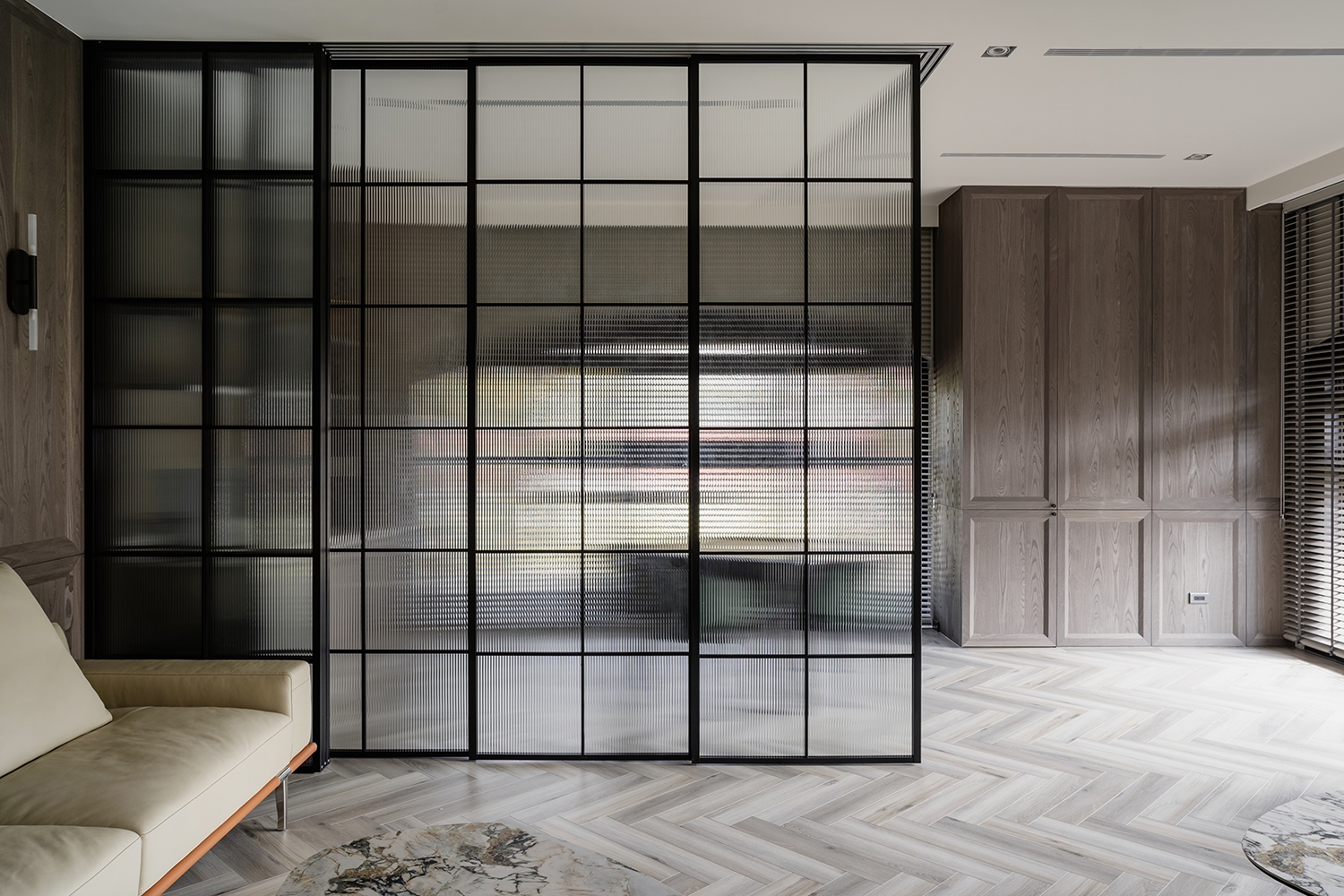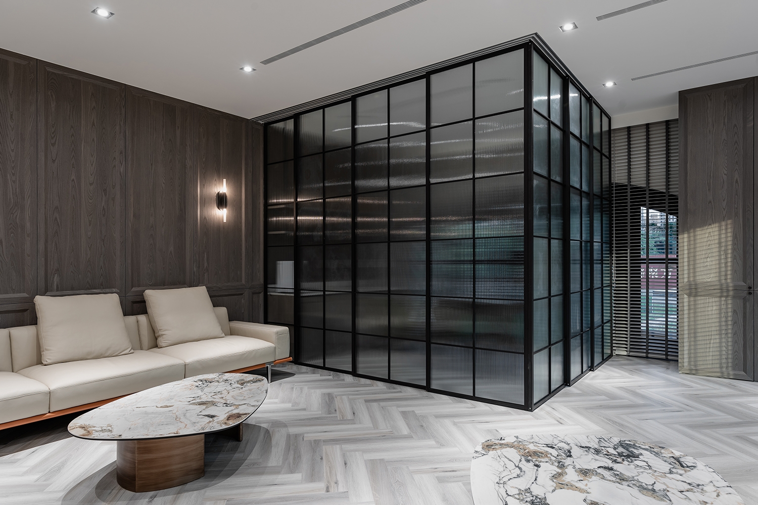 茶水區空間規劃活動式L型屏風滑門,以單片固定搭配三軌連動式,以及三軌萬向滑門,當空間使用需封閉時,則全數拉出,當空間需開放時,則全數收在茶水櫃旁,當作分隔沙發的造型屏風,並利用黑框加長虹玻璃達到半穿透之效果。