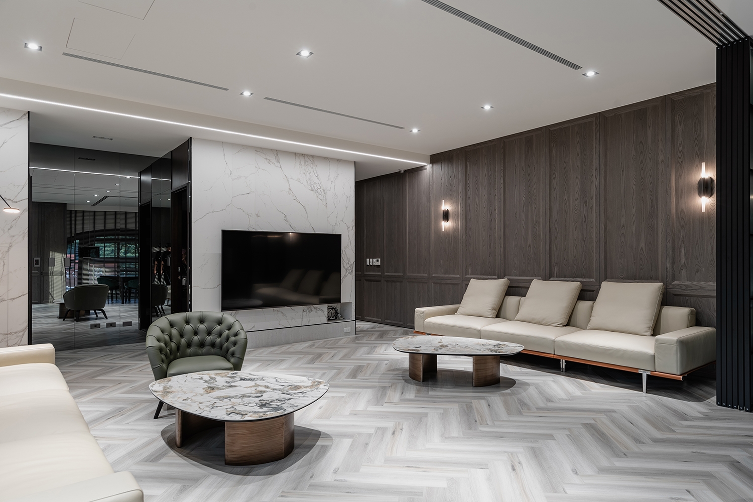整體空間的氛圍以精緻、品味、尊榮為設計主軸,運用鍍鈦鐵件、灰鏡、磁磚大板,搭配天花板框架線板造型,提升整體豐富度。