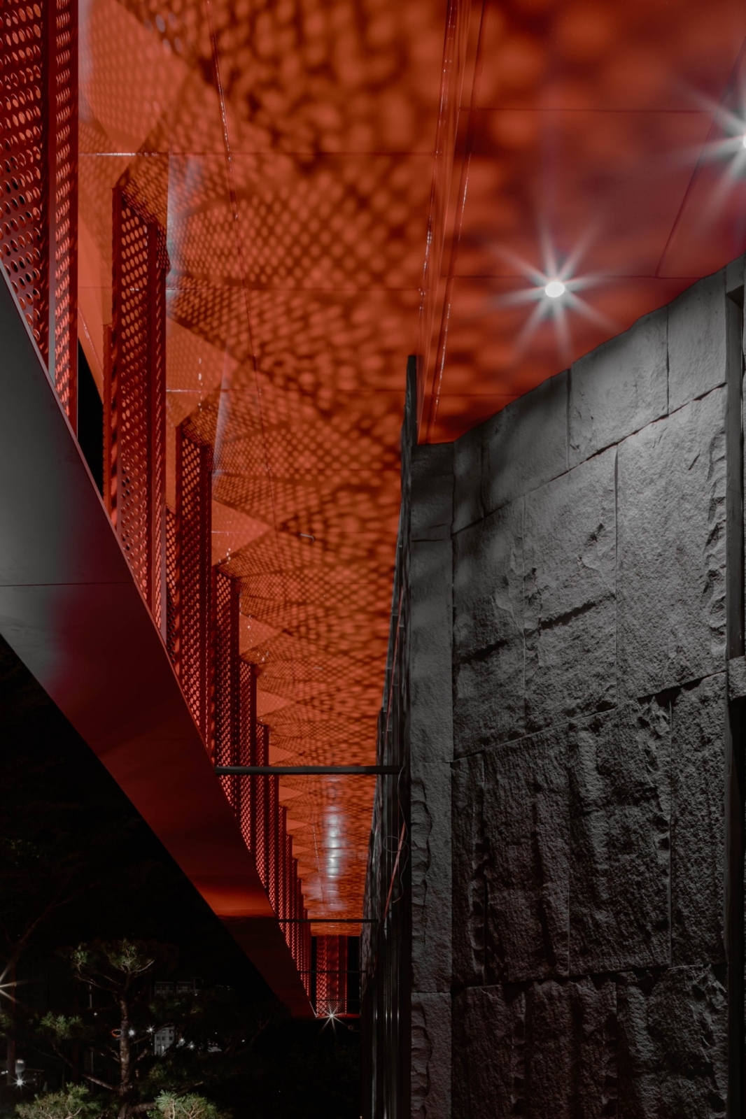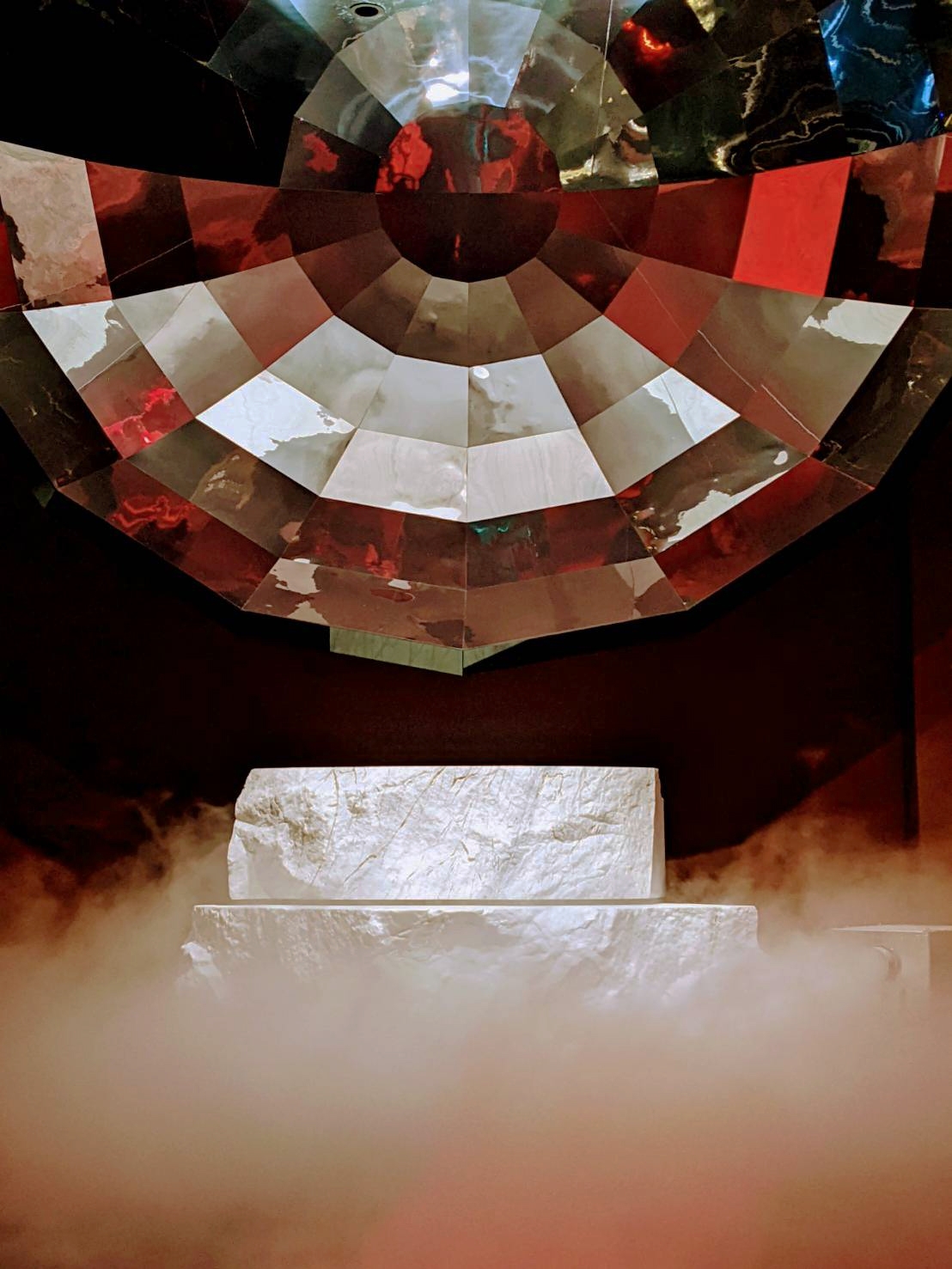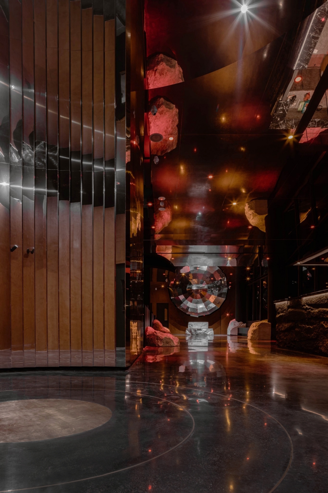 室內主要走道兩側繚繞著水霧,在整體偏暗色系的空間之中不僅呼應著岩漿熱氣的主題,更為環境抹上一層仙境感。