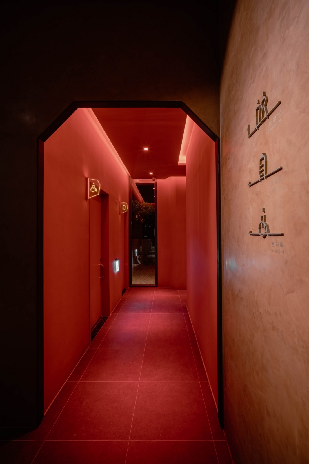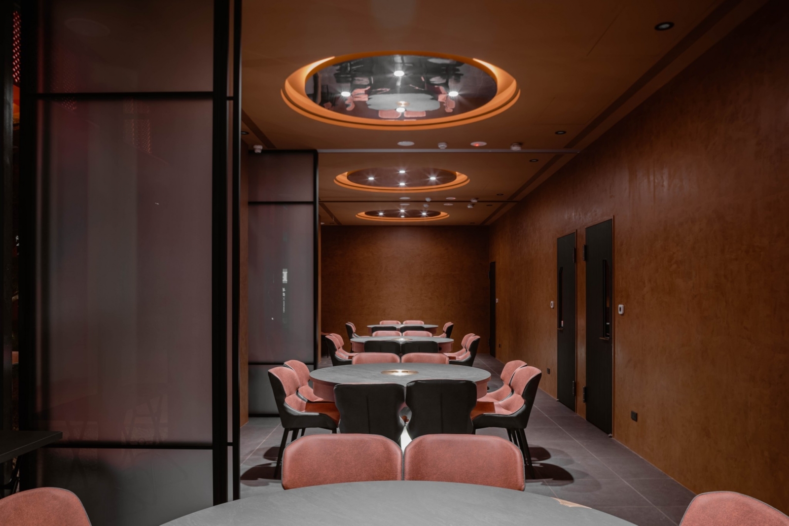 遠處放置超大如鑽石的端景搭配兩旁白色原石,也為創造出帶點中式、古老的神秘氛圍,更藉由紅色燈光的輔助和座位區上方佈滿的大量光球群,形成一種既開闊又相當精緻的視覺效果,讓客人彷彿置身在有滿點星光的藝廊,而非一般的鍋物店之中,成為台中新興的食尚代表。