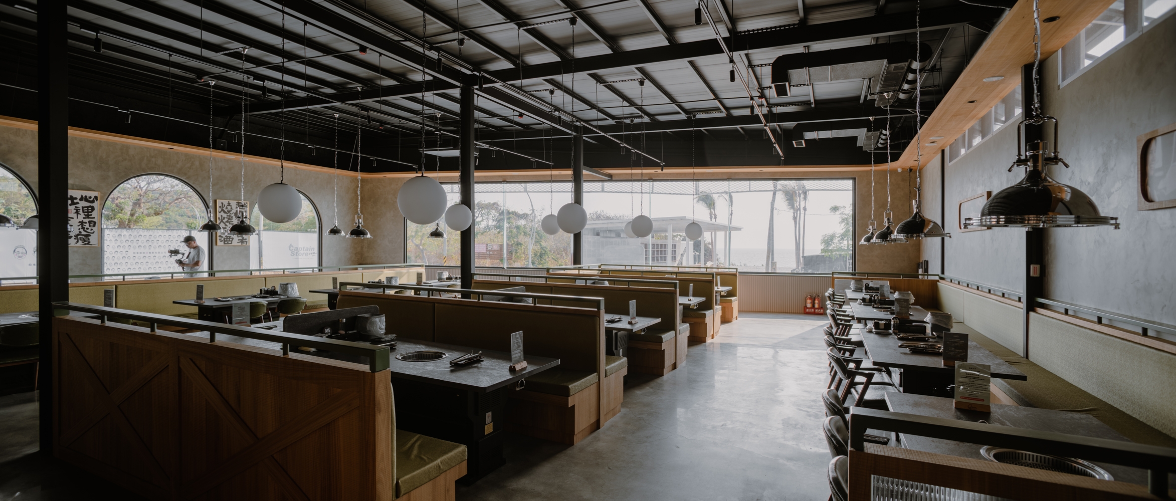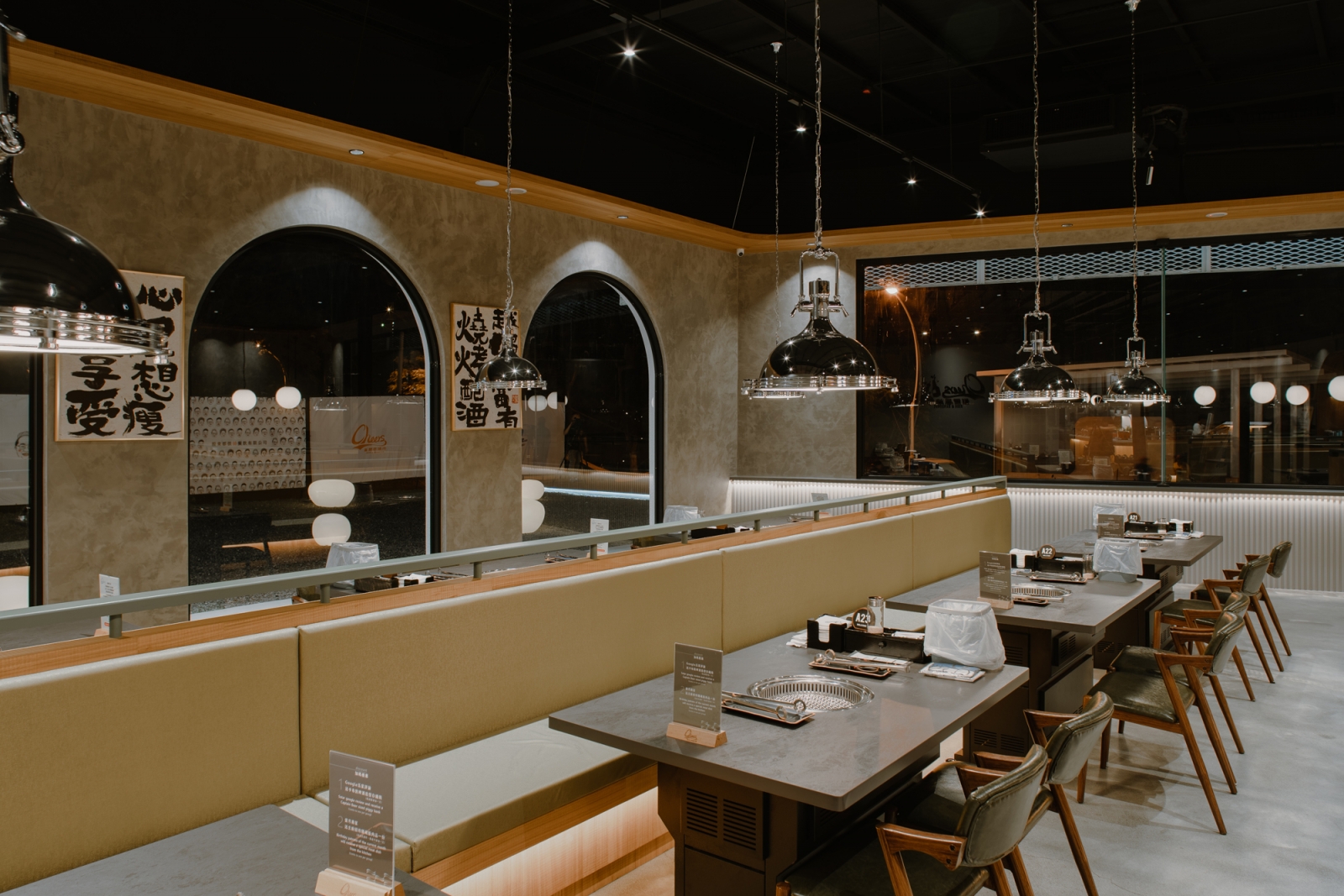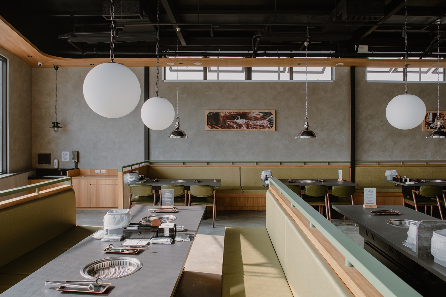 在空間設計上,我們將烤肉區視為重點。原本計劃設置一個戶外烤肉區,但由於周圍已經有許多類似的戶外自助烤肉店,為了與眾不同,且在下雨天也能營業,我們將烤肉區改為室內用餐區。空間動線以中間的自助吧為中心,並劃分出上下座位區,使取餐過程更加順暢。