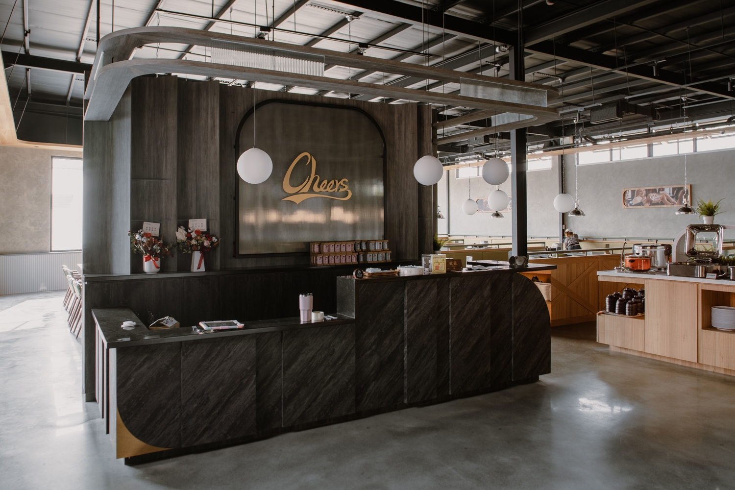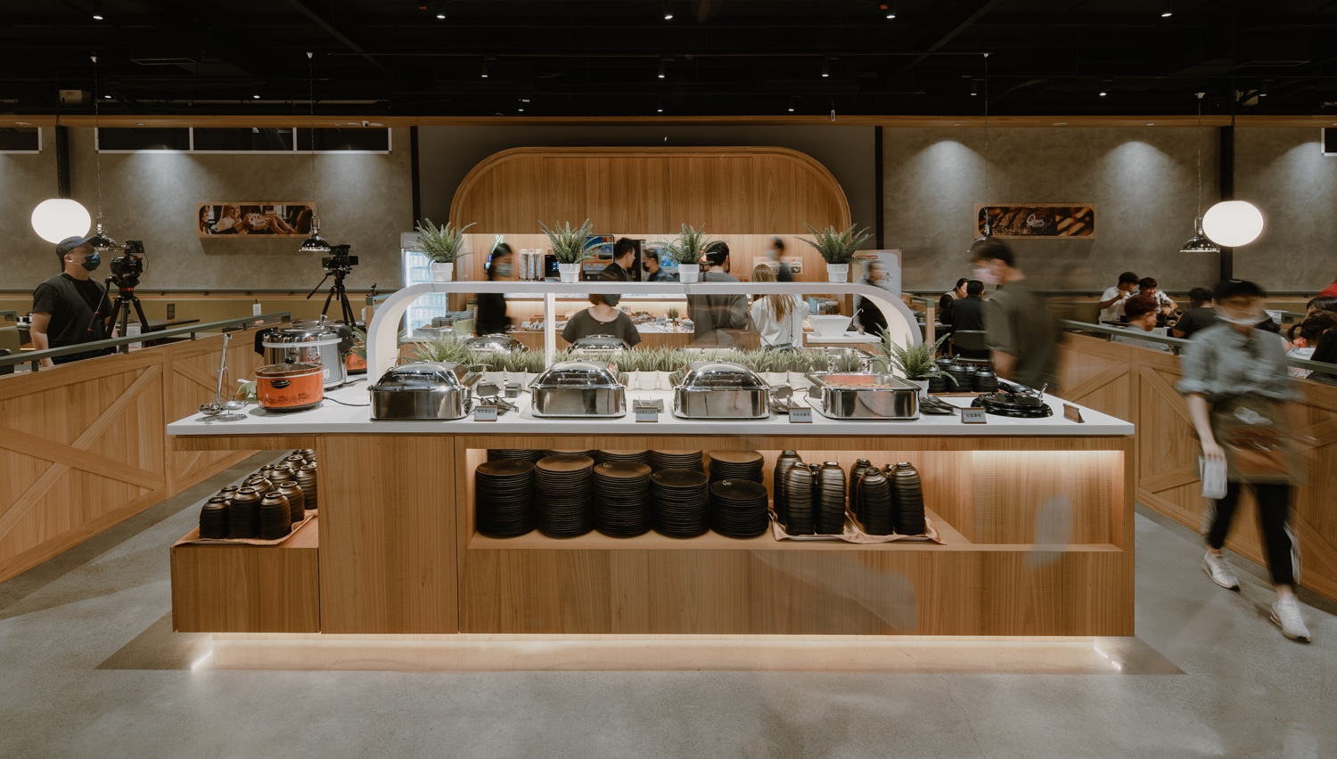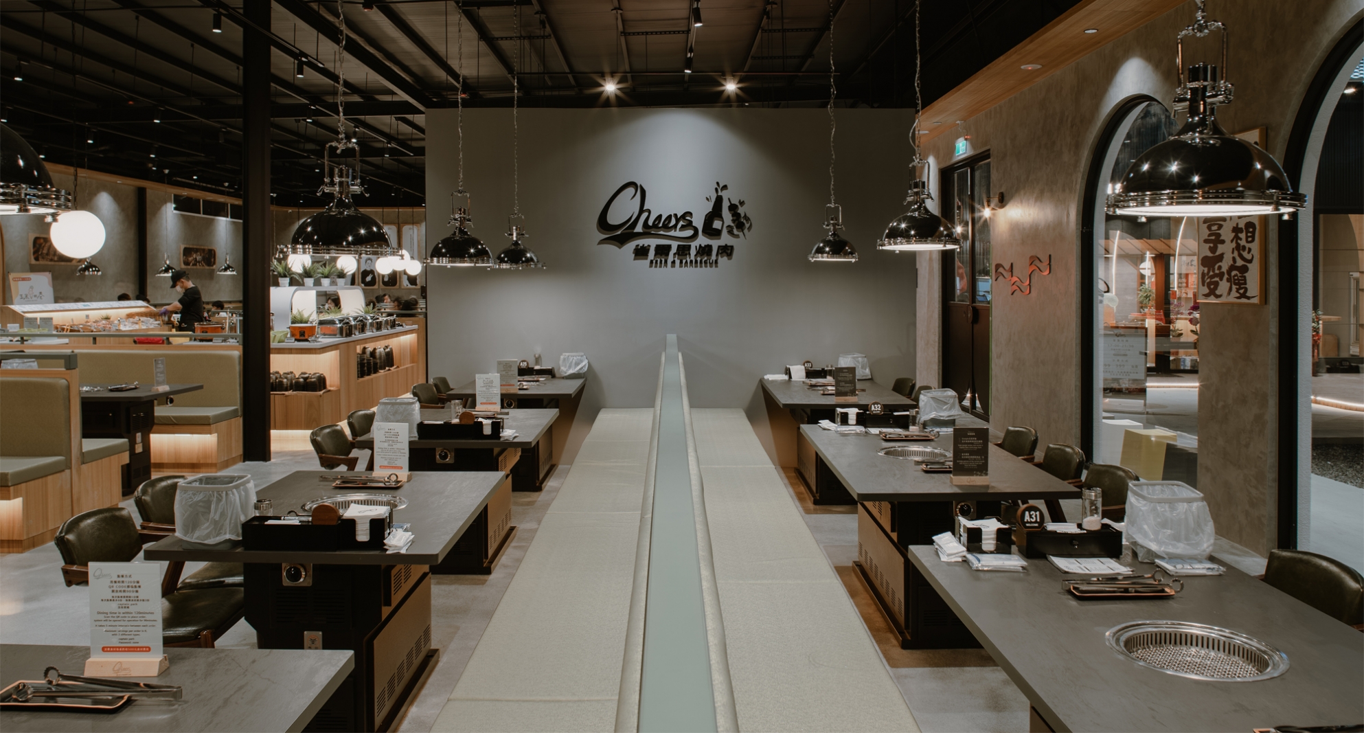 在空間設計上,我們將烤肉區視為重點。原本計劃設置一個戶外烤肉區,但由於周圍已經有許多類似的戶外自助烤肉店,為了與眾不同,且在下雨天也能營業,我們將烤肉區改為室內用餐區。空間動線以中間的自助吧為中心,並劃分出上下座位區,使取餐過程更加順暢。