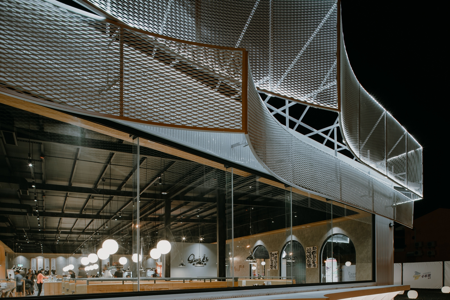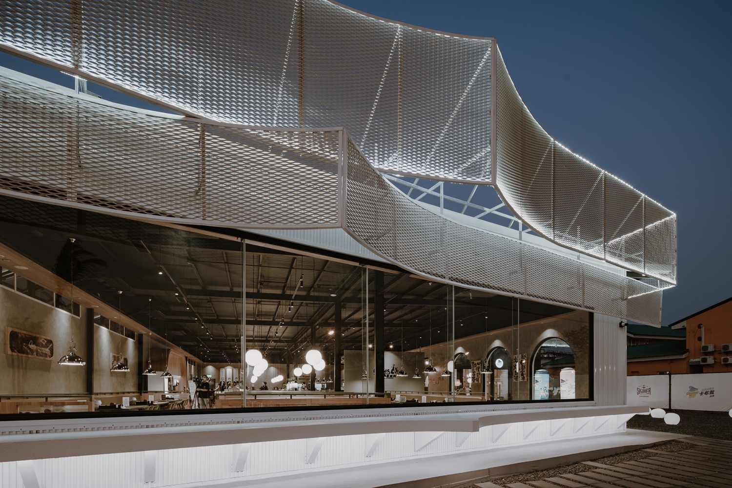 弧形擴張網像是海上漣漪般,陽光照射時,閃亮的折射效果宛如浪花般閃爍。這種穿透材料能有效抵擋海風的風壓。而輕盈的擴張網式鋁製材料,也常作為建築外觀的帷幕。