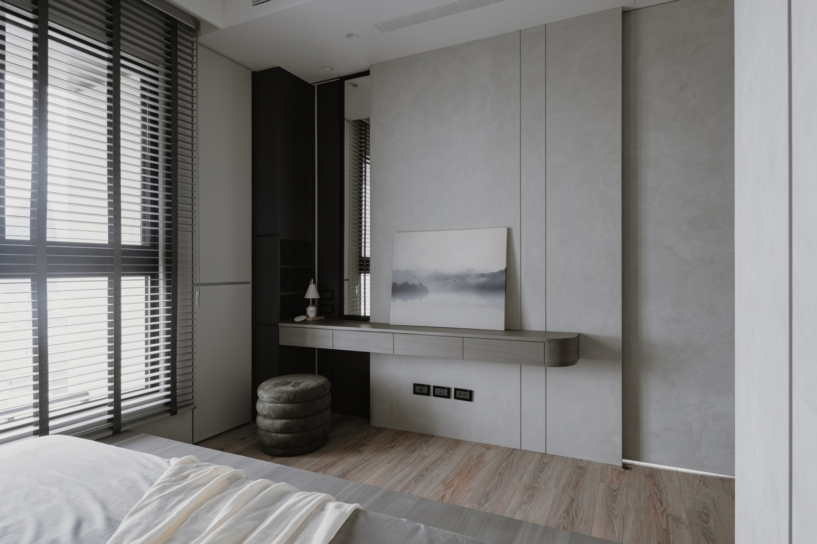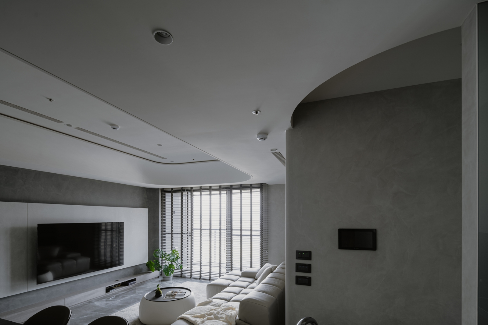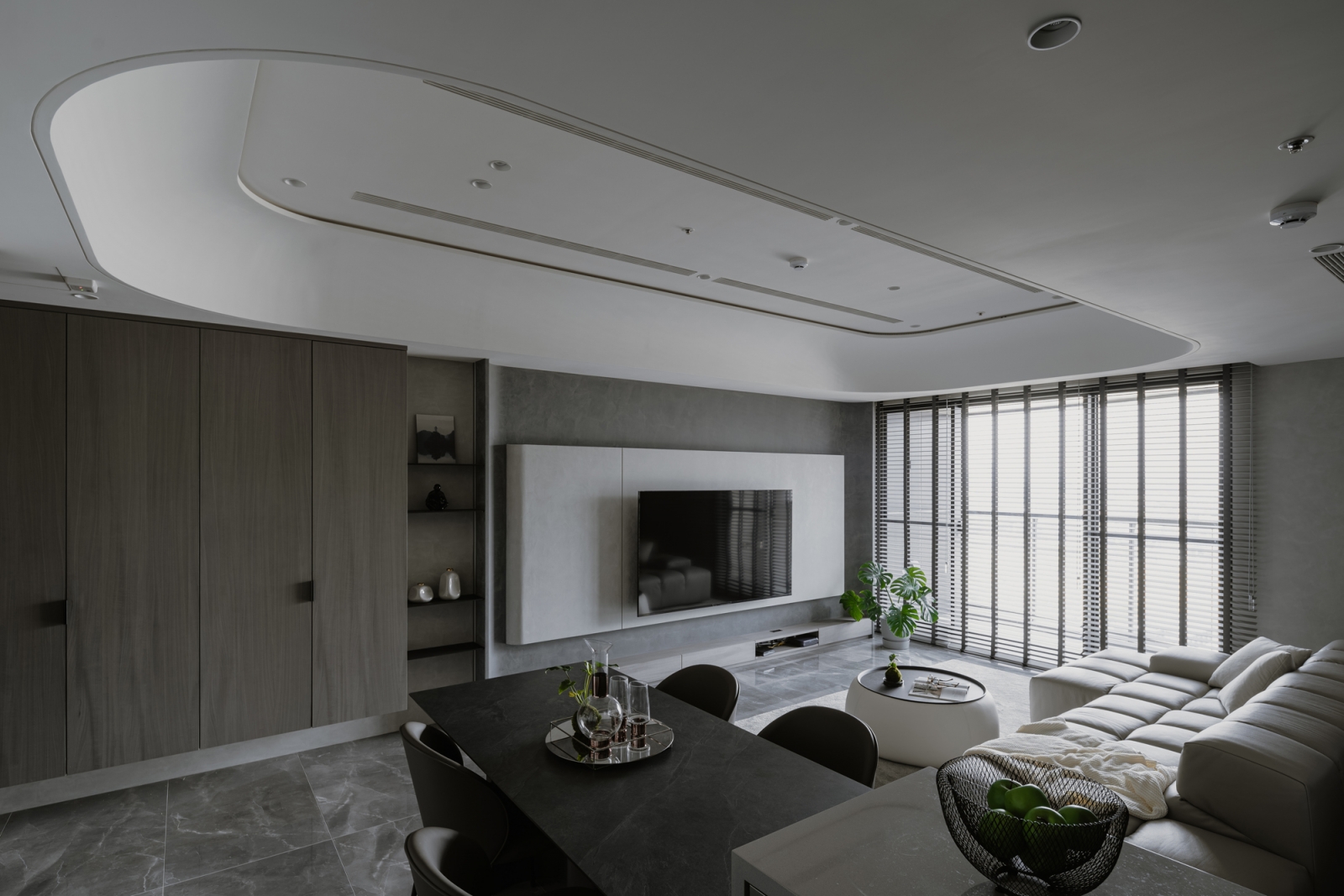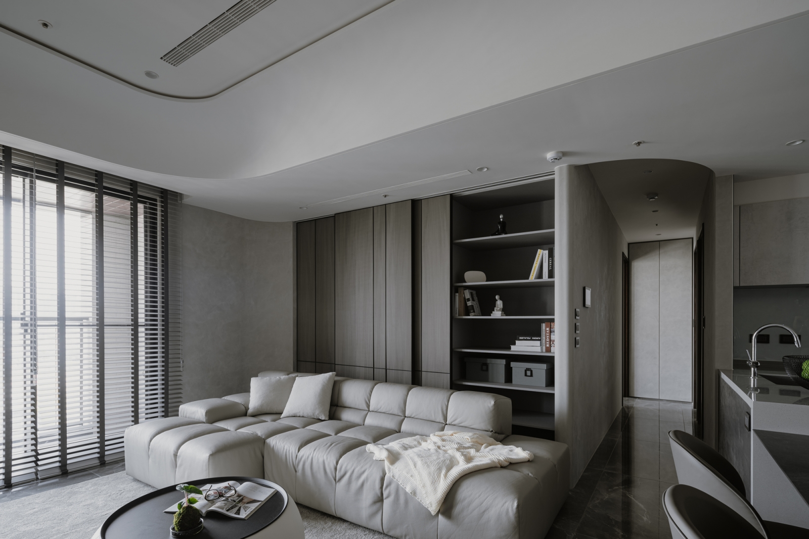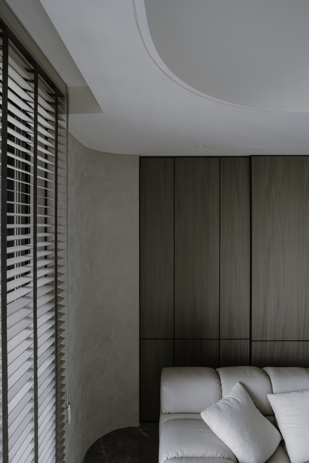 而整體空間風格以現代舒適為主,因原先在客變階段的選材,皆為灰白色系,因此在空間氣氛的營造,以大面淺色的特殊塗料為基底,搭配局部木皮櫃體增加空間的溫潤感,讓全家能聚集在一個放鬆舒適的空間內。